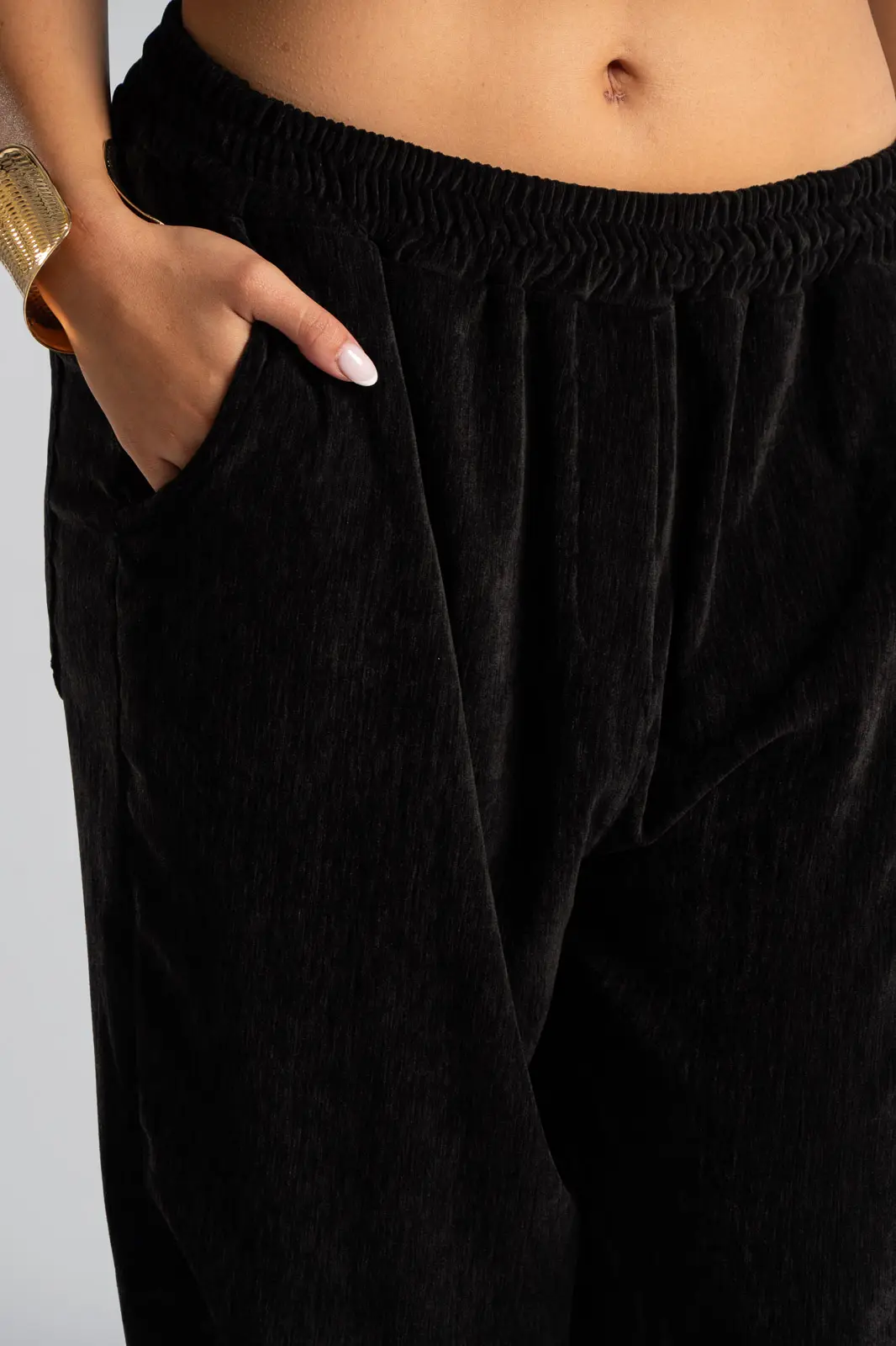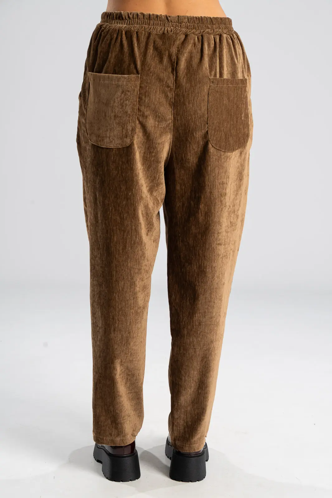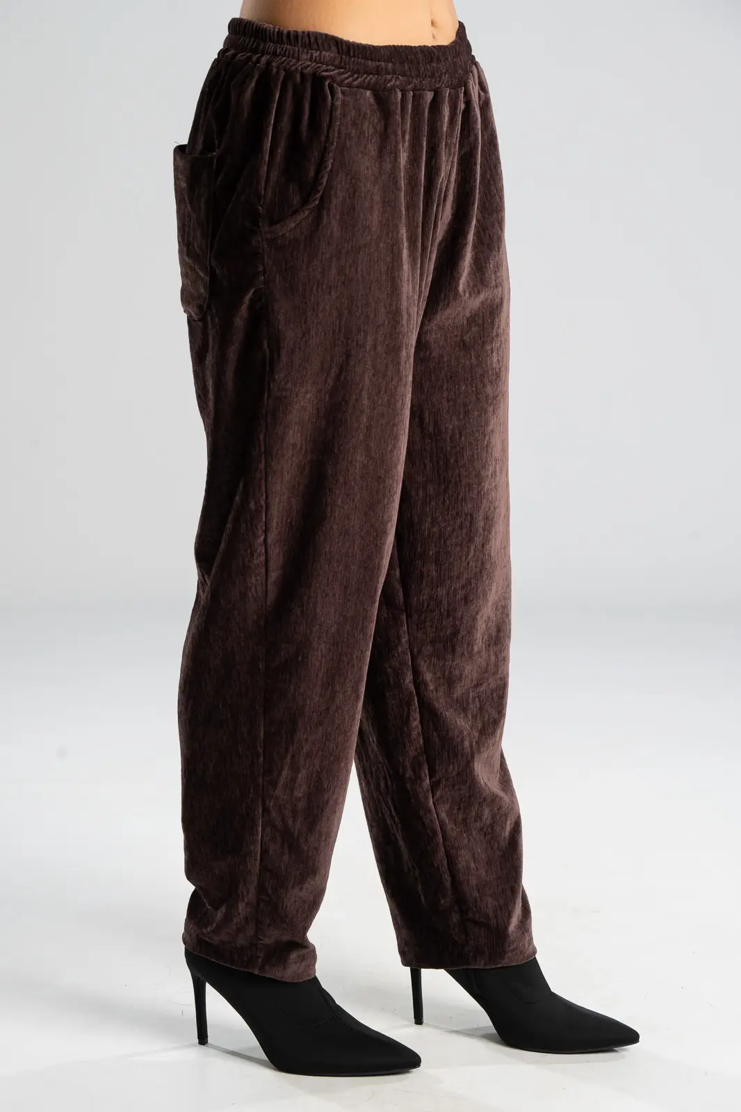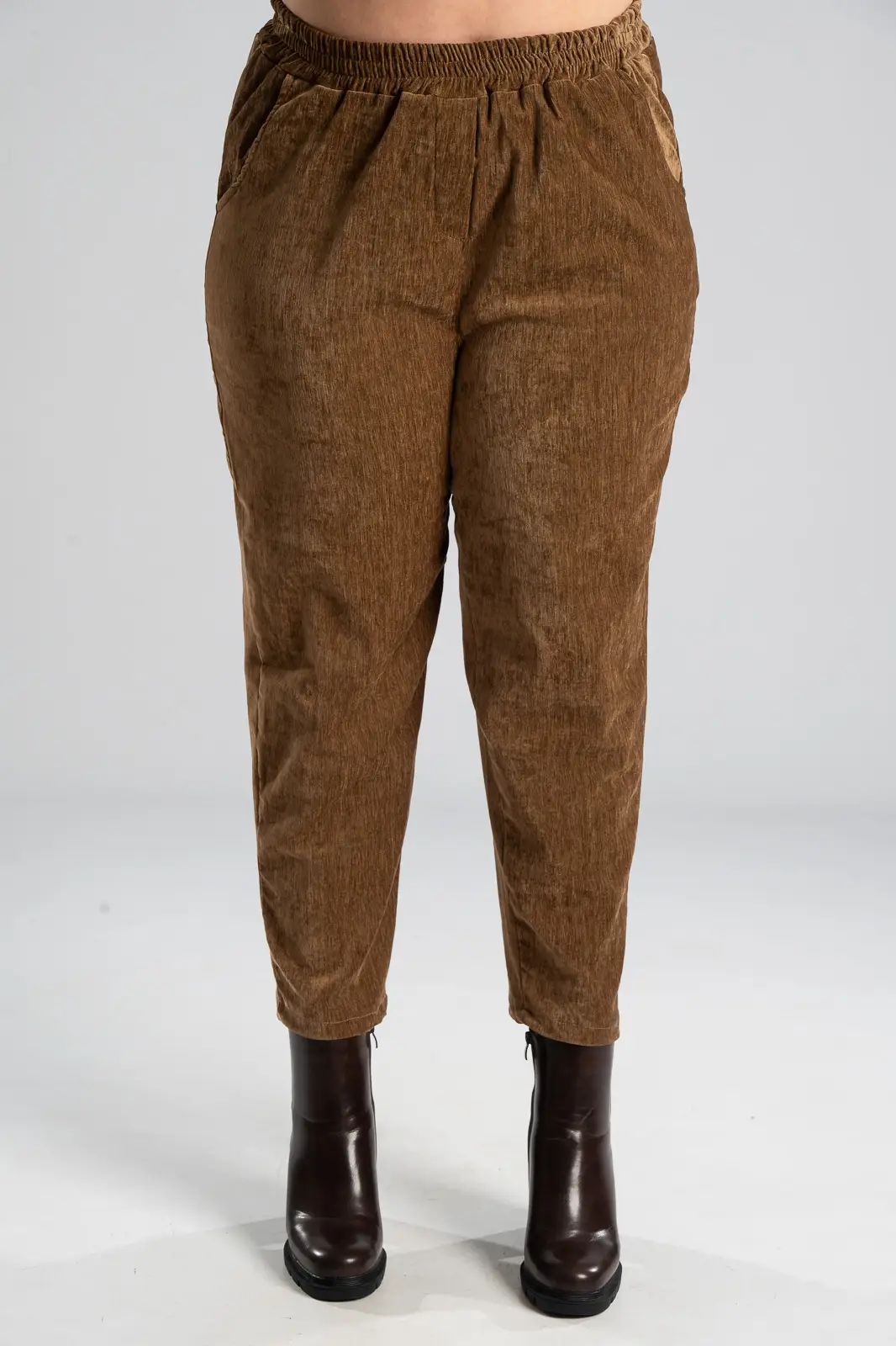 Παντελόνι velvet με λάστιχο περιμετρικά για καλύτερη εφαρμογή. Είναι σε ίσια γραμμή και το ύφασμα του είναι πολύ μαλακό. Στα πλαινά και στο πίσω μέρος έχει τσέπες. Οι μετρήσεις του πίνακα είναι αντιπροσωπευτικές για κάθε κωδικό. 96% polyester, 4% elastan.