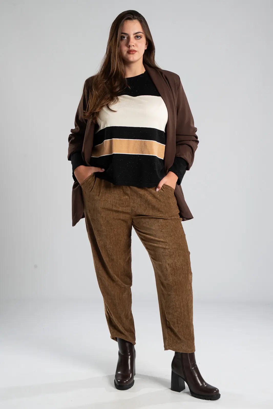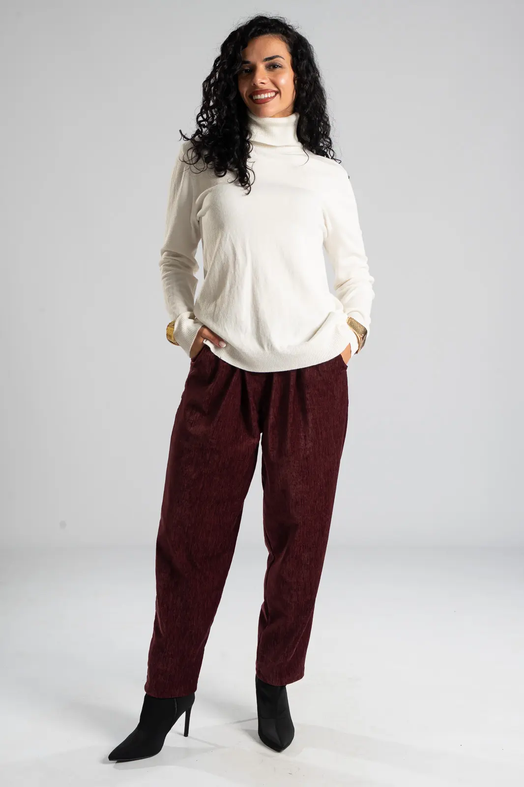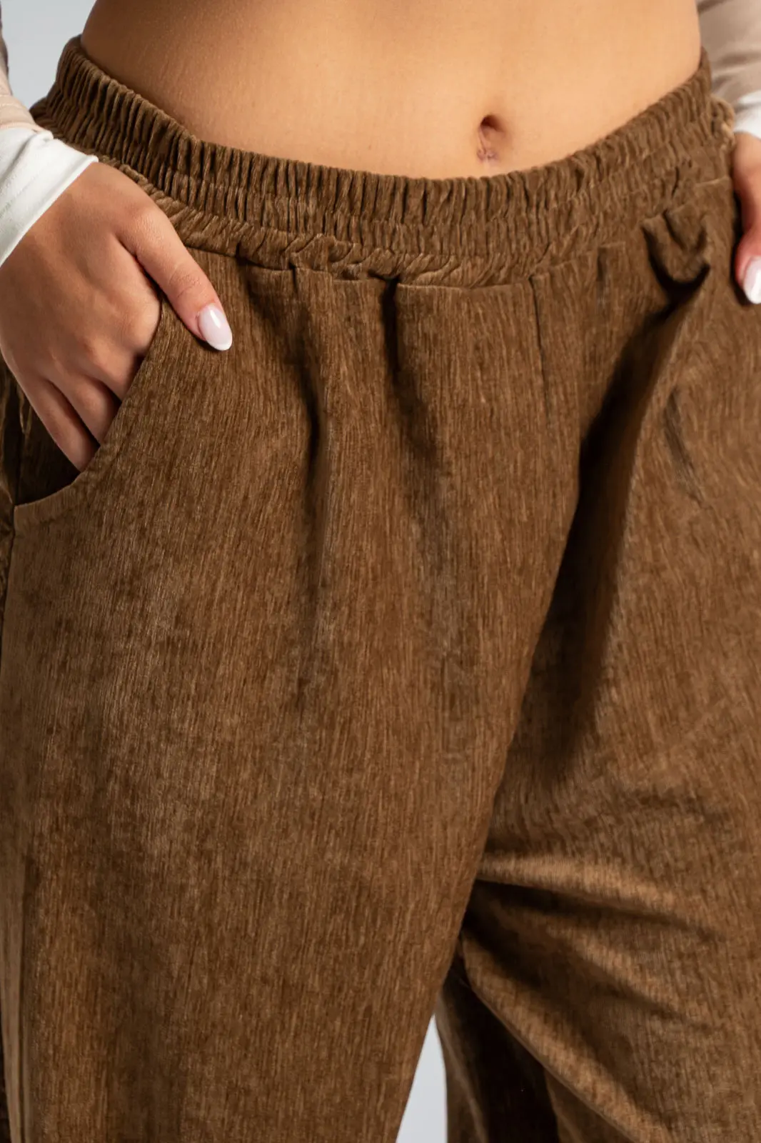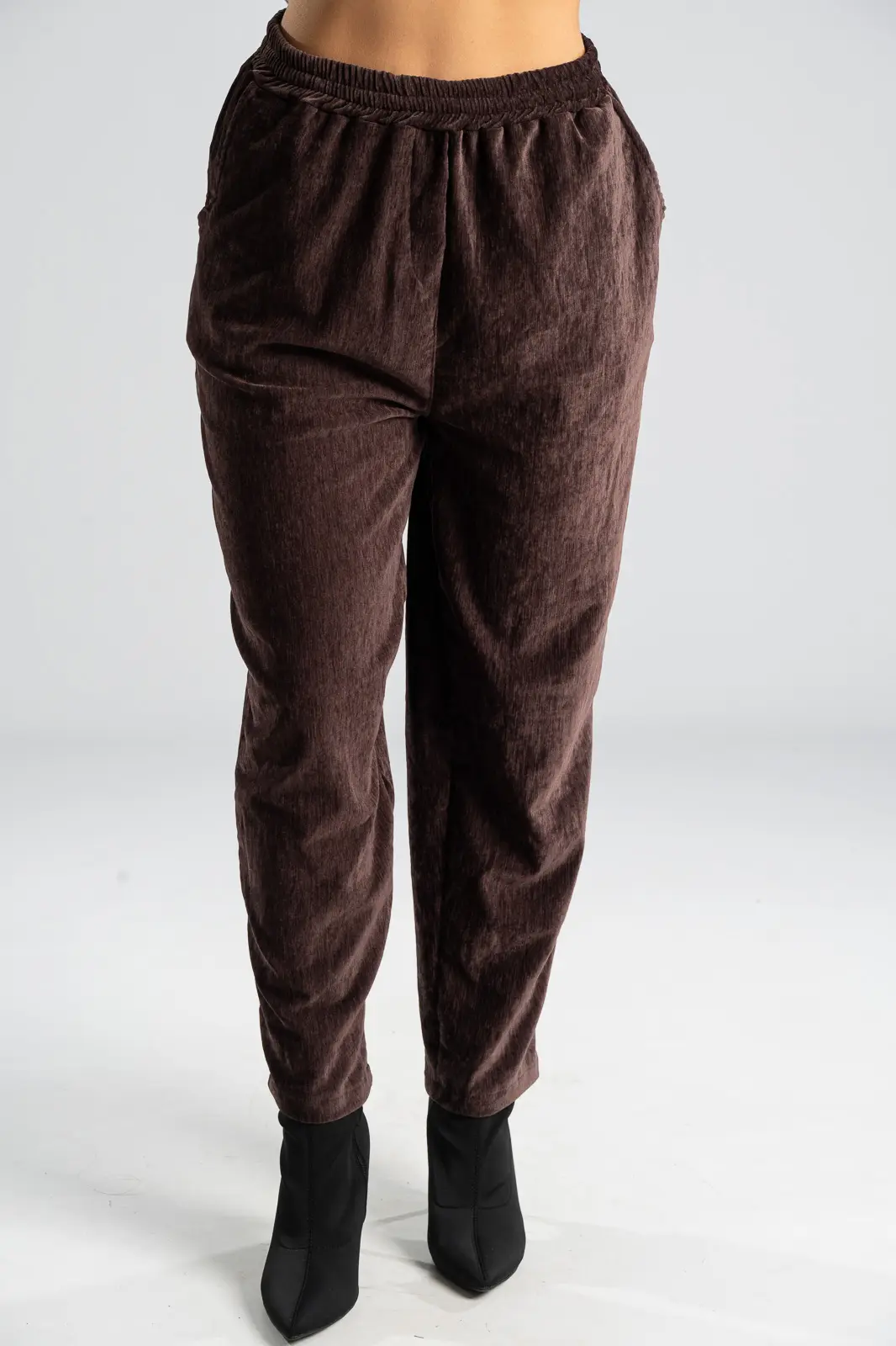 Παντελόνι velvet με λάστιχο περιμετρικά για καλύτερη εφαρμογή. Είναι σε ίσια γραμμή και το ύφασμα του είναι πολύ μαλακό. Στα πλαινά και στο πίσω μέρος έχει τσέπες. Οι μετρήσεις του πίνακα είναι αντιπροσωπευτικές για κάθε κωδικό. 96% polyester, 4% elastan.
