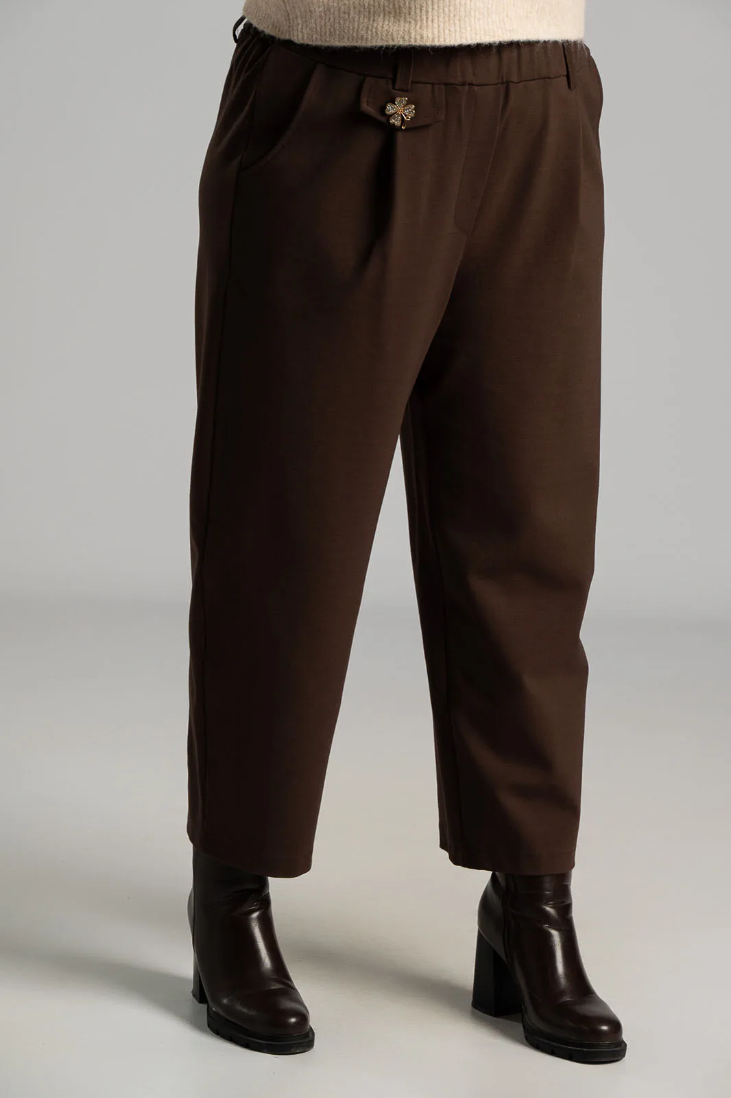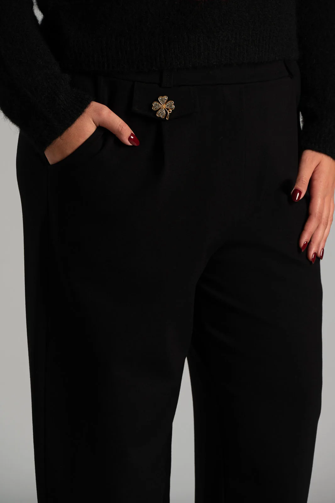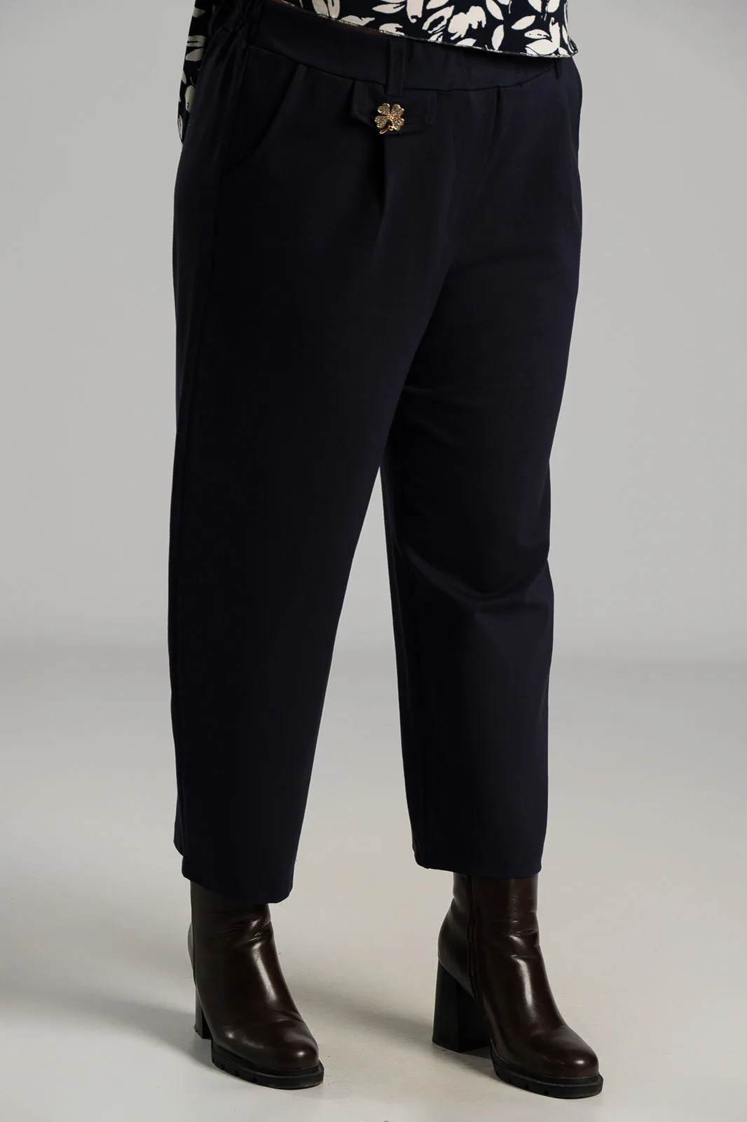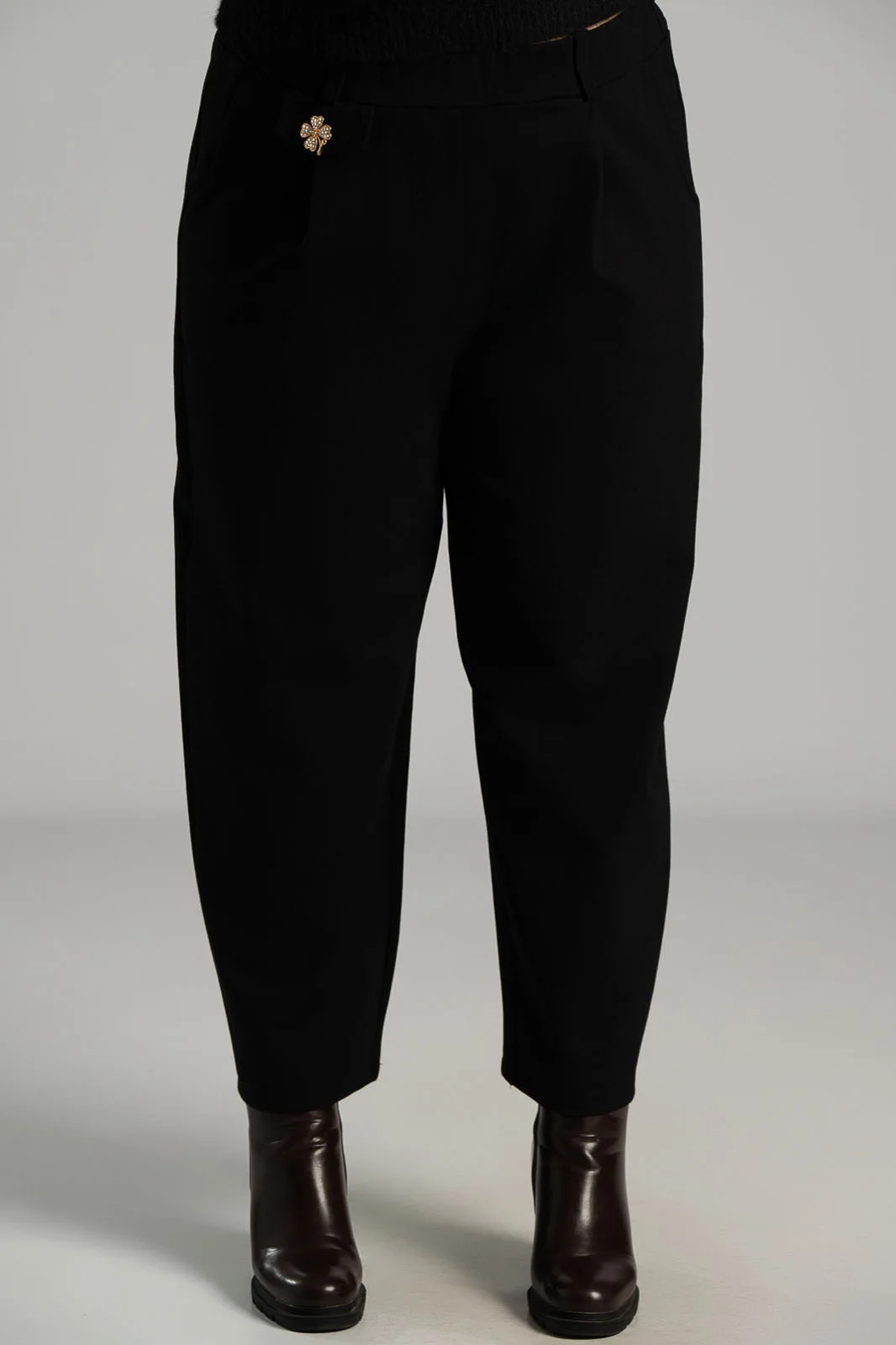 Παντελόνι με λάστιχο στην μέση. Στο μπροστινό μέρος διαθέτει πιέτες και καπάκι με διακοσμητική καρφίτσα. Είναι άνετο και στα πλαινά έχει τσέπες. Οι μετρήσεις του πίνακα είναι αντιπροσωπευτικές για κάθε προϊόν. 65% viscose, 30% nylon, 5% elastan.