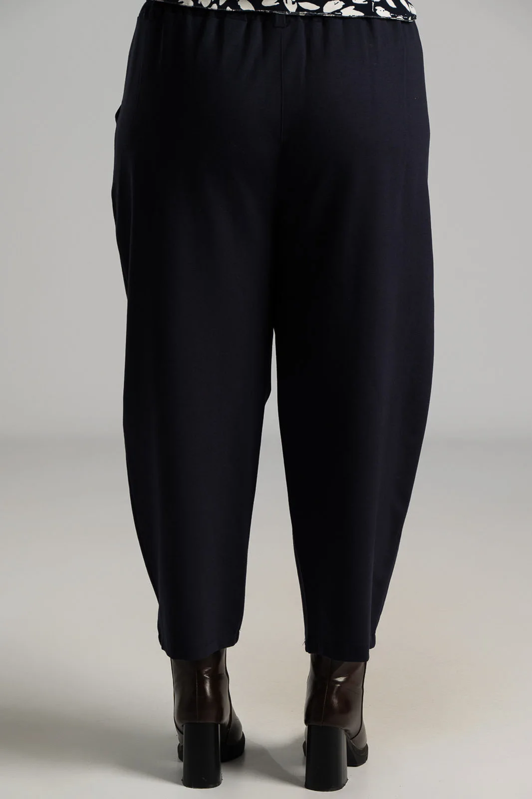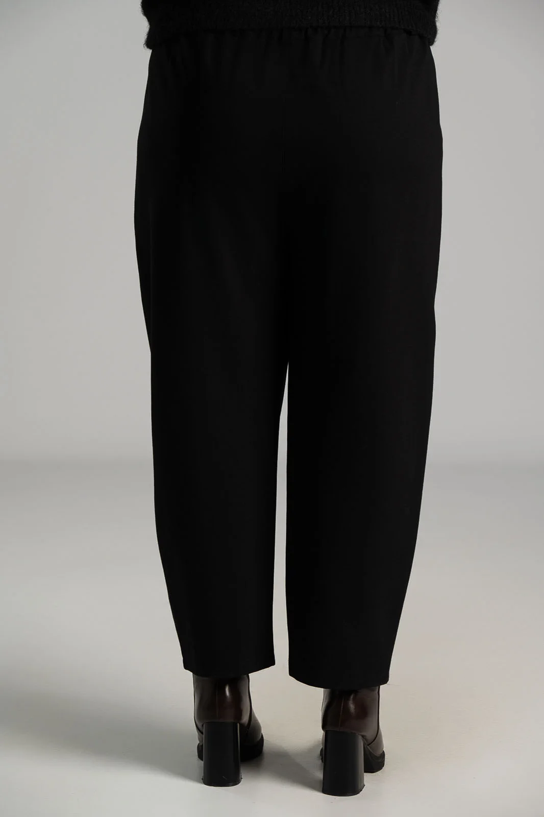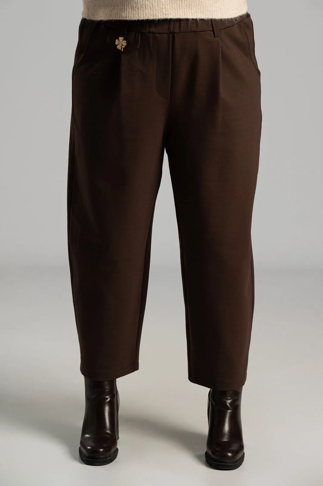 Παντελόνι με λάστιχο στην μέση. Στο μπροστινό μέρος διαθέτει πιέτες και καπάκι με διακοσμητική καρφίτσα. Είναι άνετο και στα πλαινά έχει τσέπες. Οι μετρήσεις του πίνακα είναι αντιπροσωπευτικές για κάθε προϊόν. 65% viscose, 30% nylon, 5% elastan.