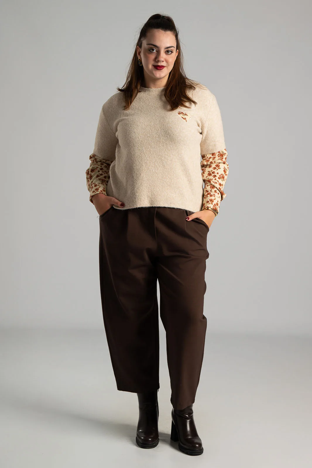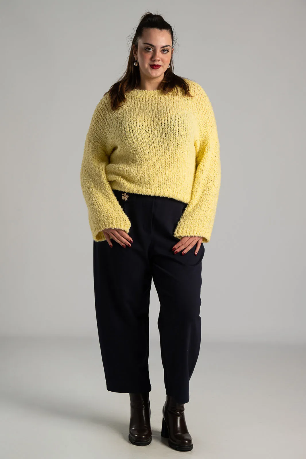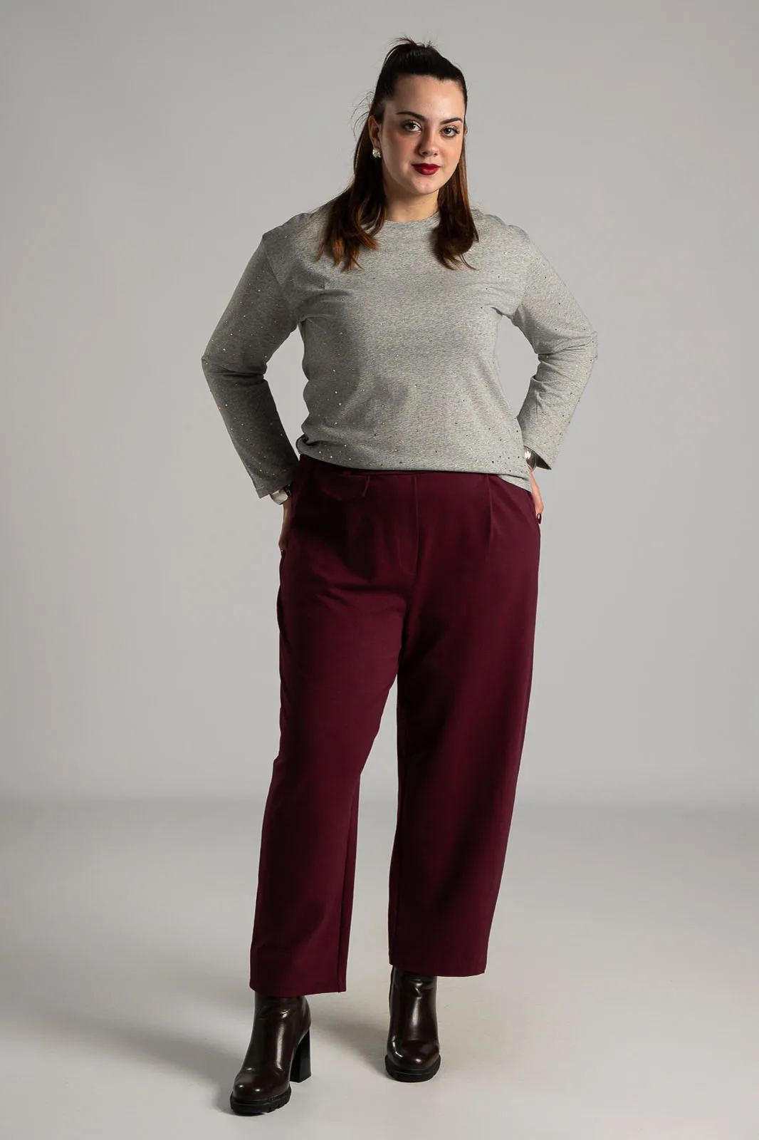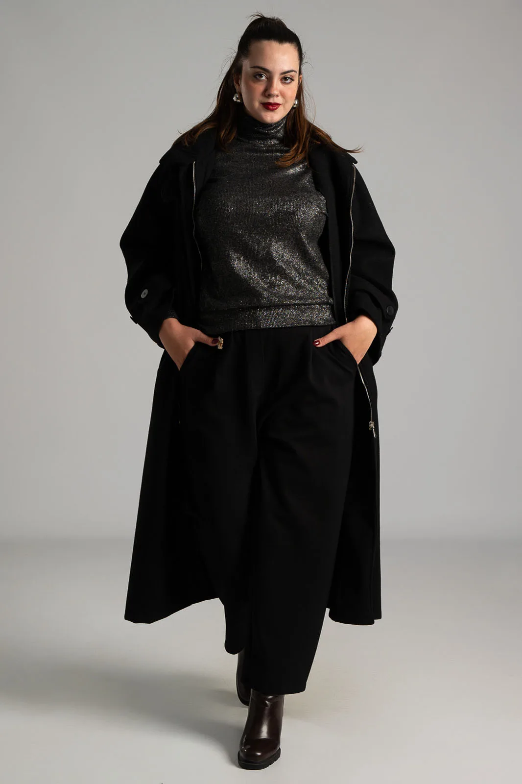 Παντελόνι με λάστιχο στην μέση. Στο μπροστινό μέρος διαθέτει πιέτες και καπάκι με διακοσμητική καρφίτσα. Είναι άνετο και στα πλαινά έχει τσέπες. Οι μετρήσεις του πίνακα είναι αντιπροσωπευτικές για κάθε προϊόν. 65% viscose, 30% nylon, 5% elastan.