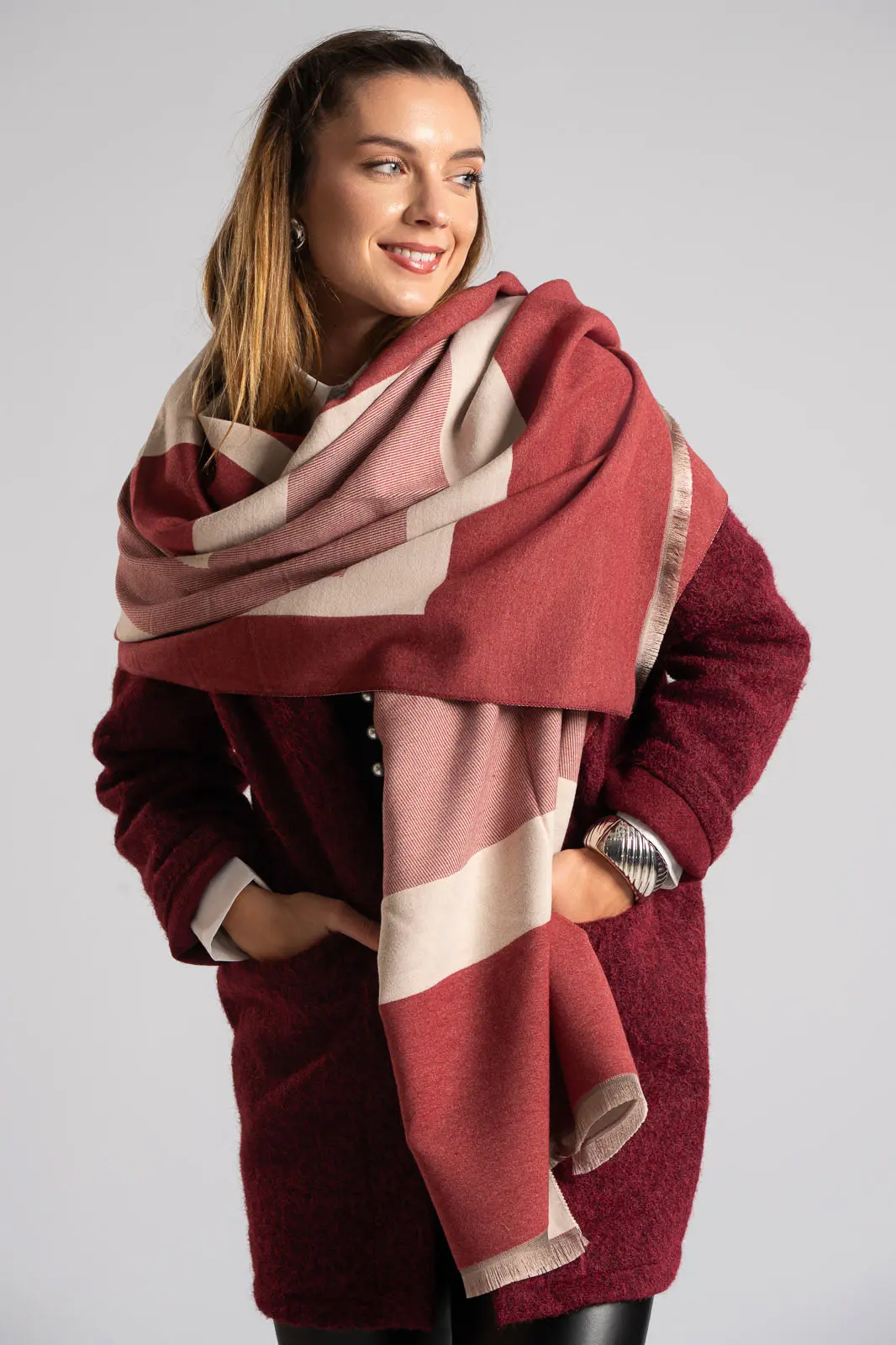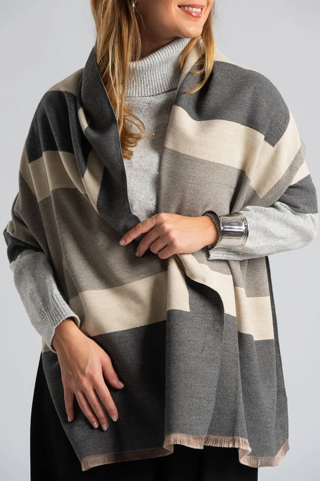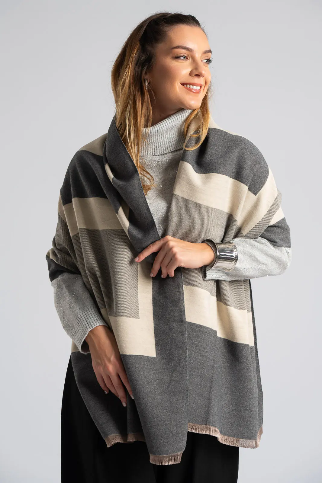 Pasmina with geometric lines. It has a soft texture and comes in two colors. It measures 188cmx65cm. 40% cashmere, 40% wool, 20% viscose.