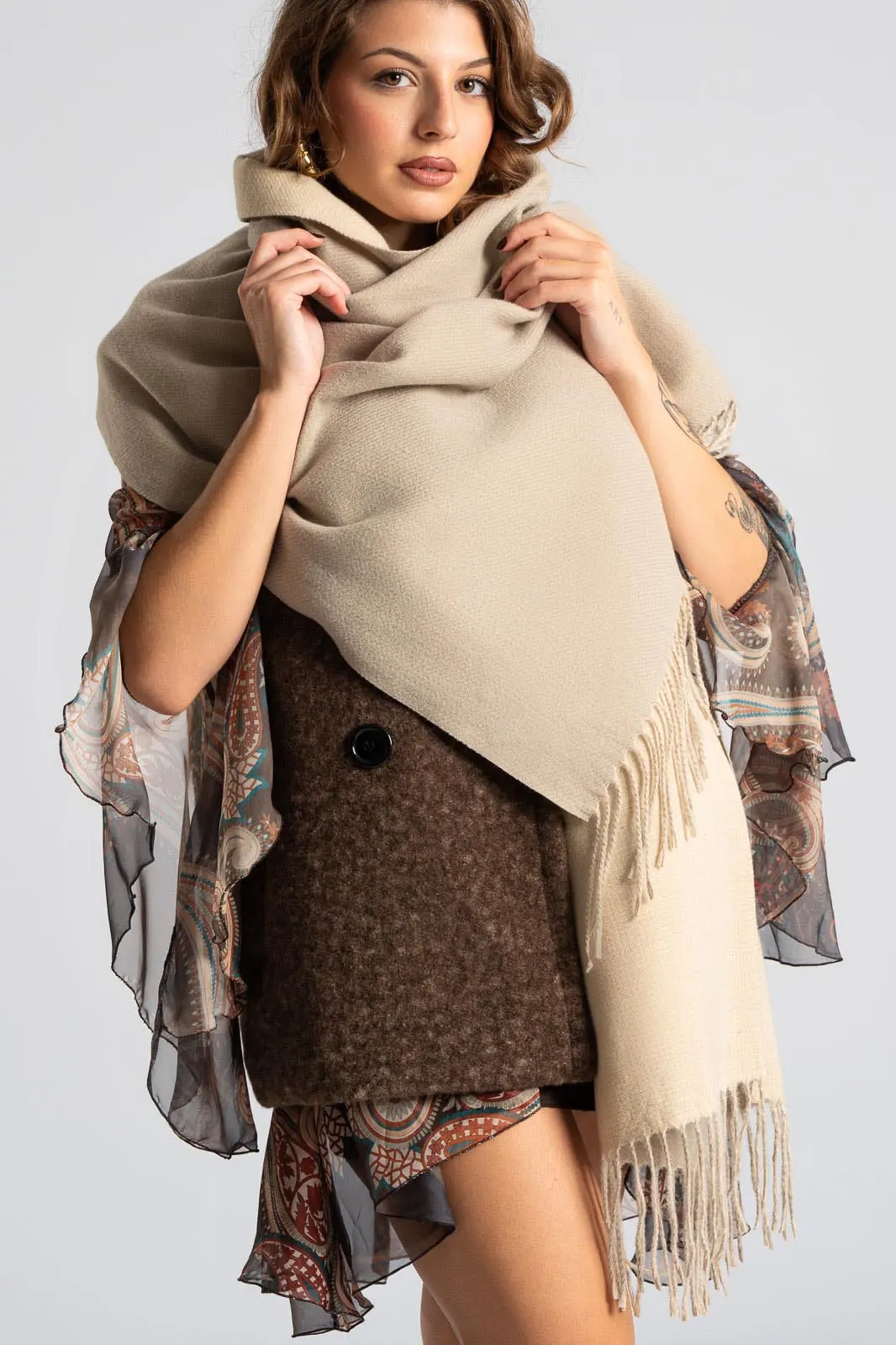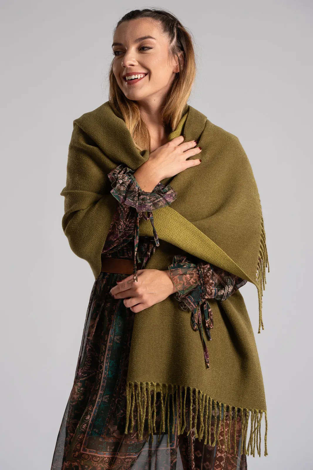 Single-color pashmina. It has a soft texture and is double-sided. It has fringes at the ends. It measures 188 cm x 70 cm. 100% polyester.