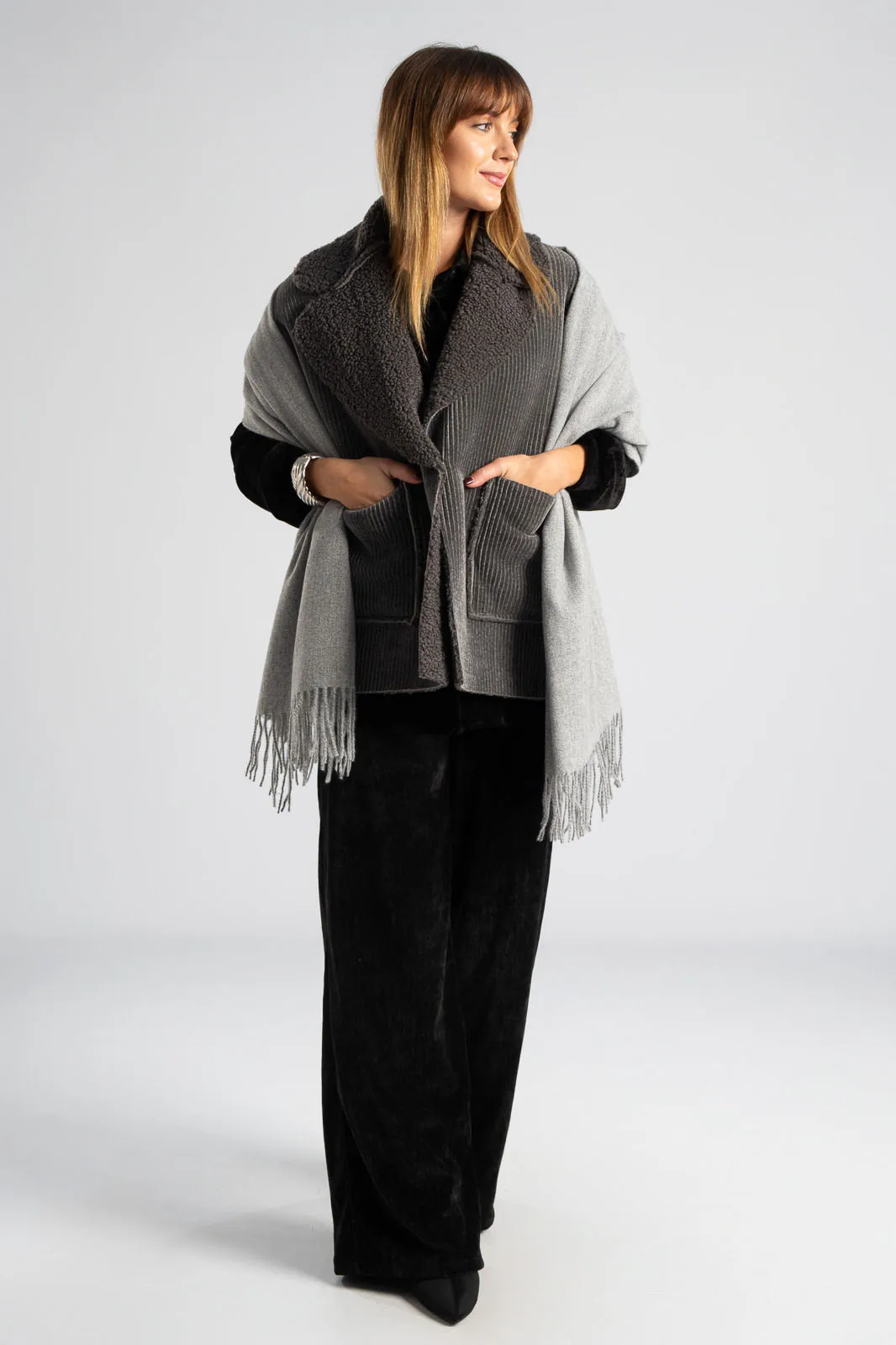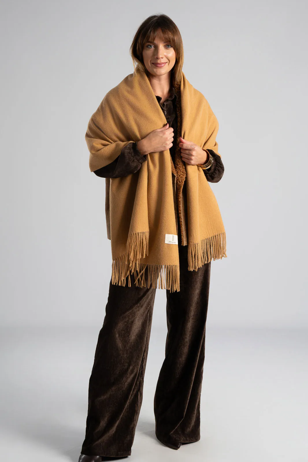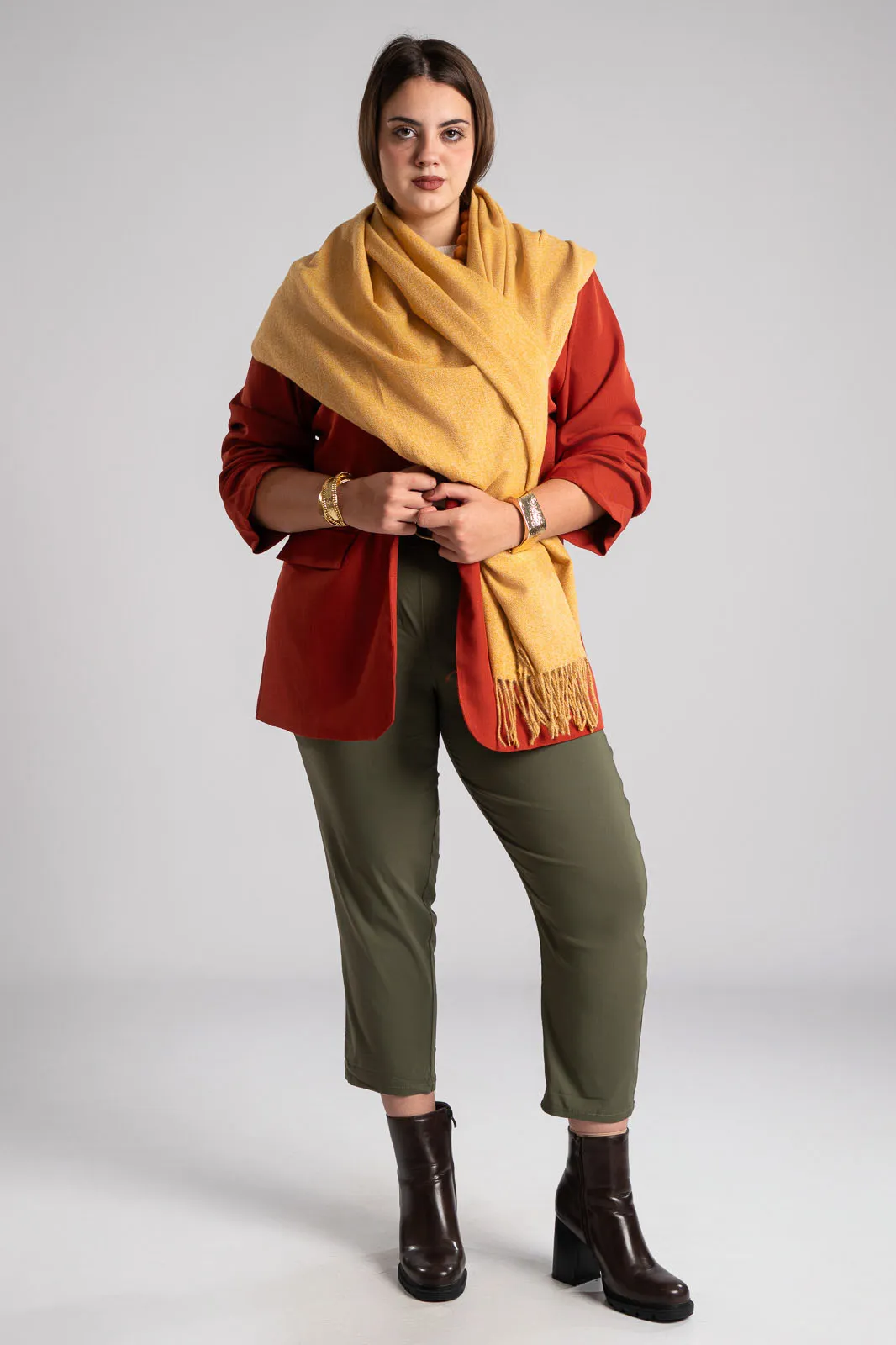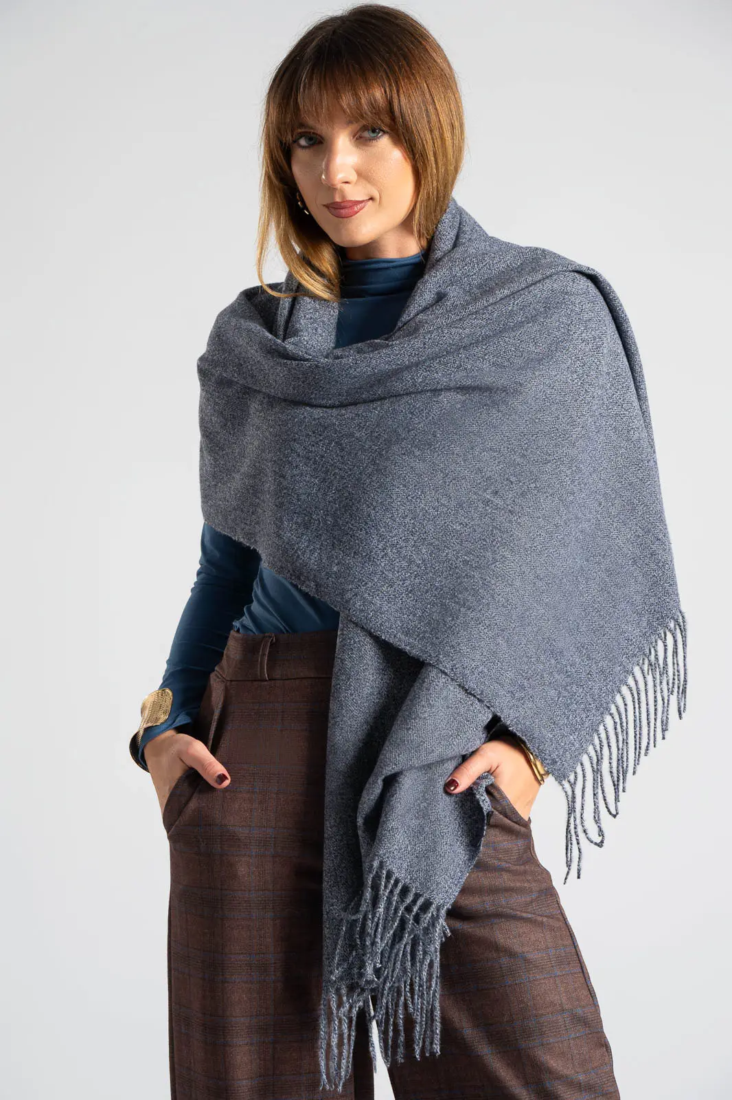 Pasmina with a very soft texture. It has a melange style across its entire surface. It has short fringes at the ends. It measures 180cmx69cm. 20% wool, 80% viscose
