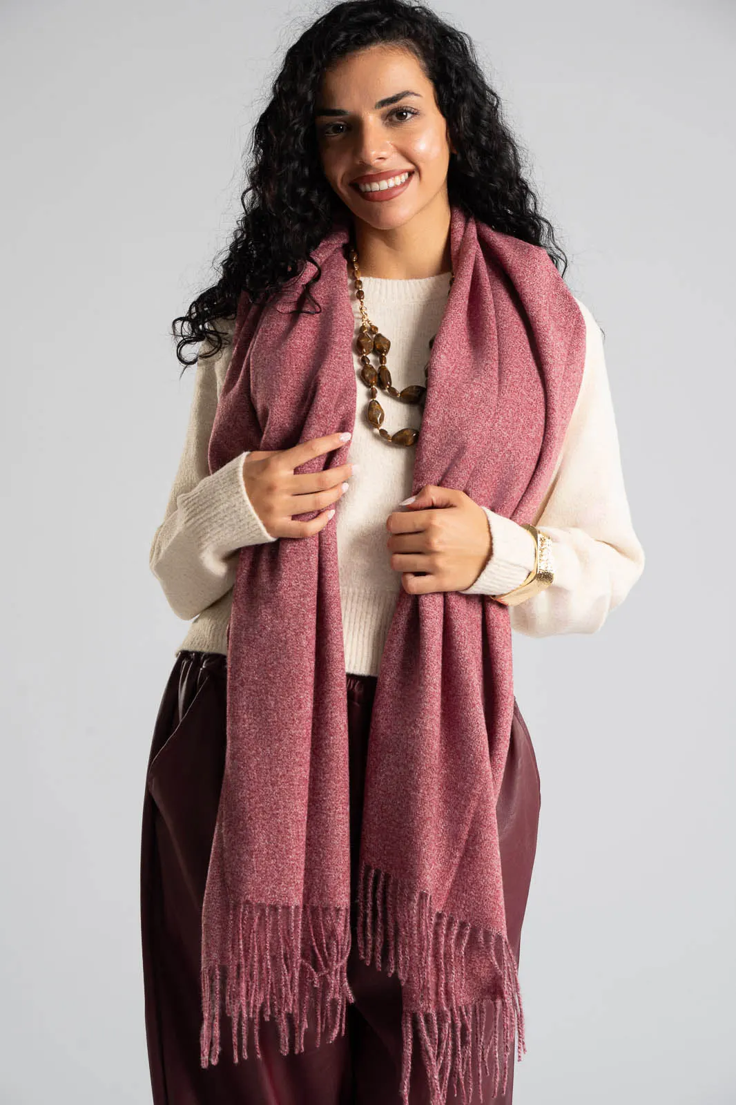 Pasmina with a very soft texture. It has a melange style across its entire surface. It has short fringes at the ends. It measures 180cmx69cm. 20% wool, 80% viscose.