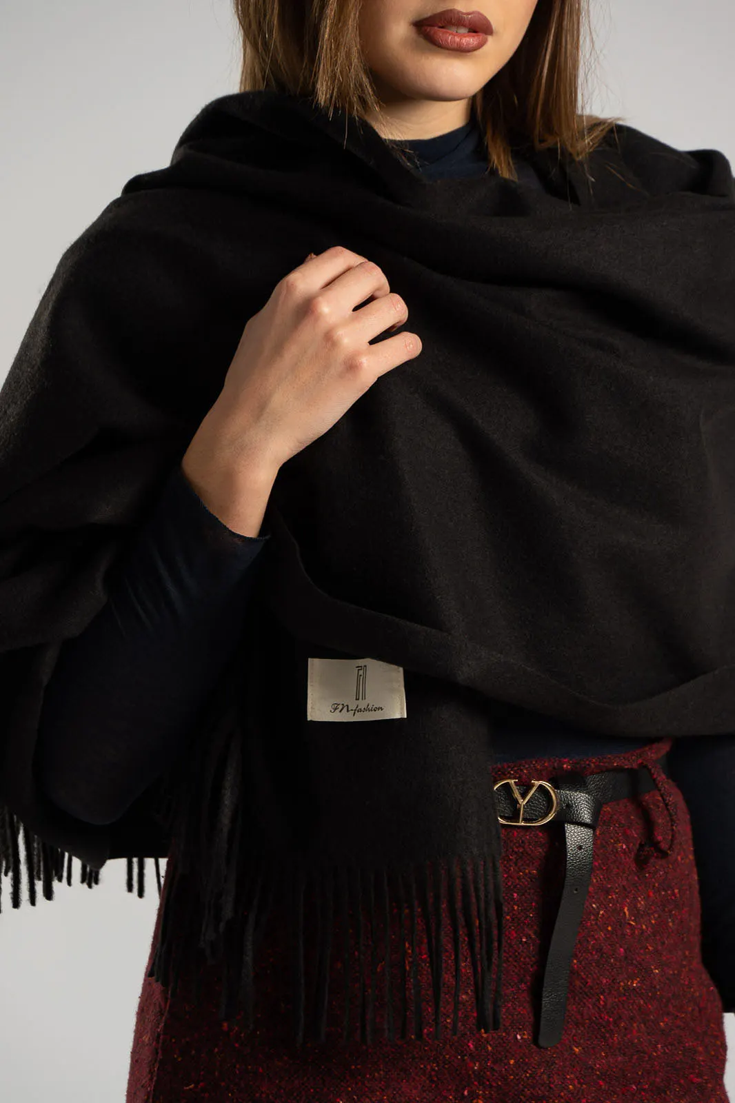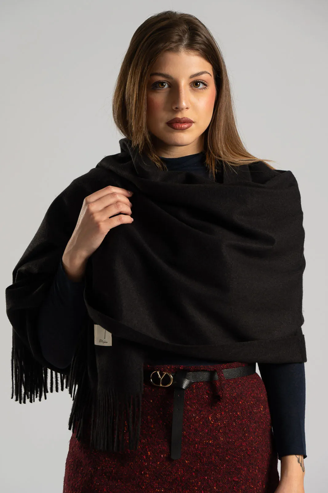 Single-color pashmina. It has a soft texture. It has fringes at the ends. It measures 187cmx72cm. 40% cashmere, 40% wool, 20% viscose.