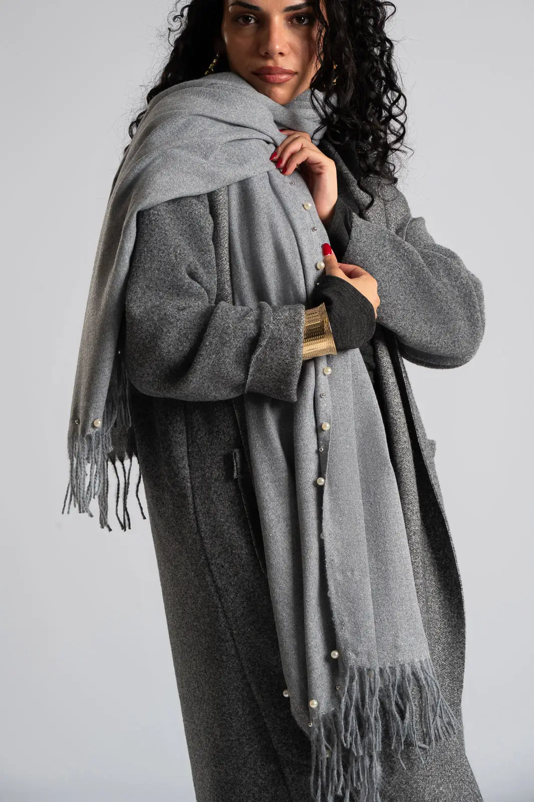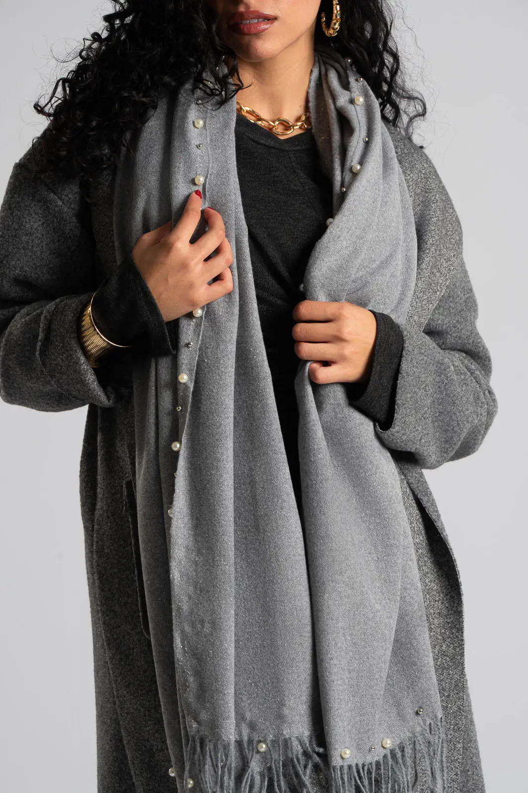 Single-color pashmina. It has a soft texture. It has fringes at the ends. It has decorative pearls around the edges. It measures 188cmx74cm. 100% viscose.