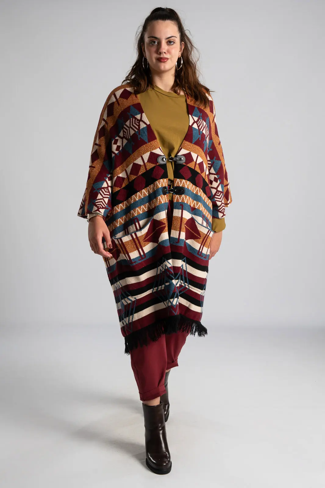 Πόντσο νημάτινο με συμπαγή πλέξη. Έχει V άνοιγμα και καταλήγει σε δύο κουμπώματα στο μπροστινό μέρος. Έχει ασύμμετρο τελείωμα με διακοσμητικά κρόσια στο τελείωμα. Στο μπροσινό μέρος έχει δύο τετραγωνισμένες τσέπες. Σε όλη την επιφάνεια διαθέτει εντυπωσιακό γεωμετρικό μοτίβο. Η μέτρηση έχει γίνει με κλειστά κουμπιά. Οι μετρήσεις του πίνακα είναι αντιπροσωπευτικές για κάθε κωδικό. 60% cotton,40% viscose.