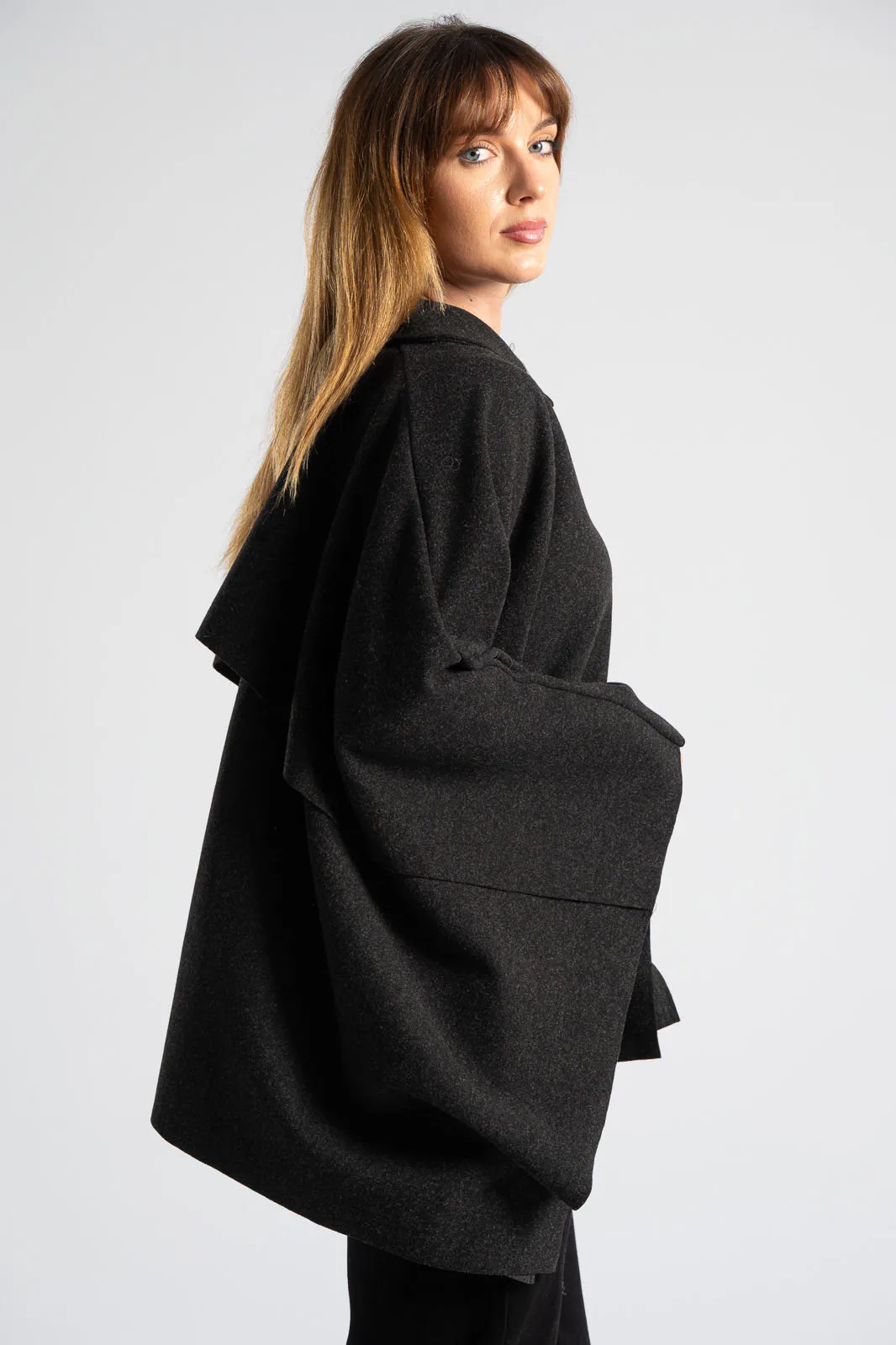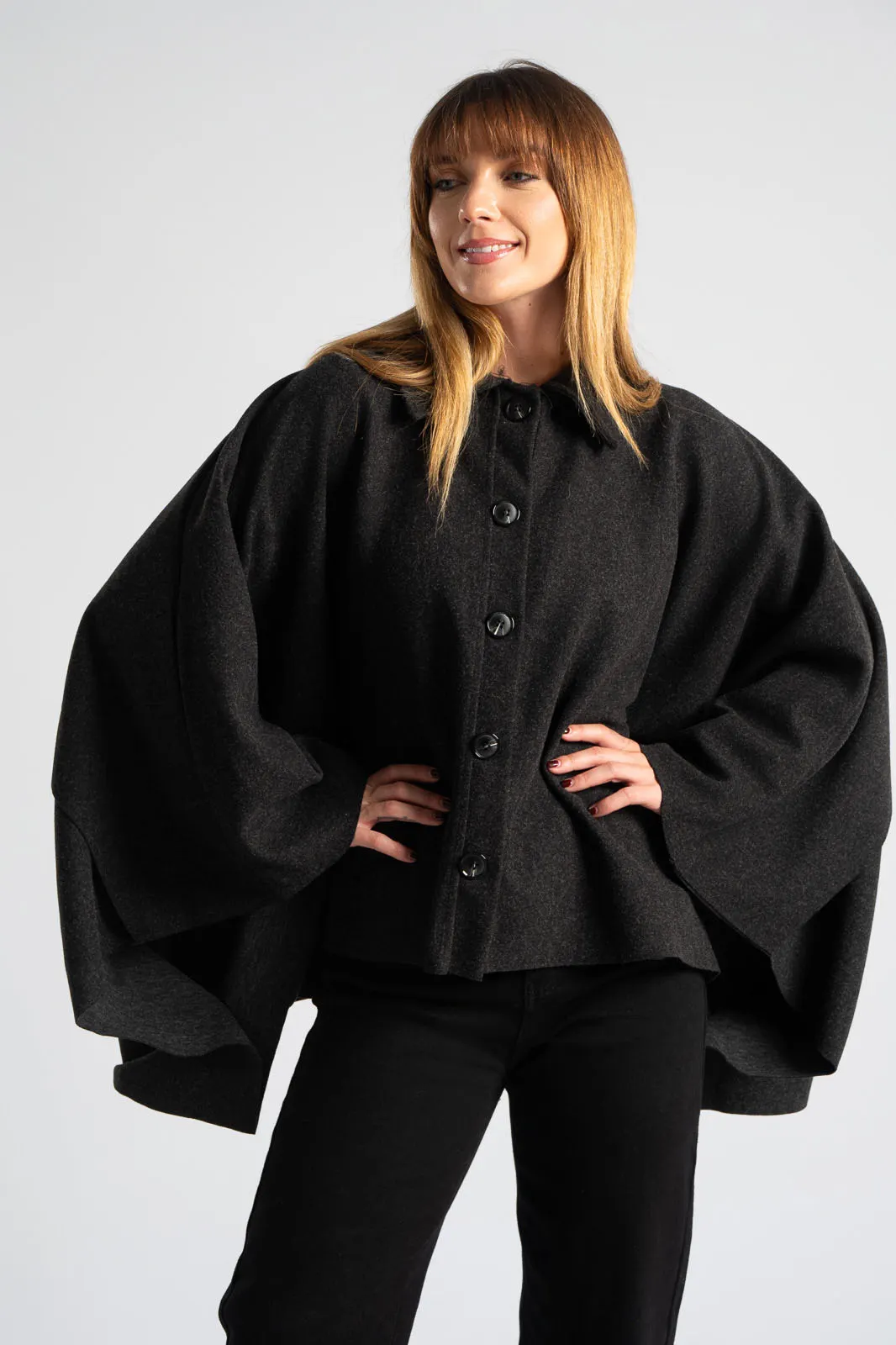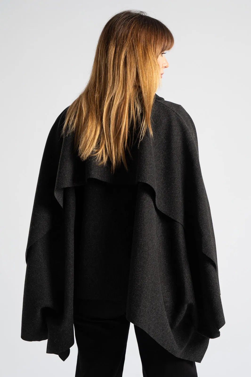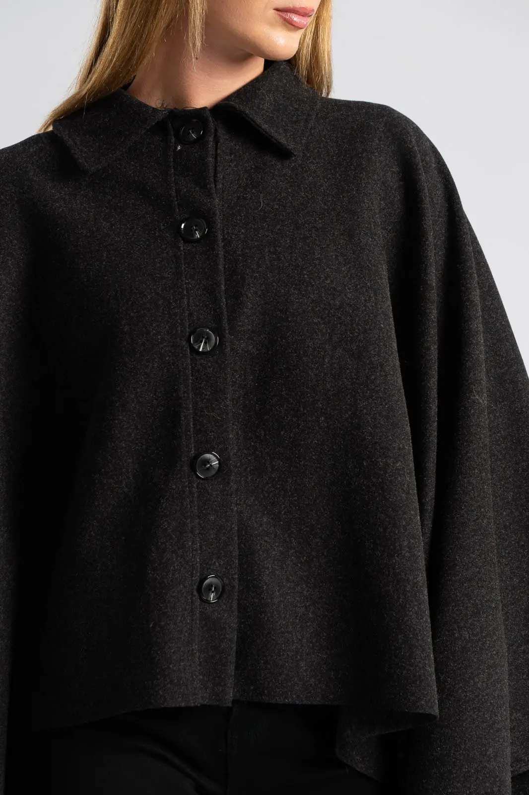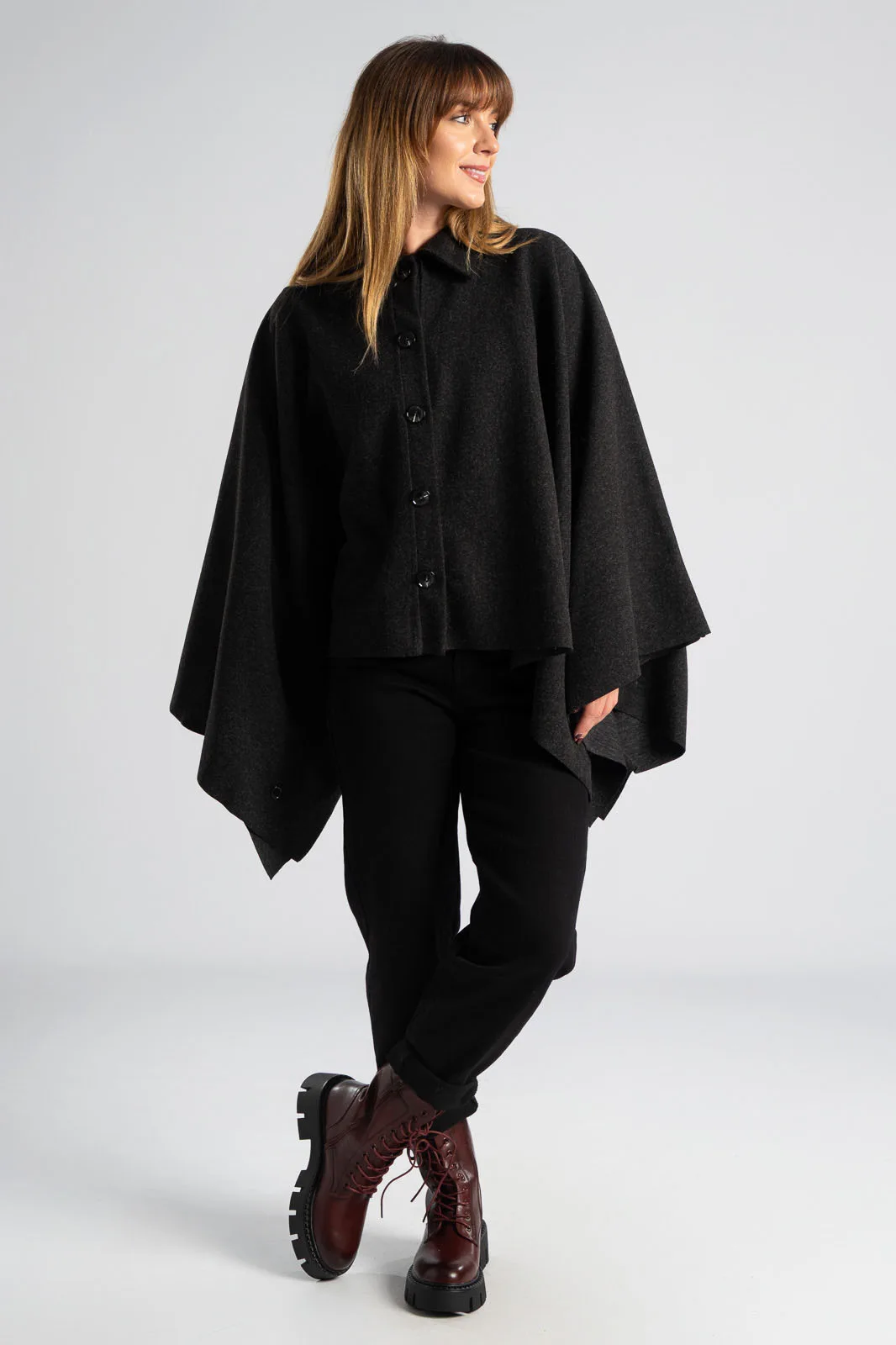 Πόντσο που διαθέτει γιακά και κλείνει στο μπροστινό μέρος με κουμπιά. Είναι ασύμμετρο. Η μέτρηση έχει γίνει με κλειστά κουμπιά. Οι μετρήσεις του πίνακα είναι αντιπροσωπευτικές για κάθε κωδικό. 88% polyester, 12% viscose.