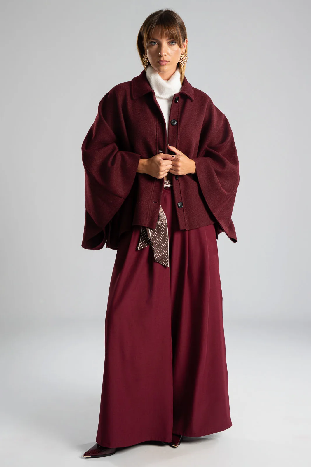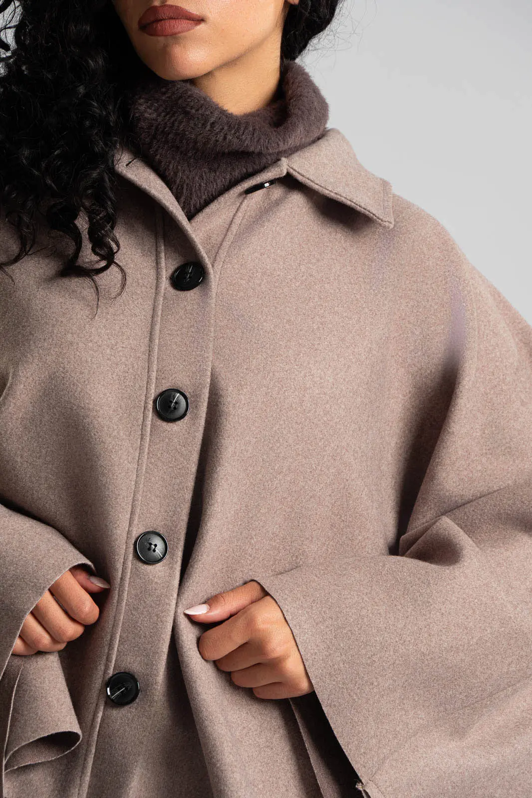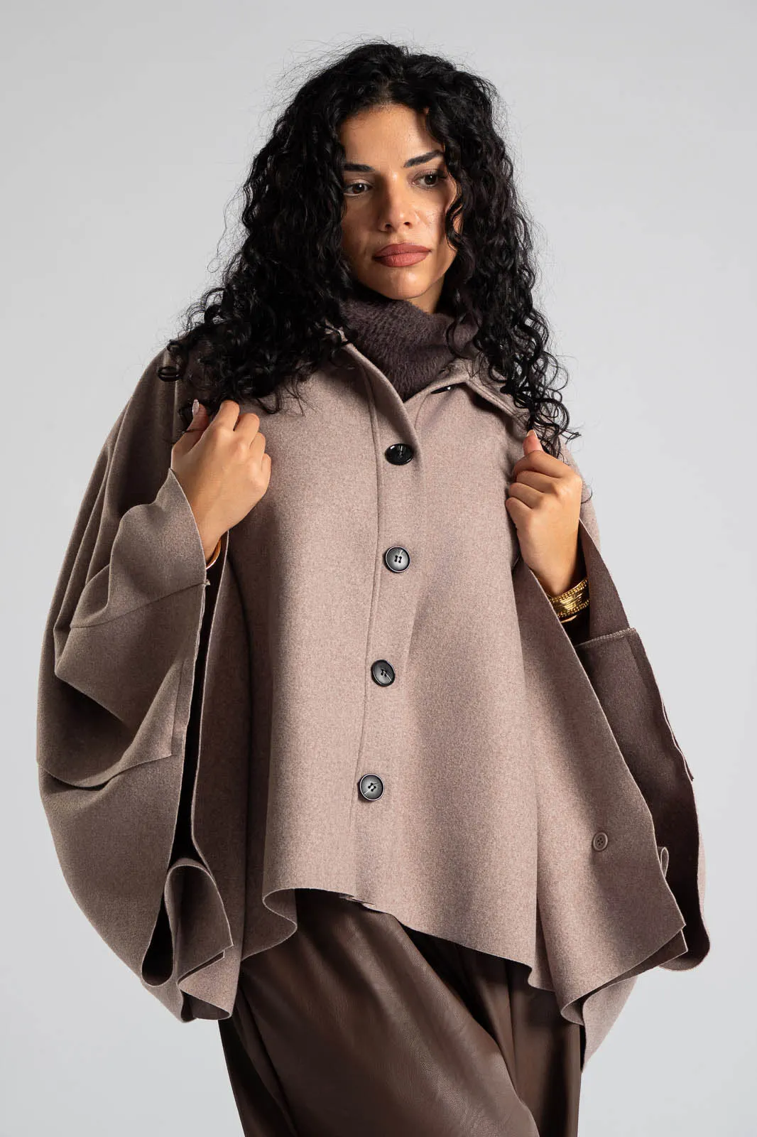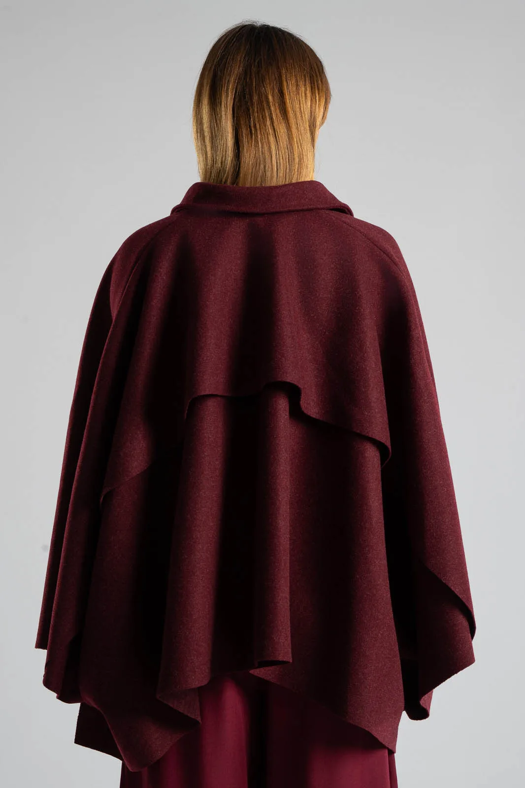 Poncho with a collar and button closure at the front. It is asymmetrical. Measurements are taken with the buttons closed. The measurements in the table are representative for each code. 88% polyester, 12% viscose.