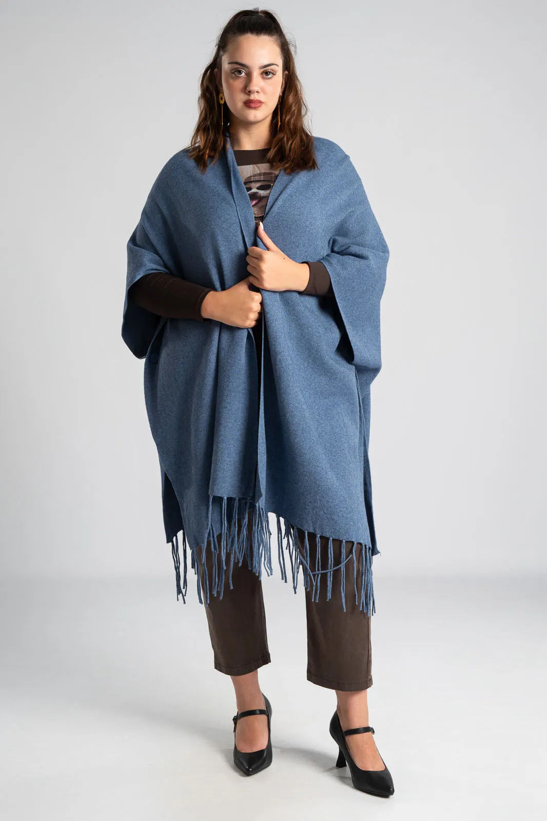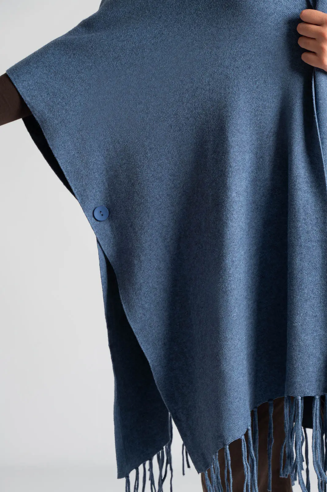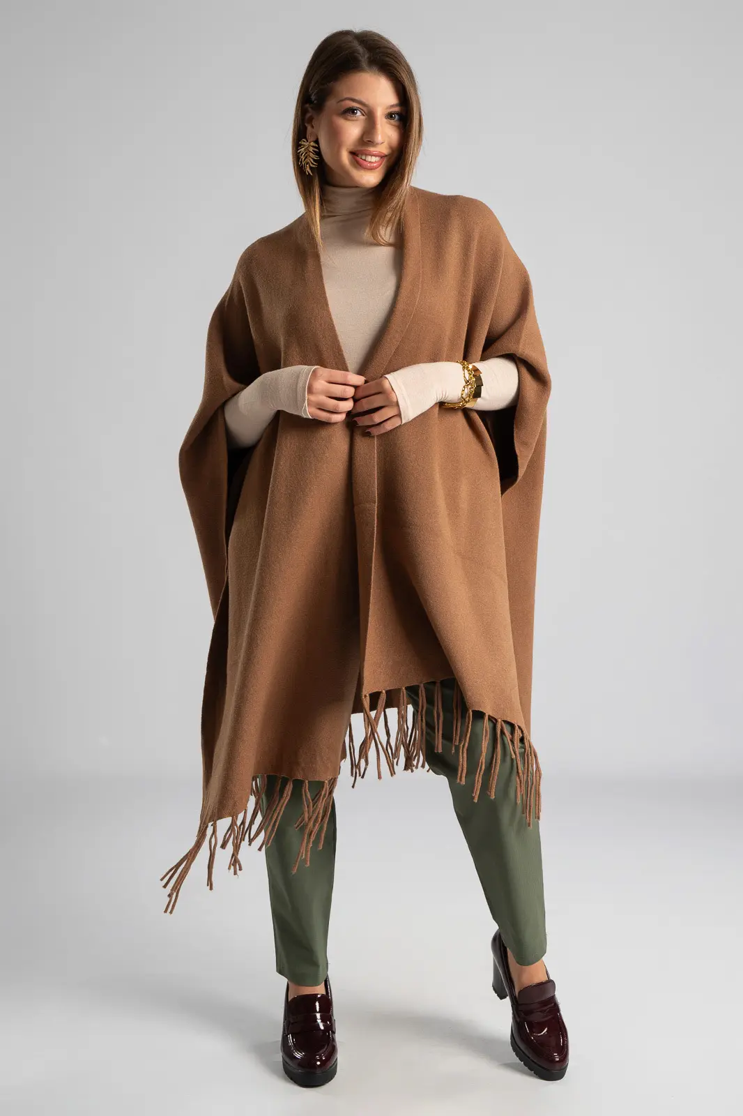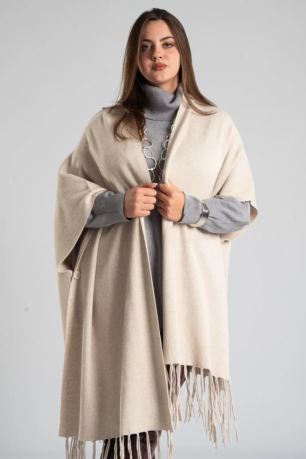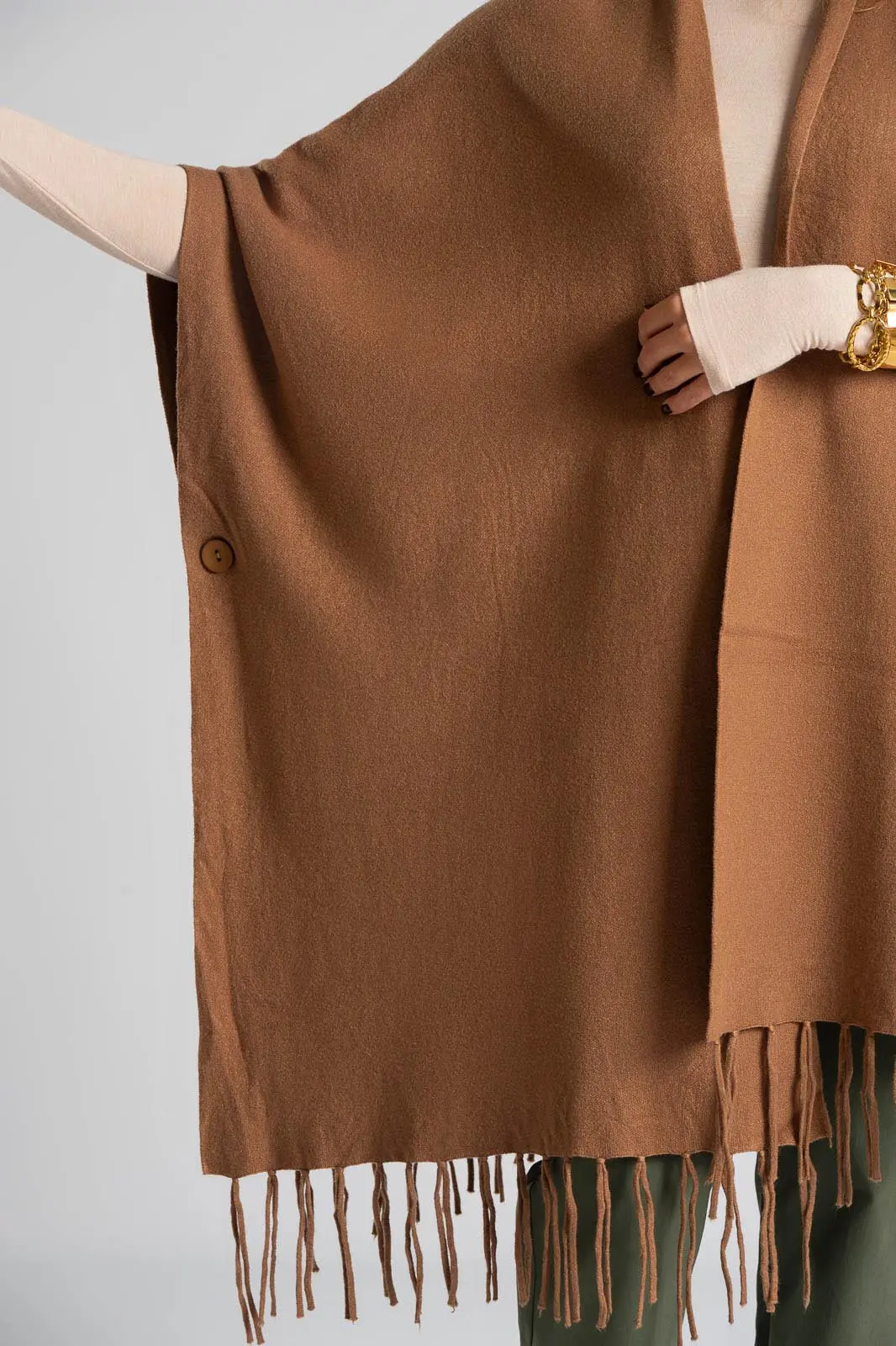 Poncho with compact yarn weave. It is asymmetrical and has fringes around the edges. It is midi length. It has a decorative button on the sides below the armhole opening. The measurement was taken with the opening of one palm. 27% modal, 25% cotton, 19% viscose, 15% polyamide, 14% elastane.