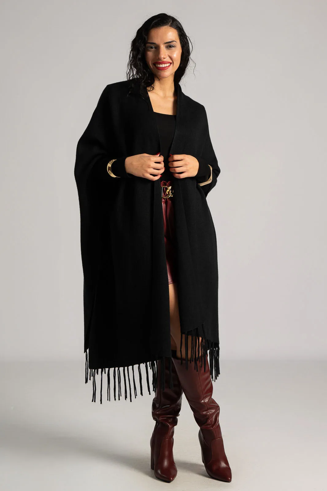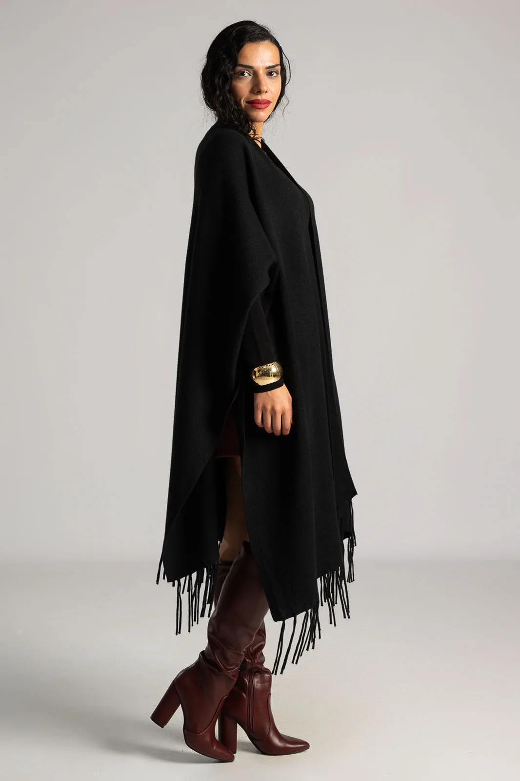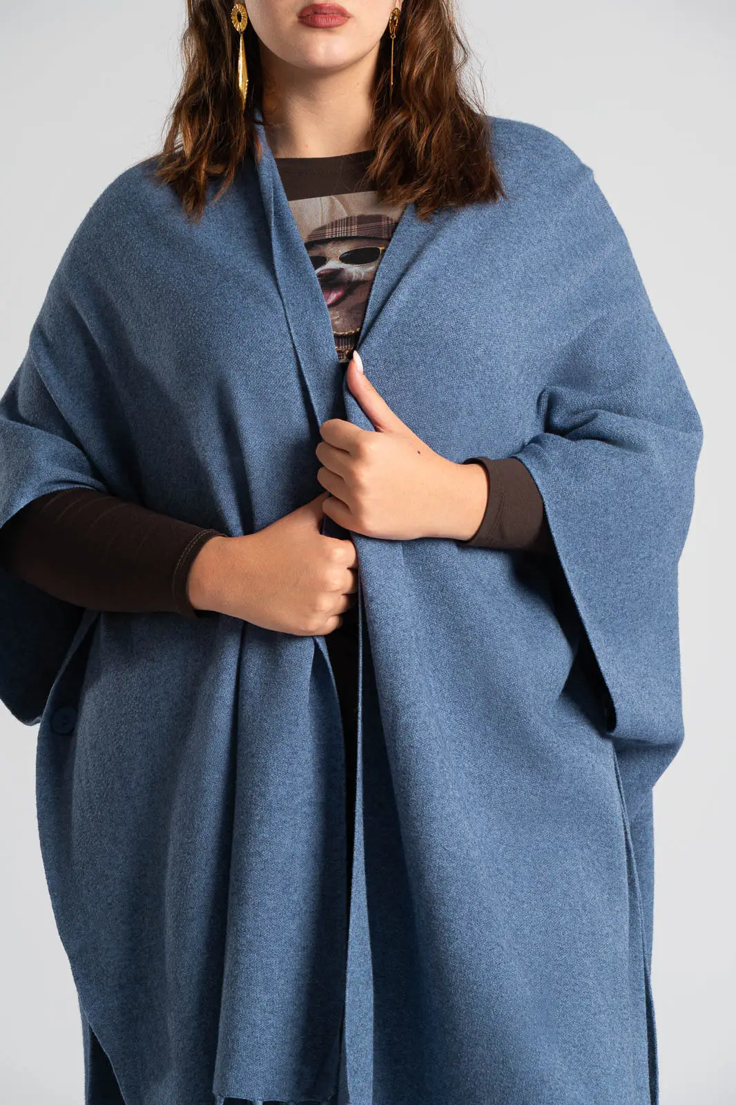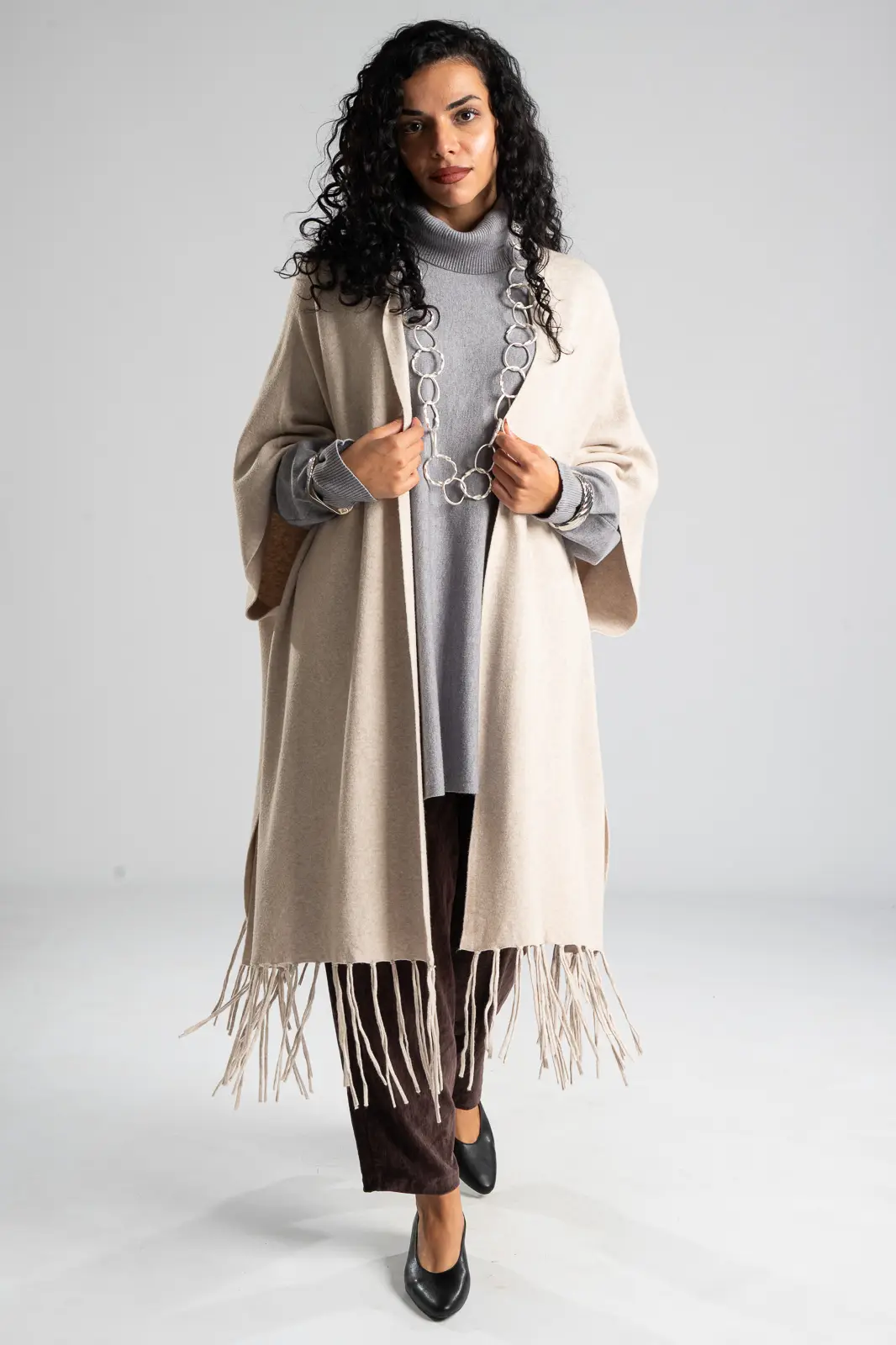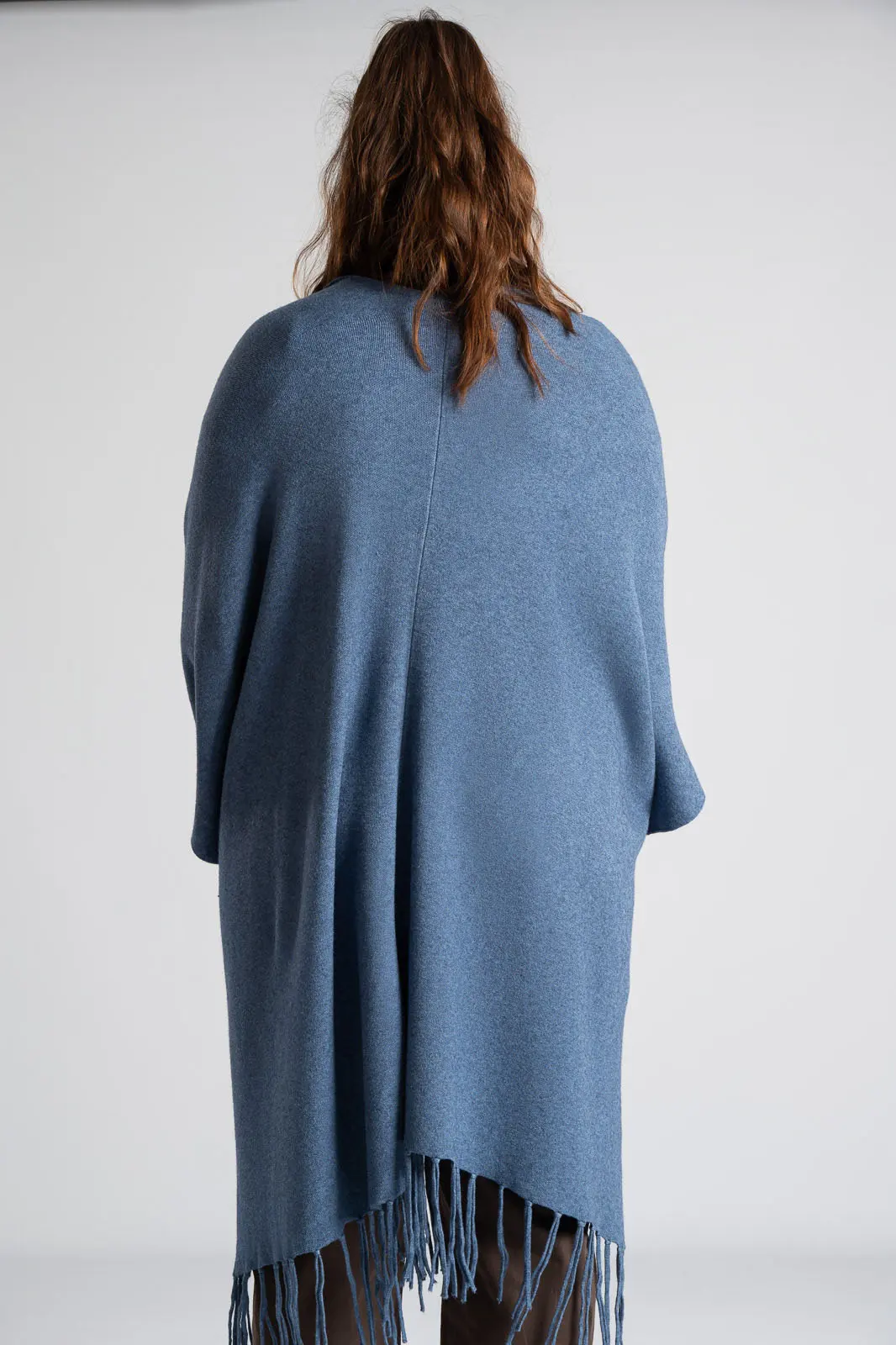 Poncho with compact yarn weave. It is asymmetrical and has fringes around the edges. It is midi length. It has a decorative button on the sides below the armhole opening. The measurement was taken with the opening of one palm. 27% modal, 25% cotton, 19% viscose, 15% polyamide, 14% elastane.