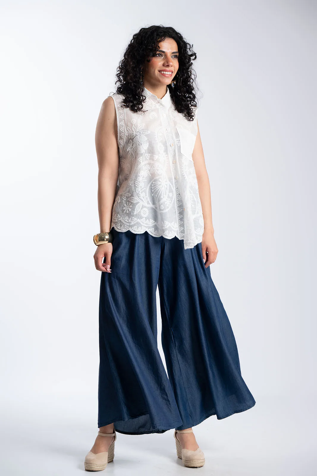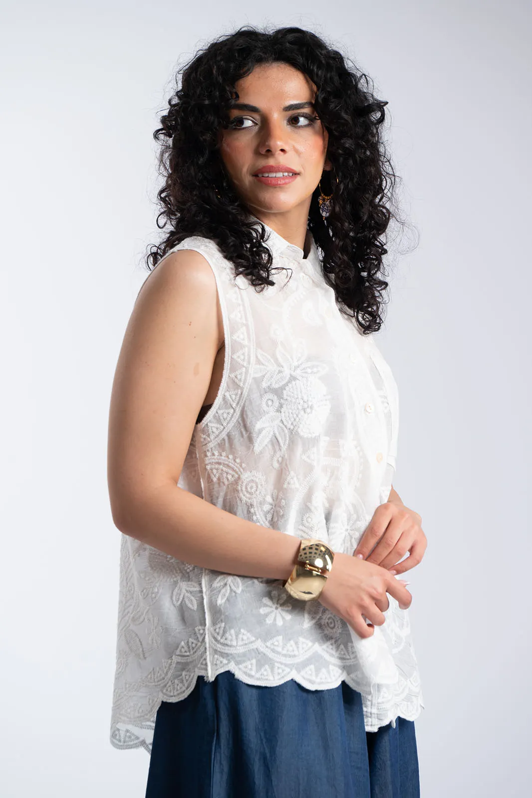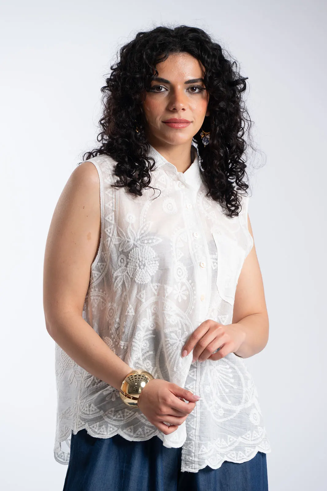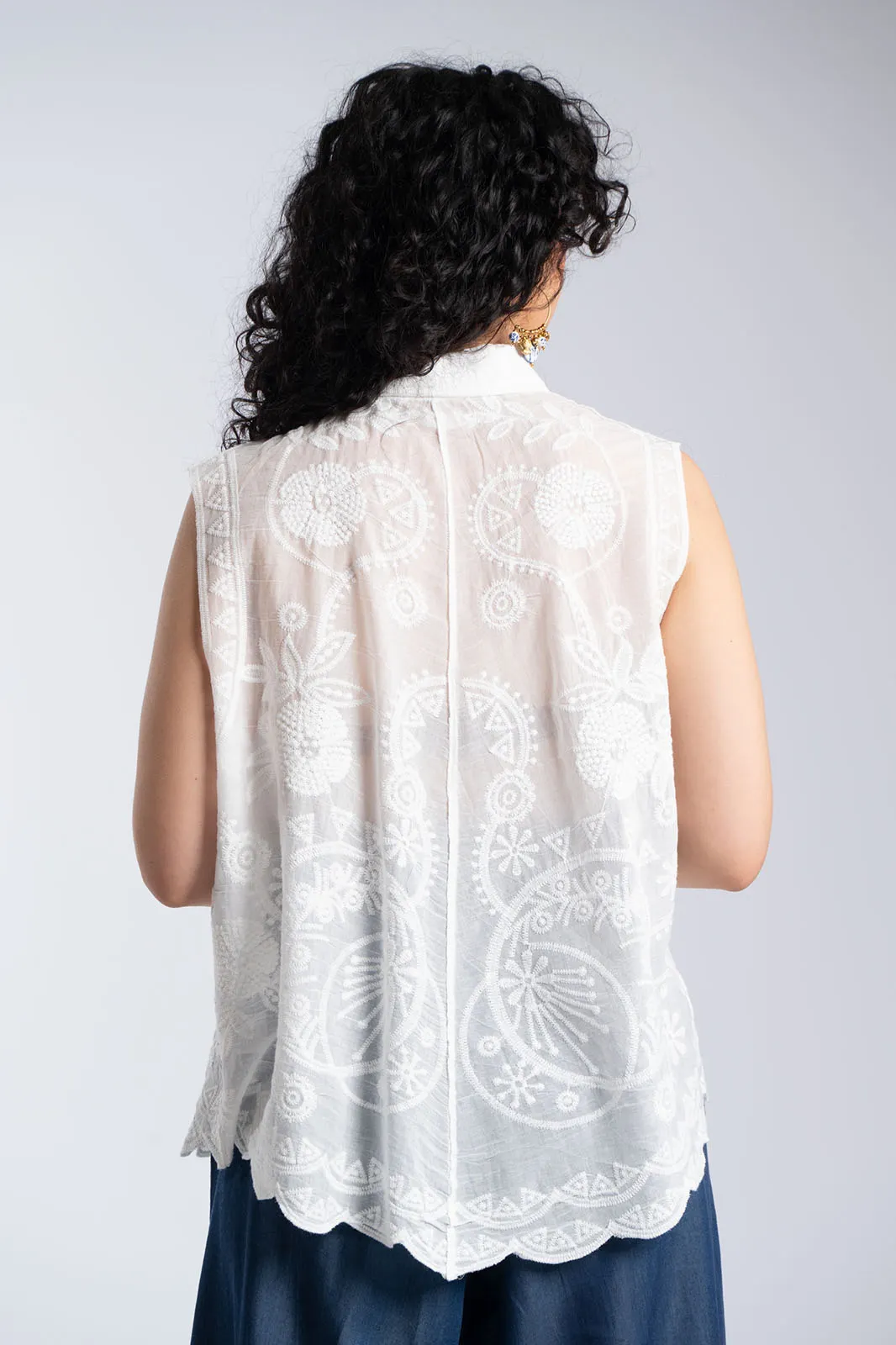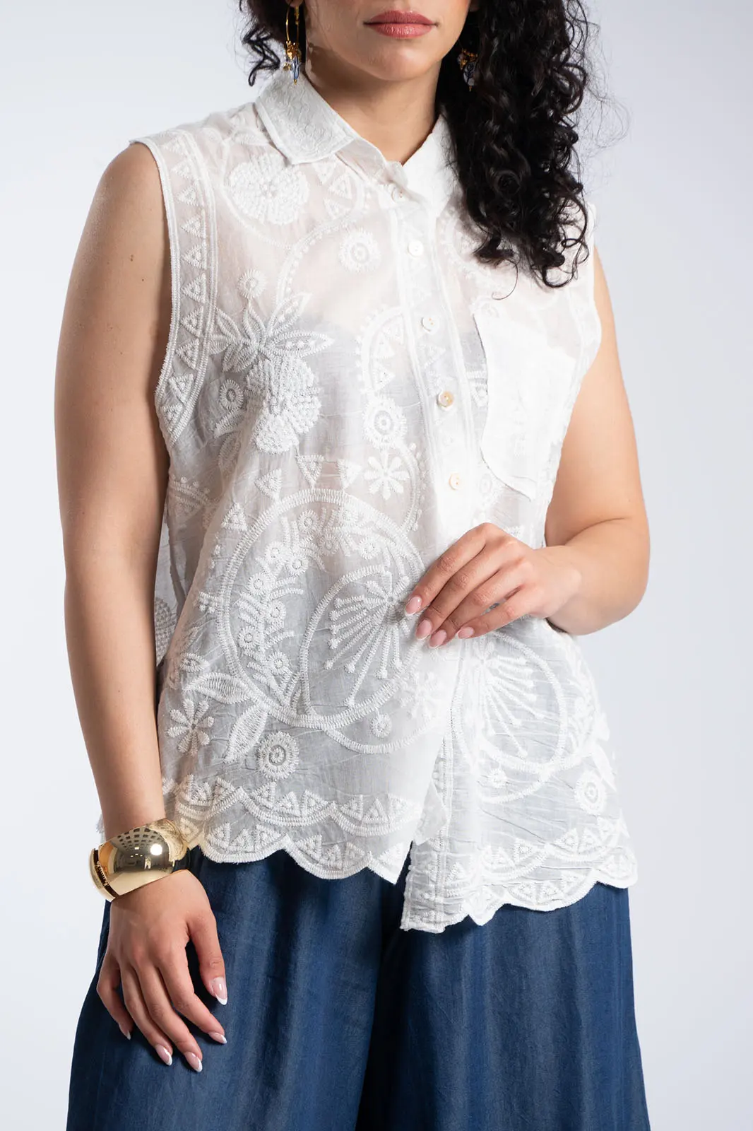 Κομψό αμάνικο πουκάμισο με κεντητό σχέδιο που χαρίζει ρομαντικό και ιδιαίτερο χαρακτήρα στο σύνολο. Διαθέτει κλασικό γιακά και κουμπιά στο μπροστινό μέρος, ενώ το ύφασμα διακοσμείται με περίτεχνα κεντήματα που δημιουργούν μια φίνα και ανάλαφρη αισθητική. Η γραμμή του είναι άνετη και ελαφρώς αέρινη, ενώ το τελείωμα ακολουθεί απαλά το σώμα προσφέροντας κομψότητα και άνεση. Η μικρή τσέπη στο μπροστινό μέρος προσθέτει μια διακριτική λεπτομέρεια που ολοκληρώνει το σχέδιο. Ένα διαχρονικό κομμάτι που μπορεί να φορεθεί από το πρωί μέχρι το βράδυ, συνδυάζοντας άνεση και κομψότητα.