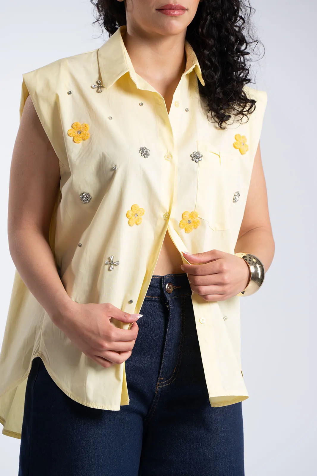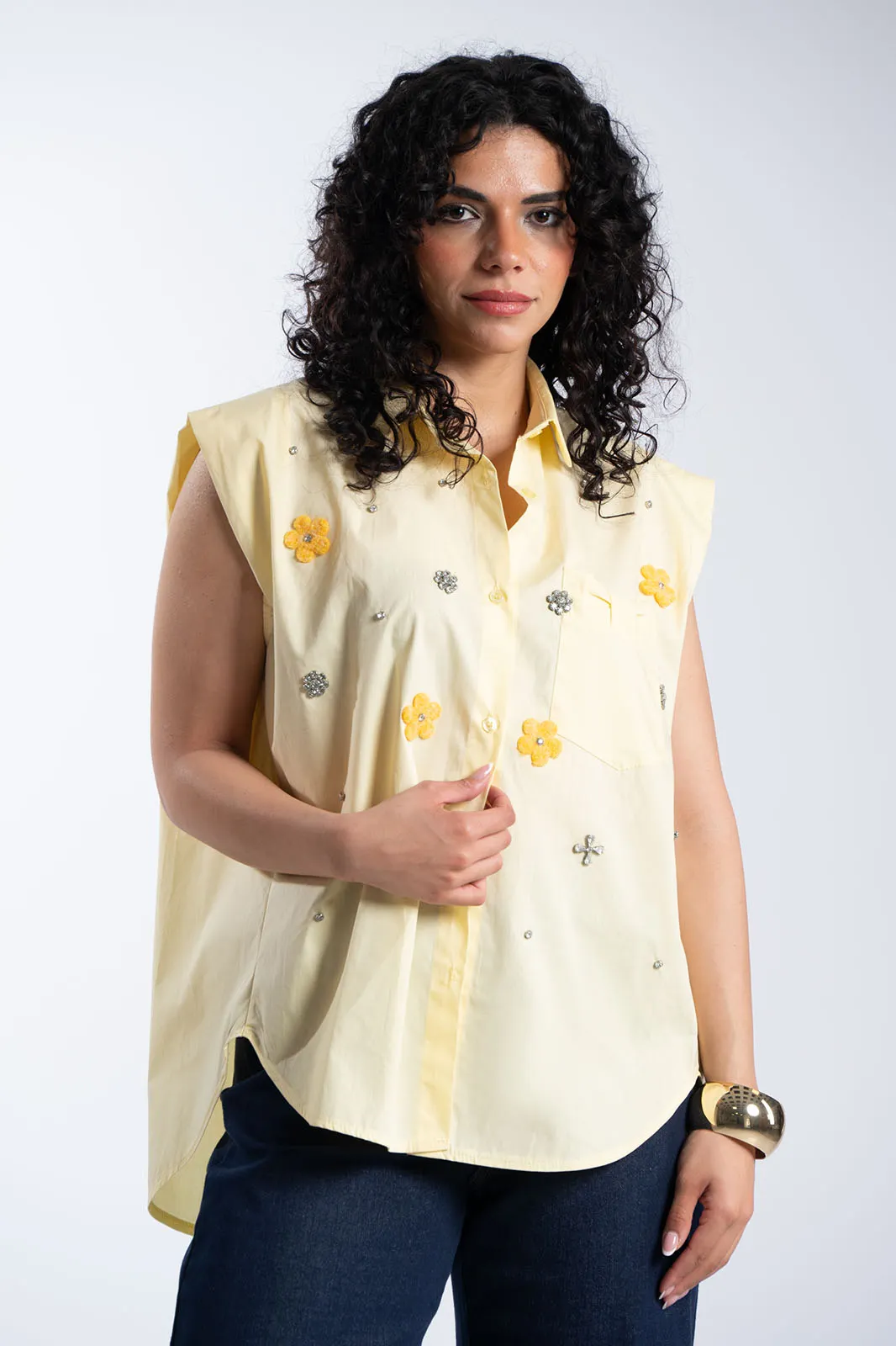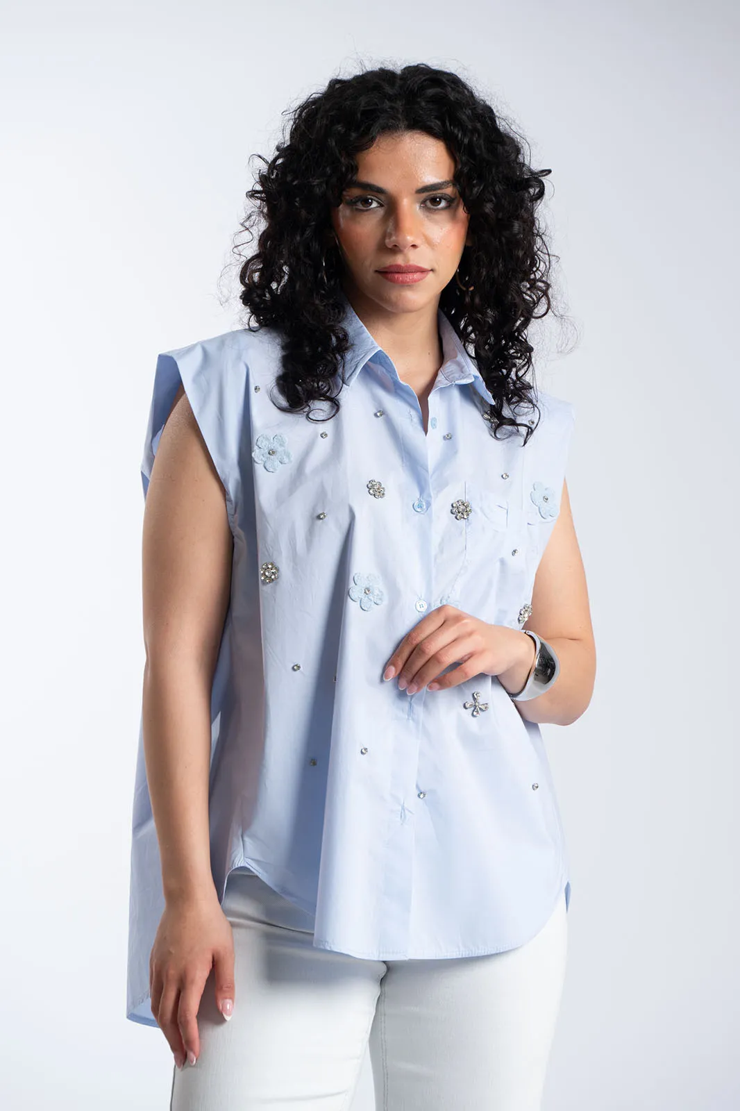 A breezy, loose-fitting shirt that combines comfort with a distinctive style. It features a collar and buttons down the front, while its loose fit allows for ease of movement and a contemporary look. It stands out thanks to decorative details featuring rhinestones and felt elements in the shape of flowers, which lend a more feminine and refined aesthetic without being over-the-top. The chest pocket adds practicality, while the overall design remains minimalist with small, distinctive touches that make it stand out. It is slightly longer in the back. It is ideal for everyday wear as well as for more polished looks, depending on how you style it.