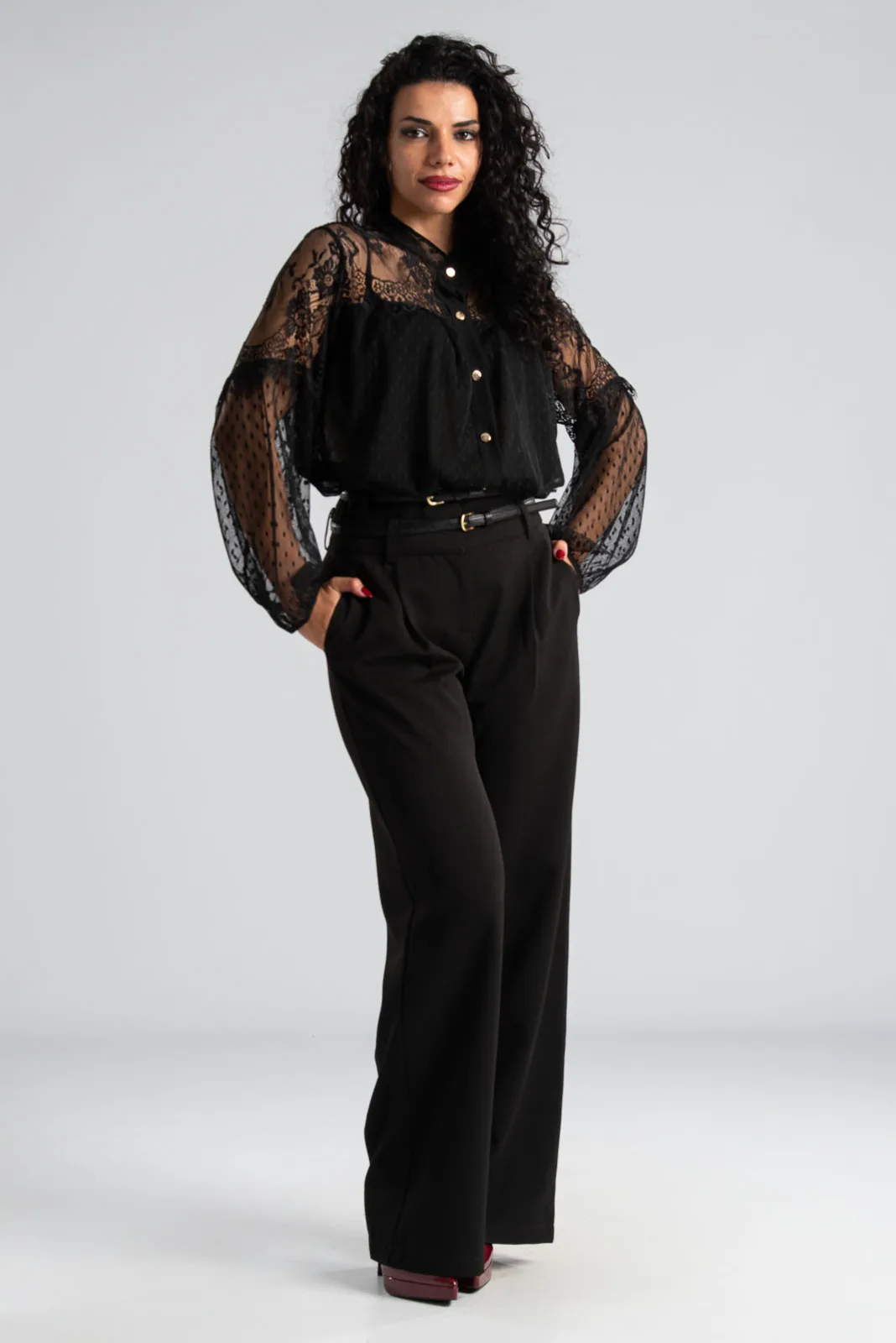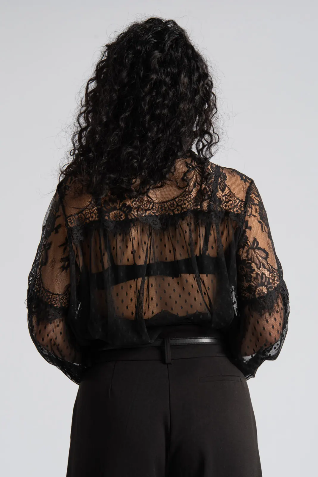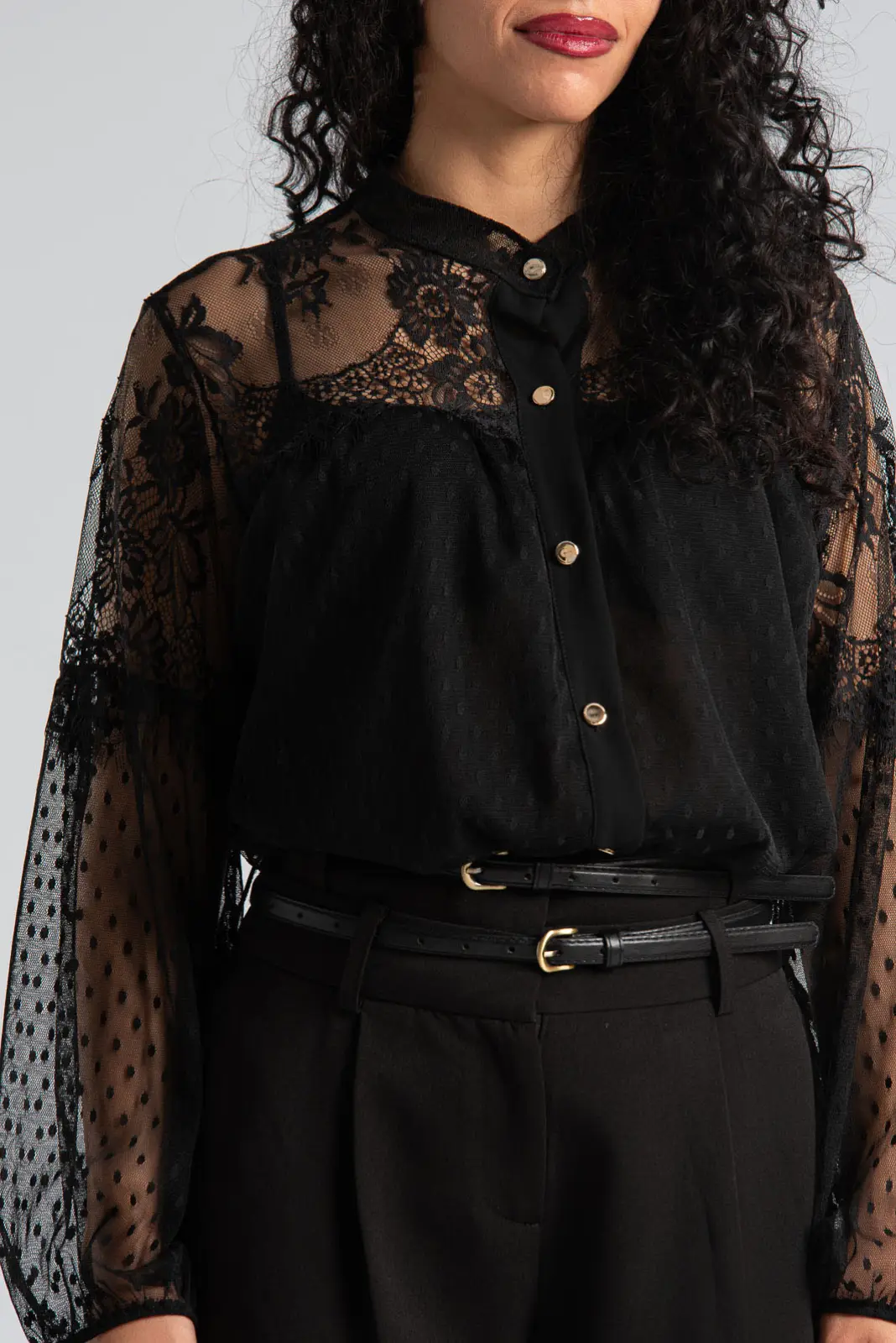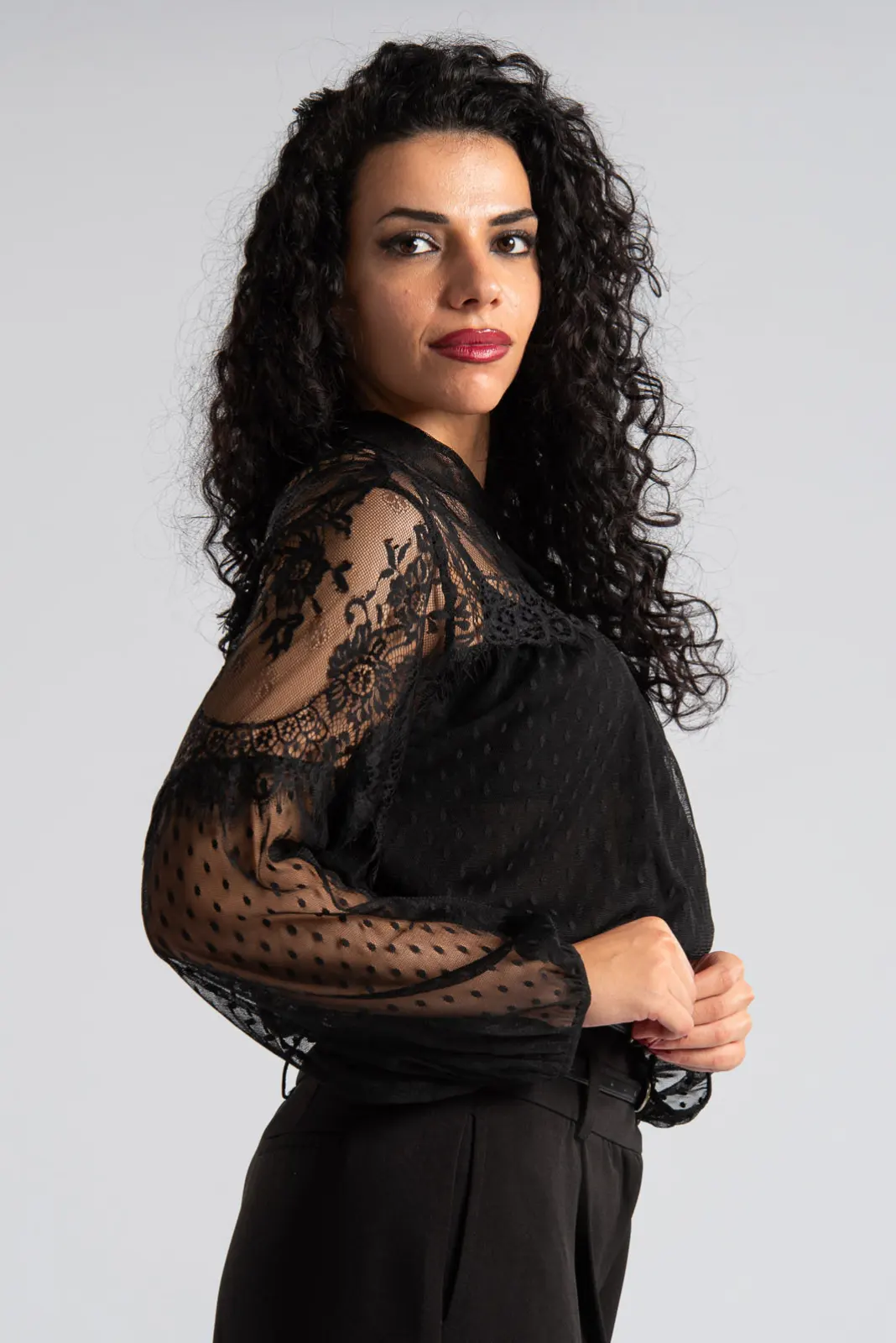 Πουκάμισο σε ίσια γραμμή. Στο πάνω μέρος, στους ώμους έχει δαντέλα και στο κάτω μέρος τούλι πουά. Στο μπροστινό μέρος είναι φοδραρισμένο. Έχει μακριά μανίκια και κλείνει με ασημένια κουμπιά. Στο τελείωμα των μανικιών διαθέτει λάστιχο για καλύτερη εφαρμογή. Οι μετρήσεις του πίνακα είναι αντιπροσωπευτικές για κάθε προϊόν. 100% polyester.