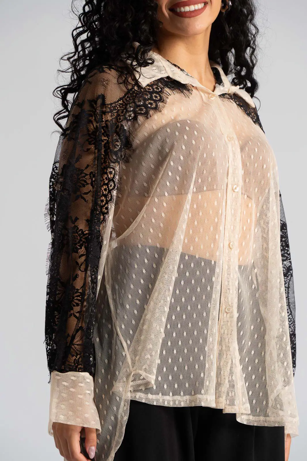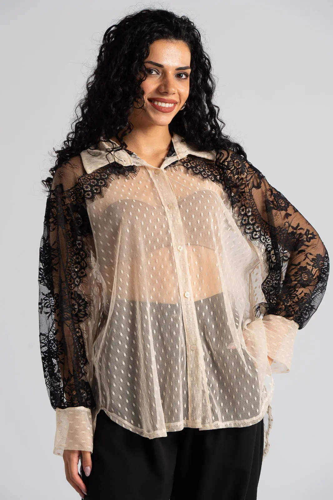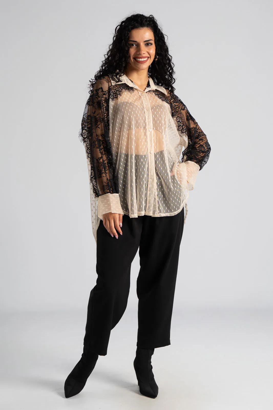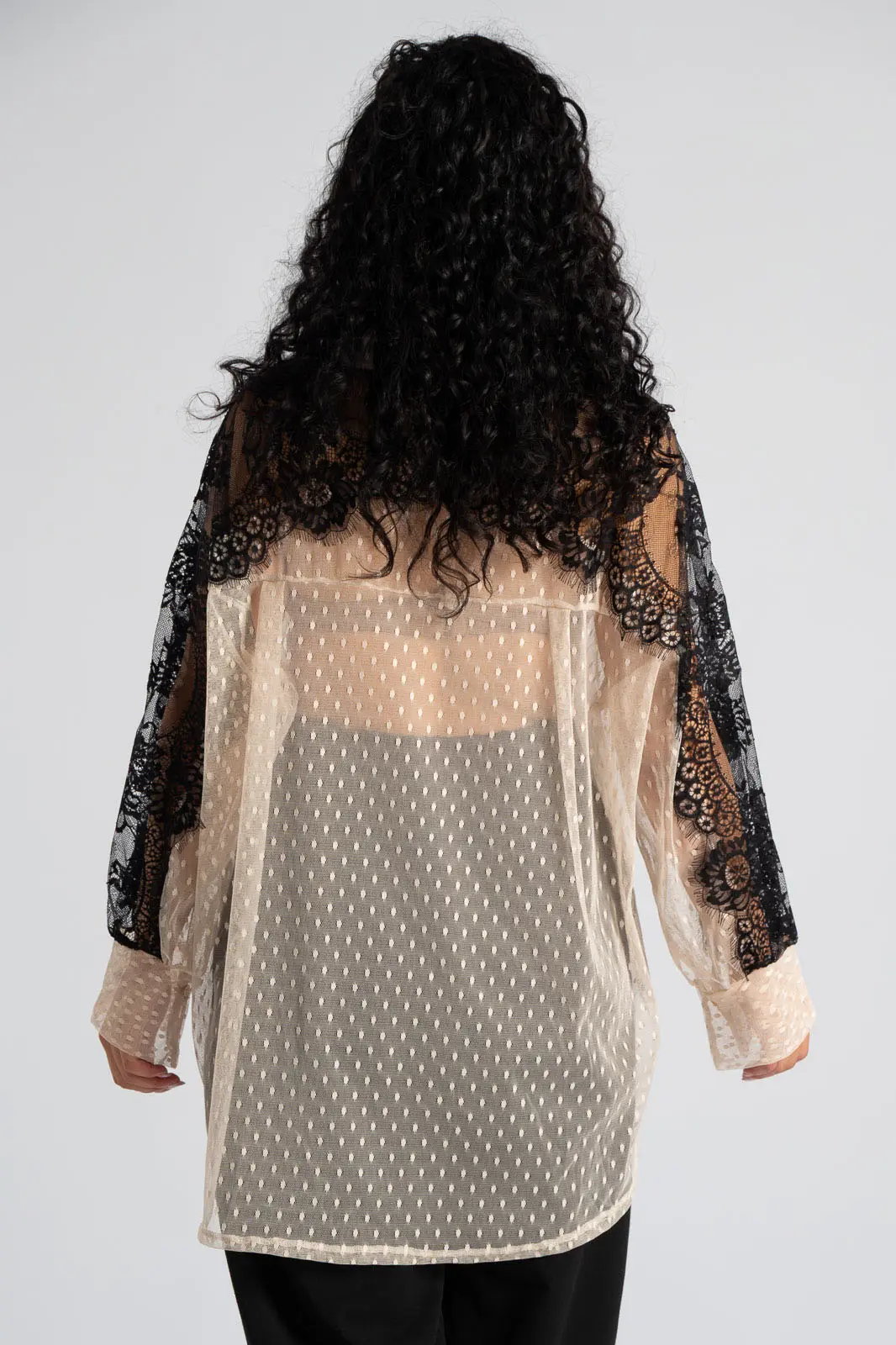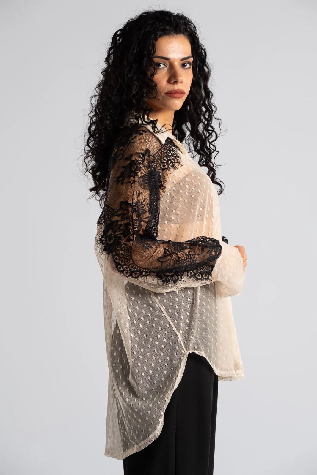 Πουκάμισο με γιακά. Διαθέτει μακριά μανίκια που καταλήγουν σε κουμπί. Είναι ελαφρώς c-throu σε όλη την επιφάνεια και έχει πουά σχέδιο. Στο επάνω μέρος στους ώμους έχει διακοσμητική δαντέλα και καταλήγει στα μανίκια. Στο πίσω μέρος έχει πιέτες. Οι μετρήσεις του πίνακα είναι αντιπροσωπευτικές για κάθε προϊόν. 100% polyester.