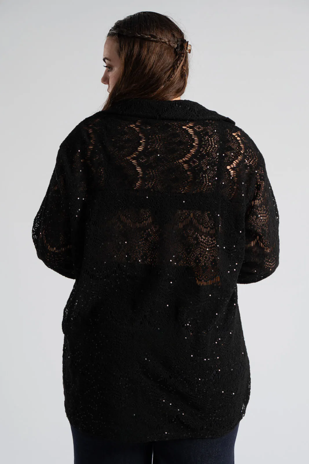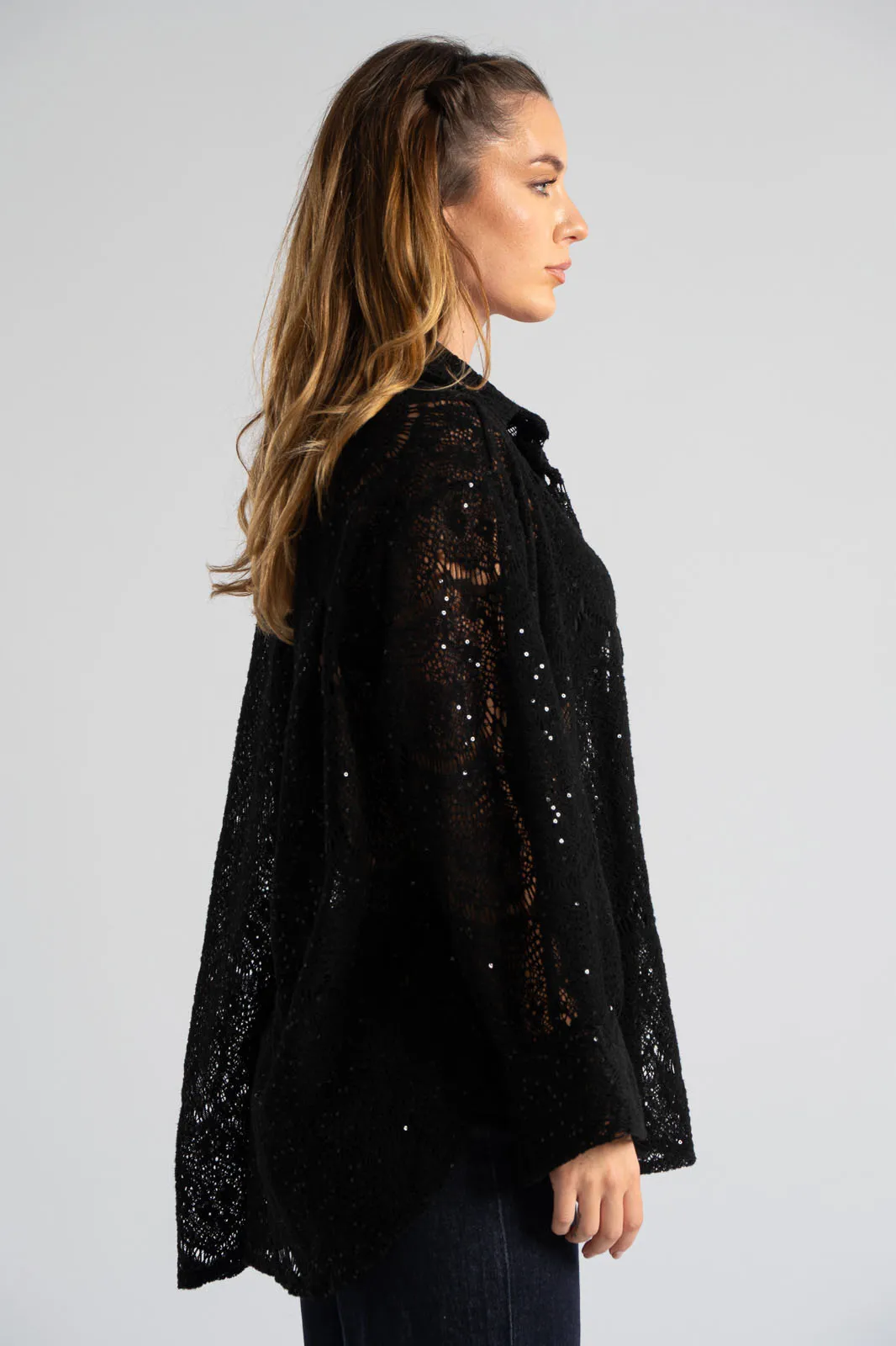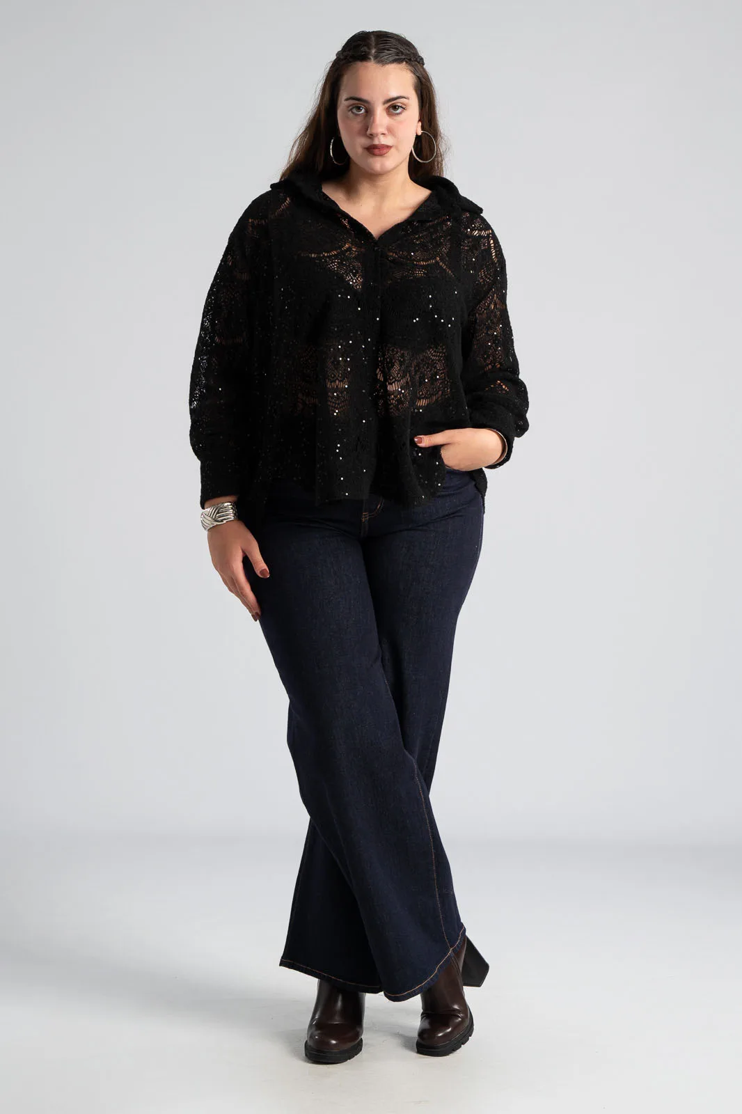 Perforated shirt decorated with sequins all over. It has long sleeves. It has a straight cut and is longer at the back. The measurements in the table are representative for each code. 100% polyester.