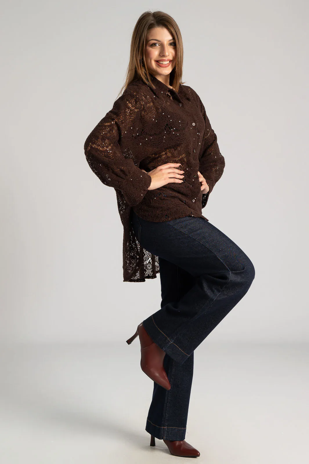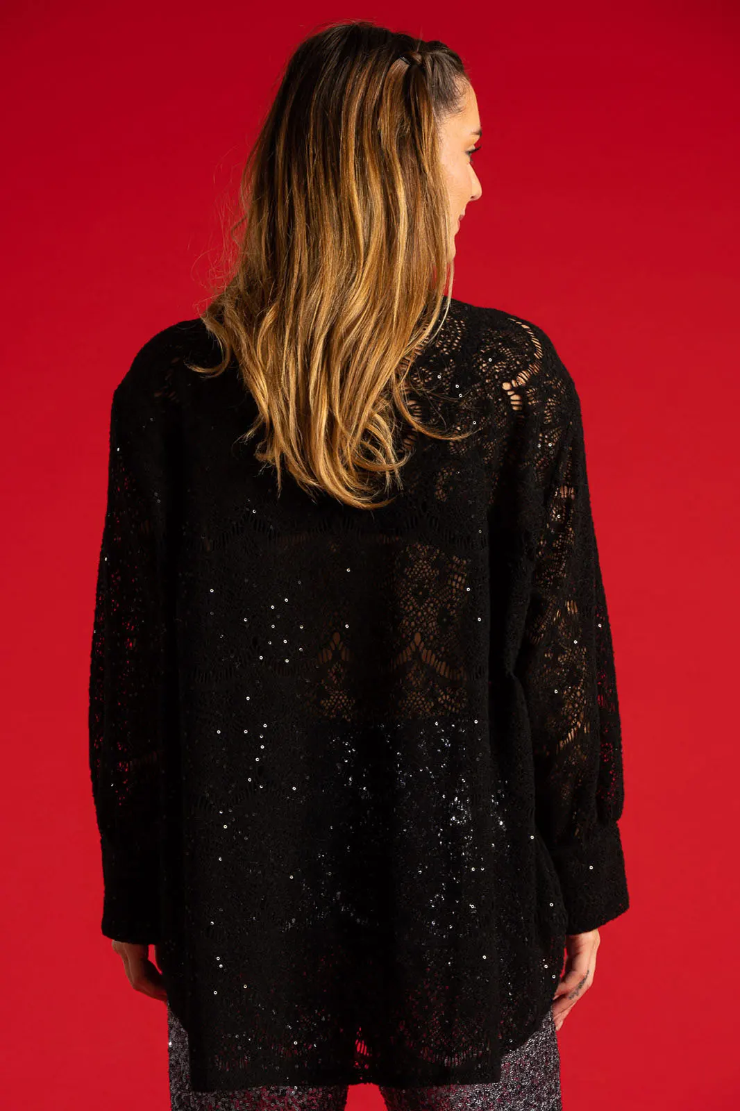 Perforated shirt decorated with sequins all over. It has long sleeves. It has a straight cut and is longer at the back. The measurements in the table are representative for each code. 100% polyester.