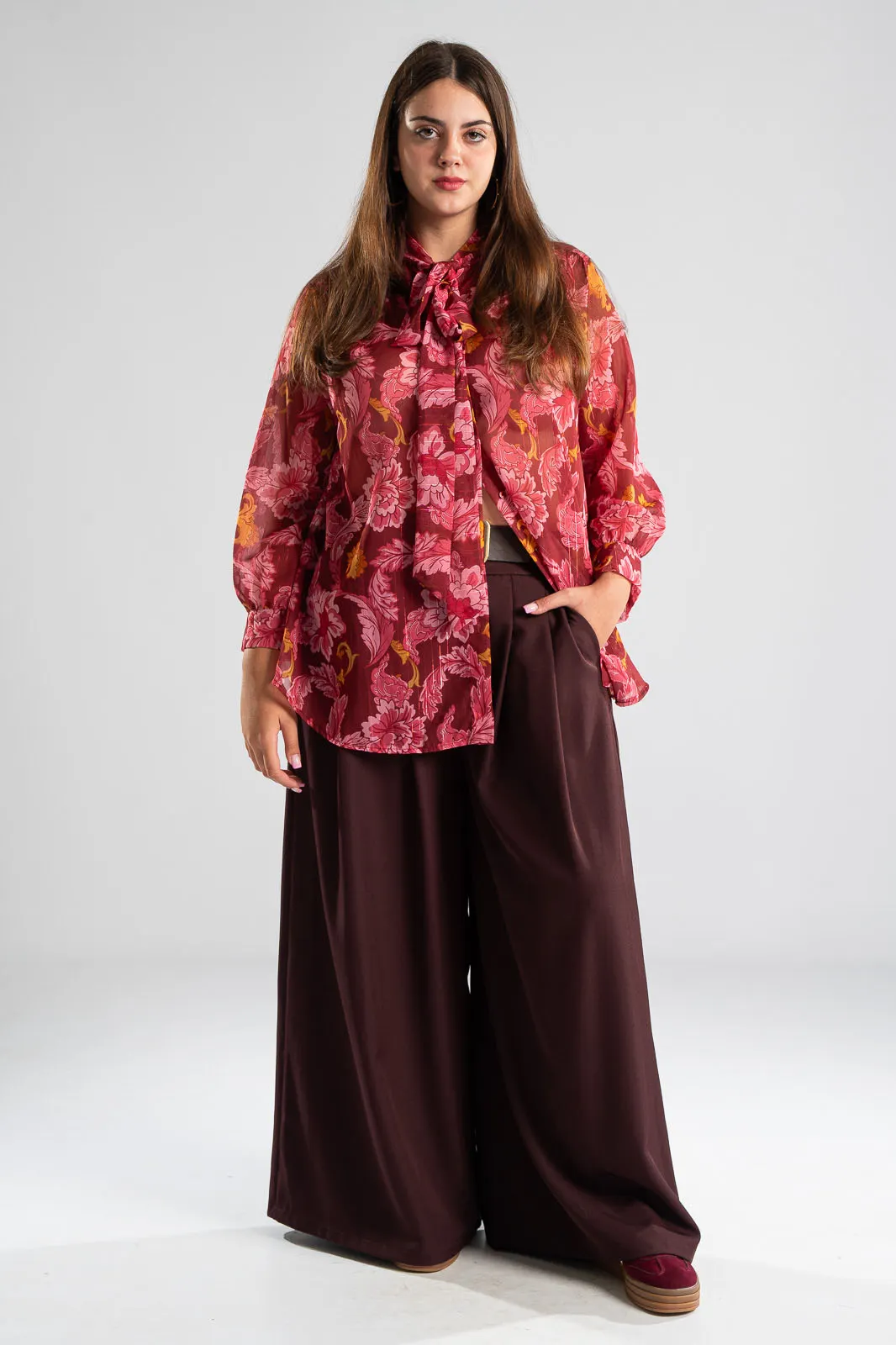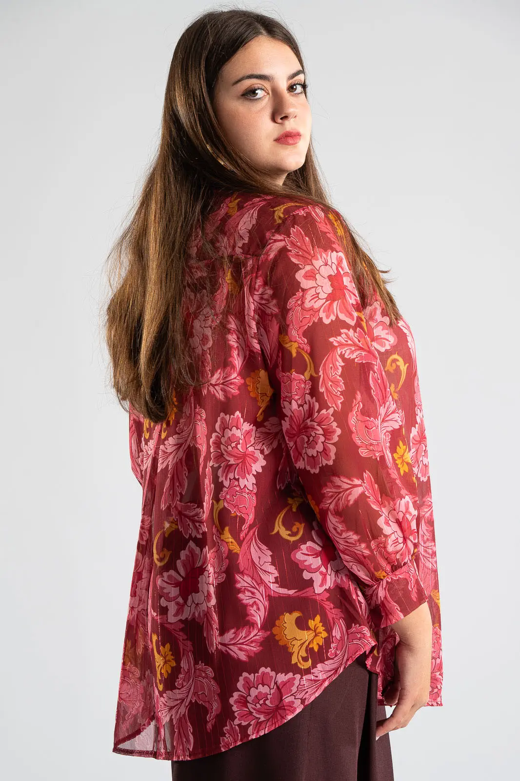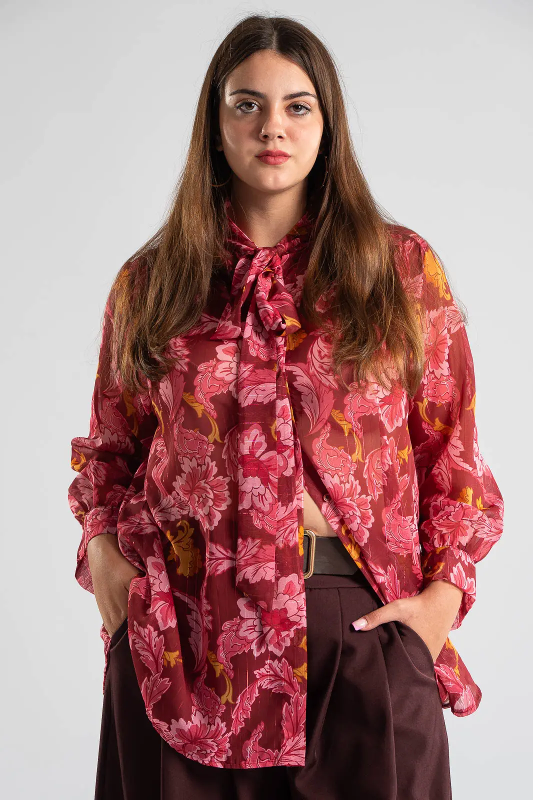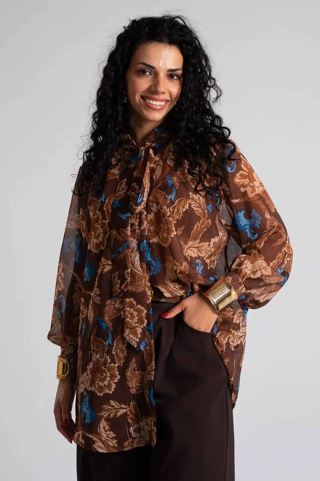 Slightly sheer shirt with a straight cut. It has a floral print and subtle gold thread throughout. It has long sleeves and button closures. It has a round neckline and ties at the front of the neck. It has a pleat at the back. The measurements in the table are representative for each code. 95% polyester, 5% lurex.