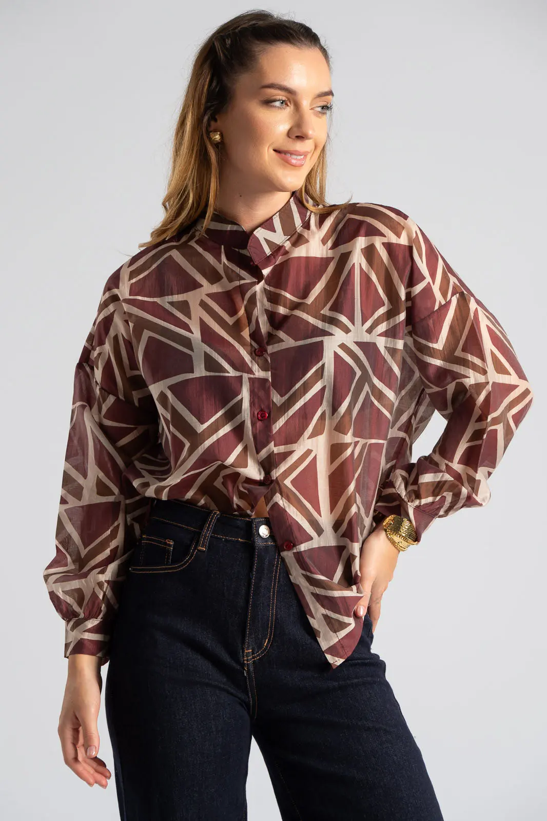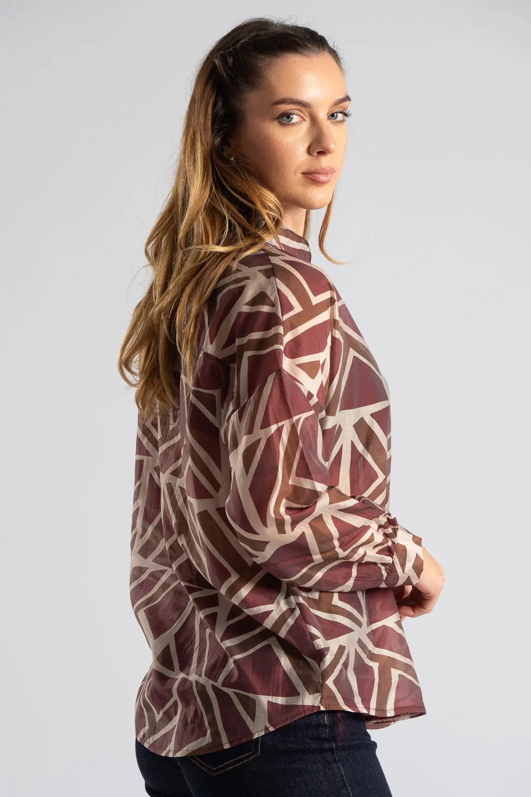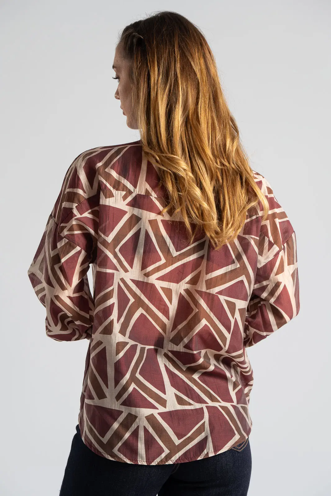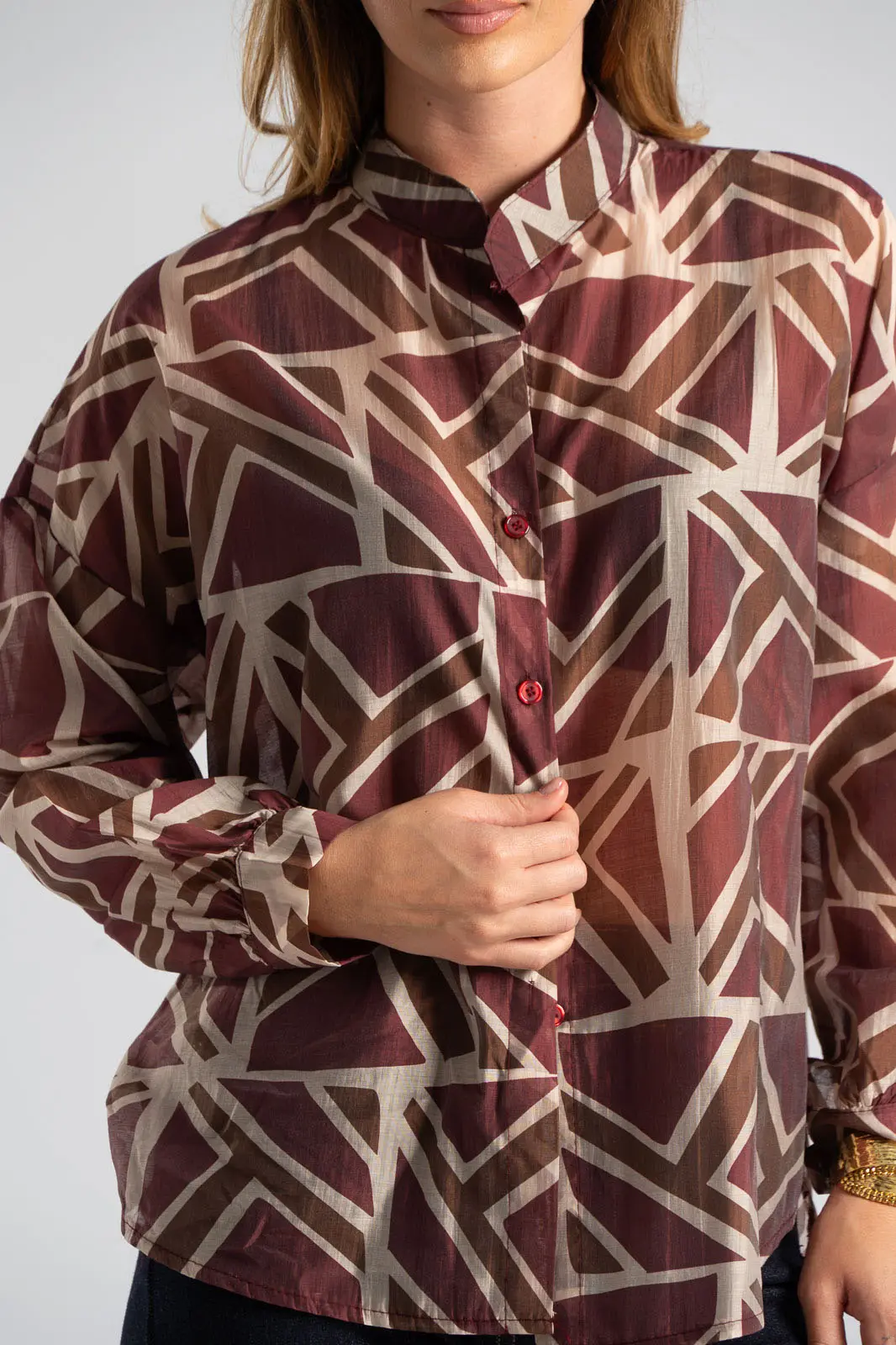 Πουκάμισο με mao γιακά. Διαθέτει μακριά μανίκια και είναι σε ίσια γραμμή. Σε όλη την επιφάνεια του διαθέτει γεωμετρικά σχέδια και είναι ελαφρώς c-throu. Στο μπροστινό μέρος είναι ελαφρώς πιο κοντό. Οι μετρήσεις του πίνακα είναι αντιπροσωπευτικές για κάθε κωδικό. 85% tencel, 15% polyester.