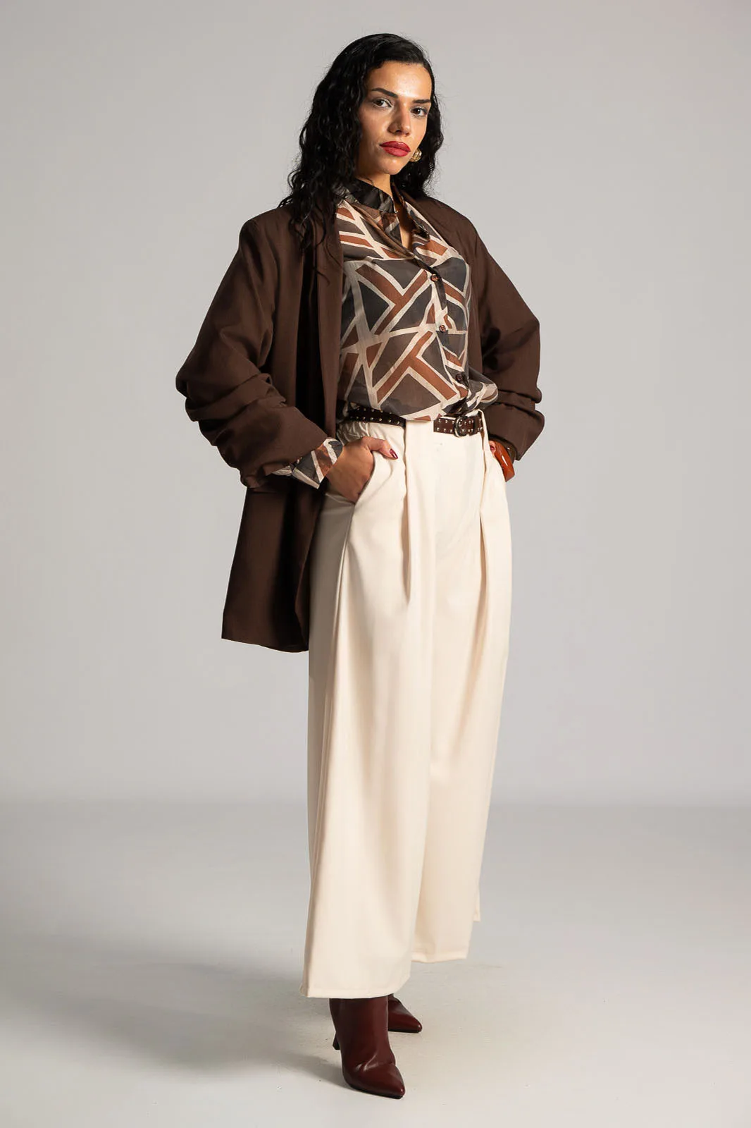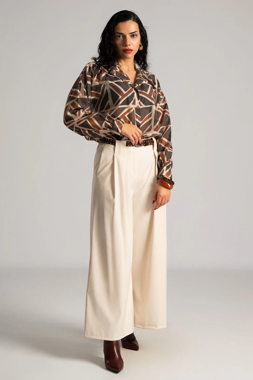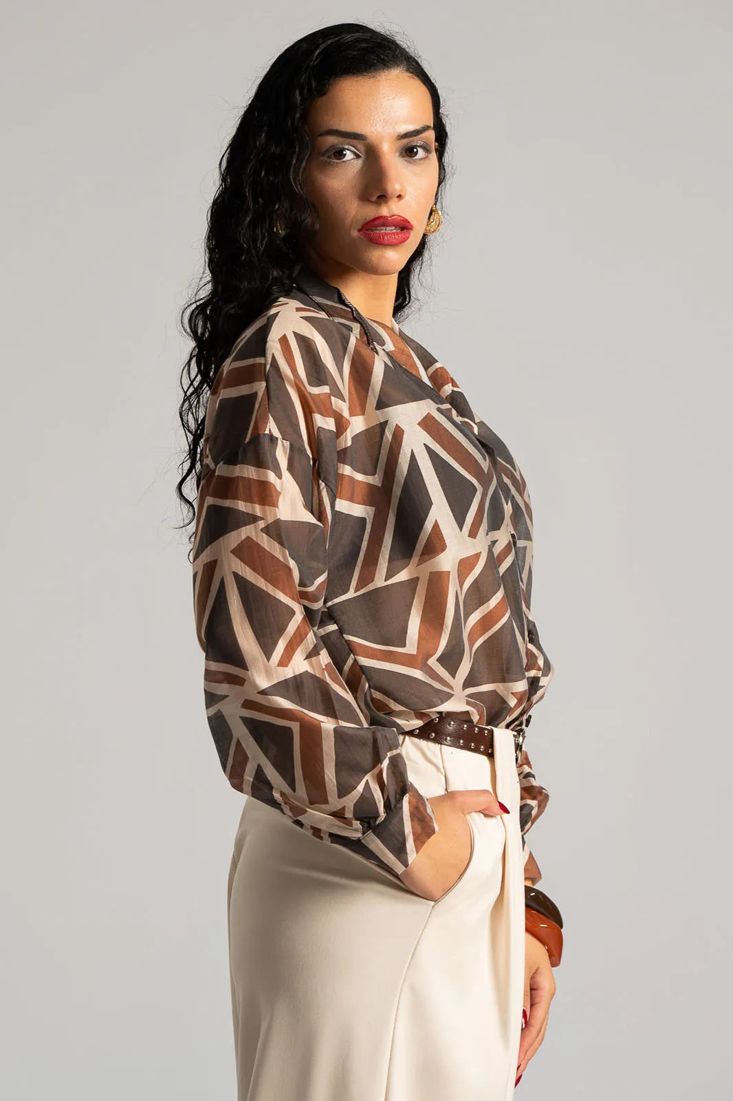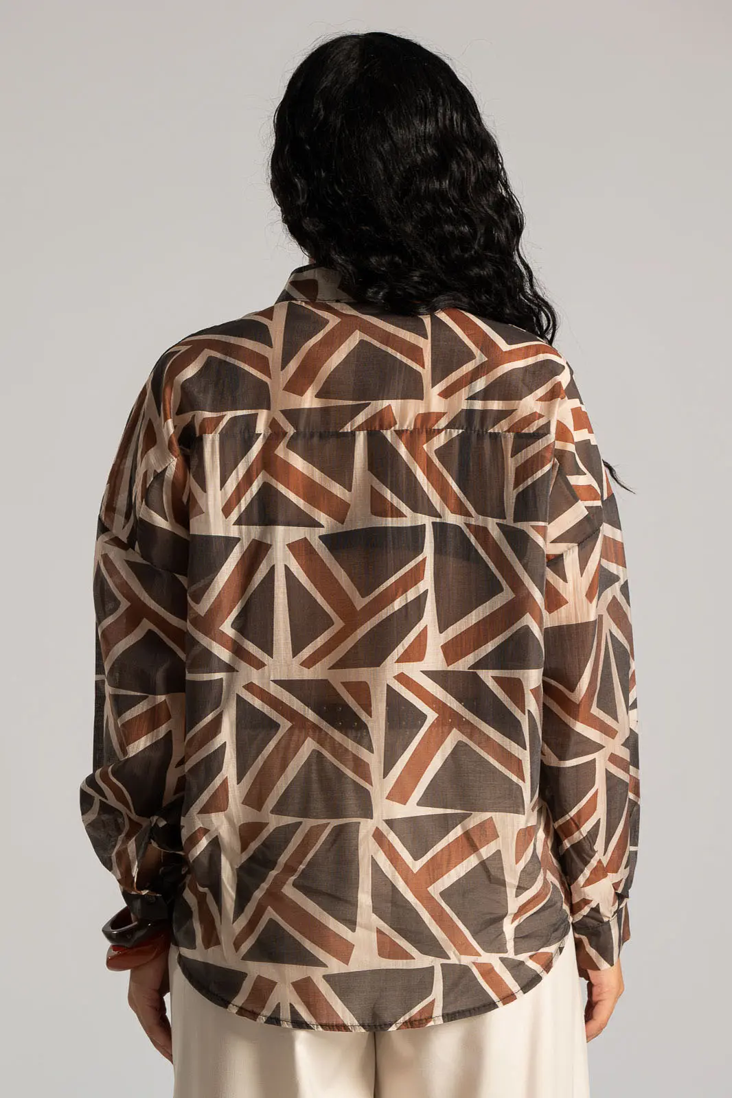 Shirt with a mao collar. It has long sleeves and a straight cut. It features geometric patterns across the entire surface and is slightly see-through. It is slightly shorter at the front. The measurements in the table are representative for each code. 85% tencel, 15% polyester.