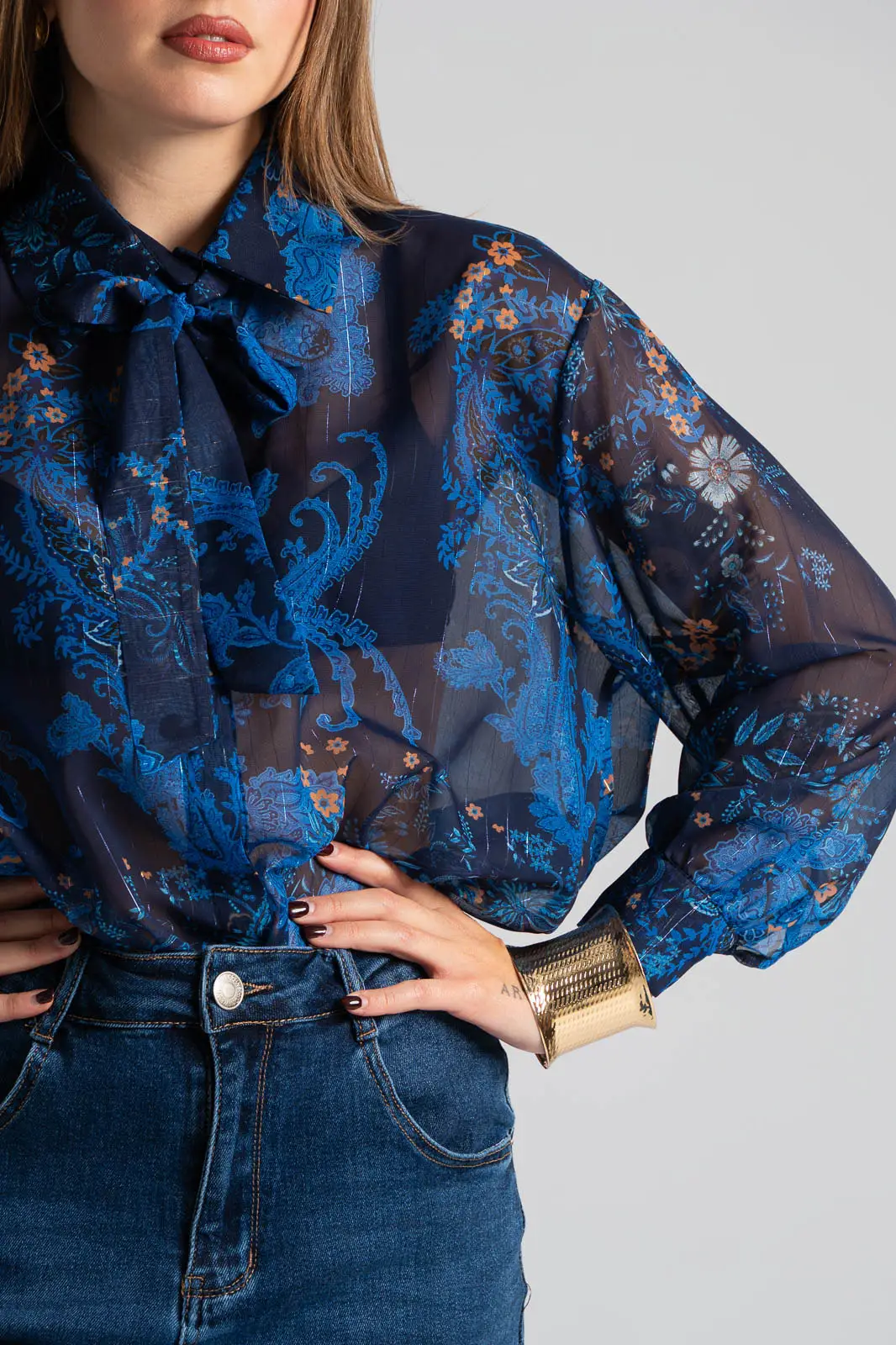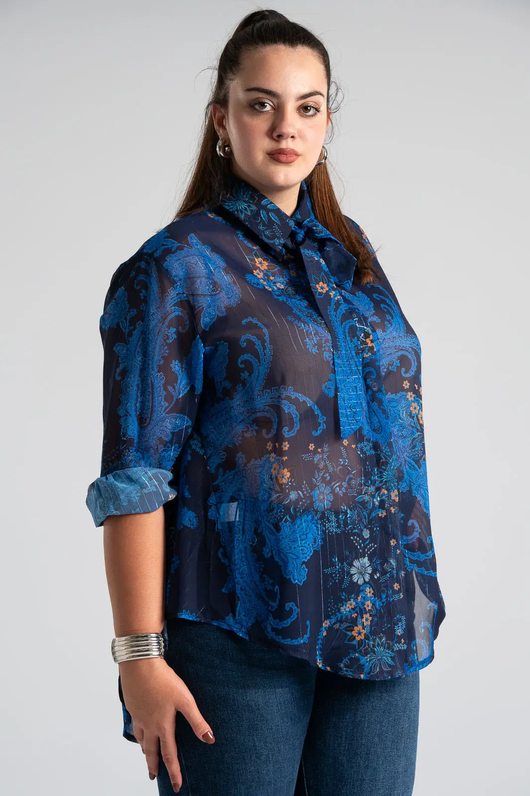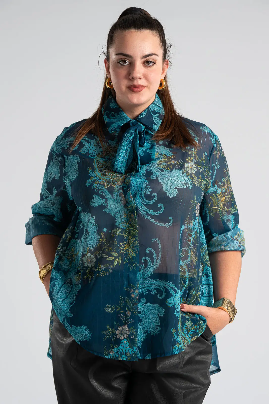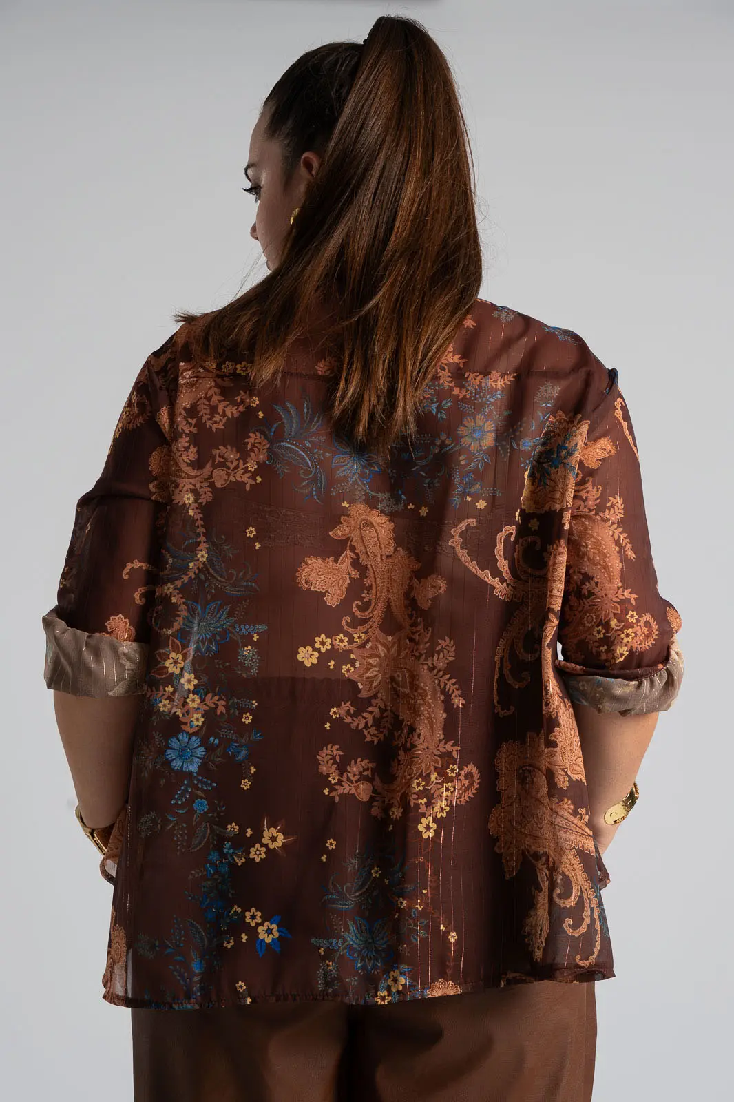 Shirt with collar and buttons. The buttons are covered with a patelette. It has long sleeves that end in a button. The entire surface is slightly c-throu and features gold thread. It has a tie in the same shade and texture. The back is longer. The measurements in the table are representative for each code. 95% polyester, 5% lurex.