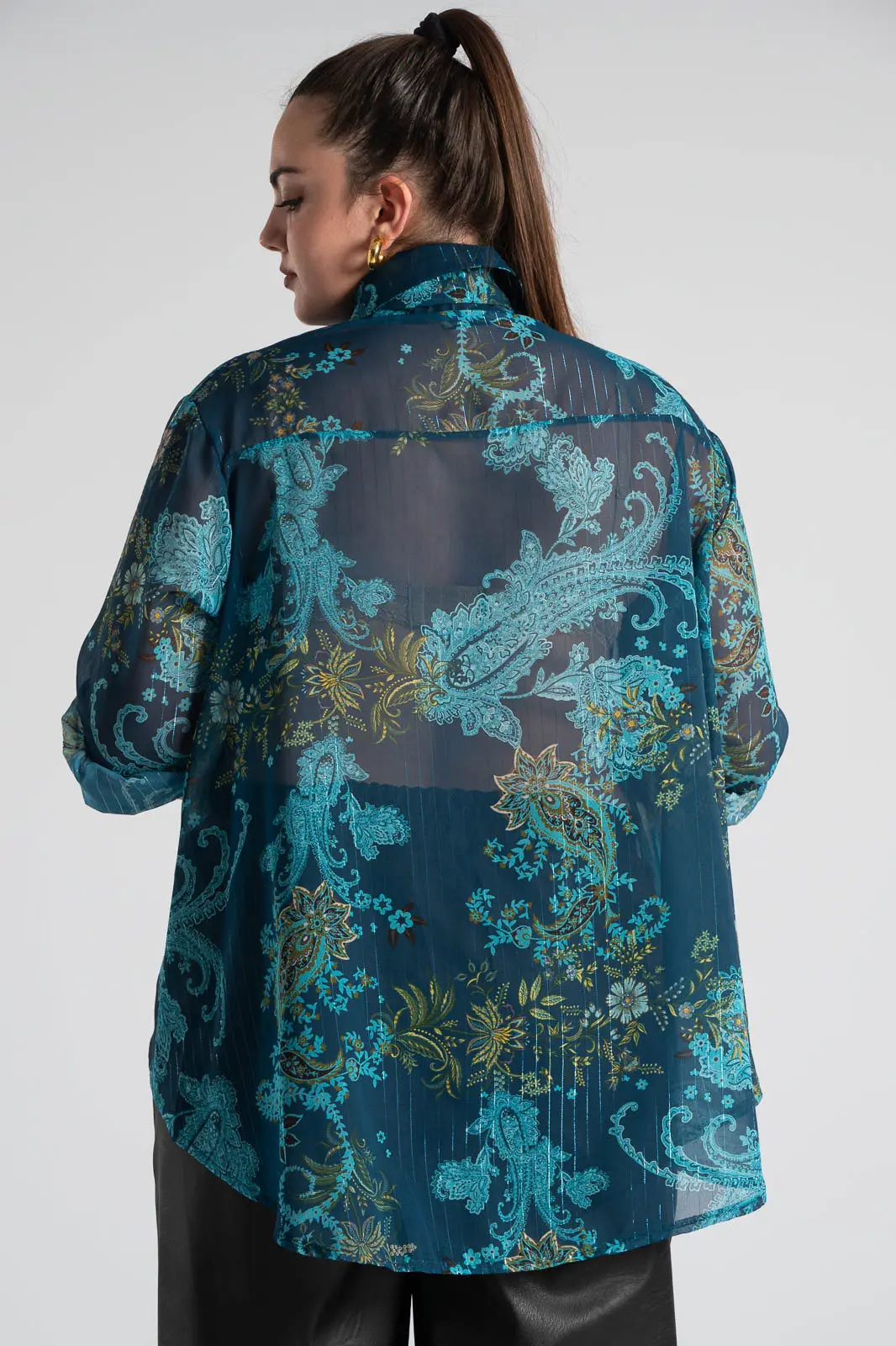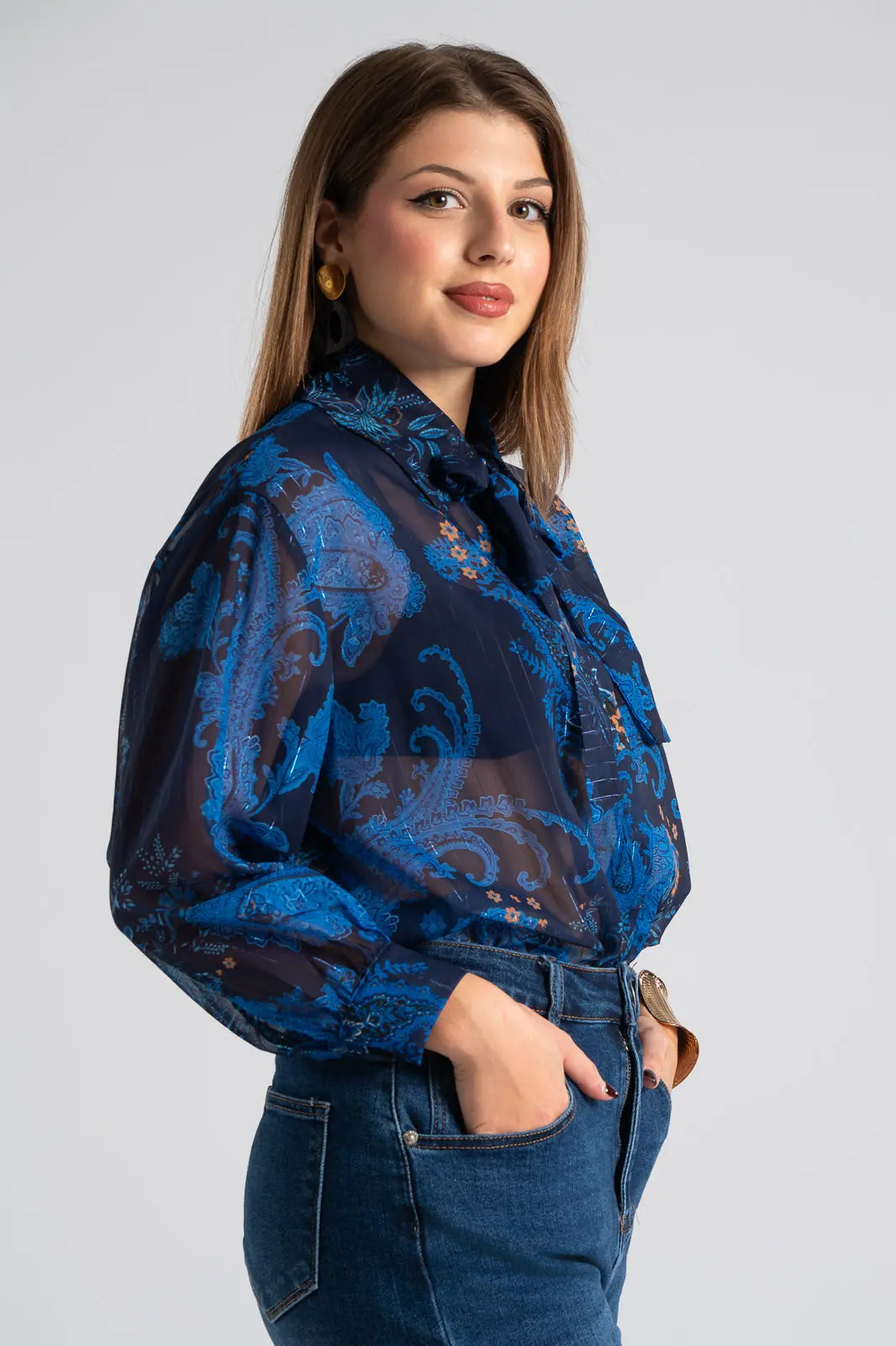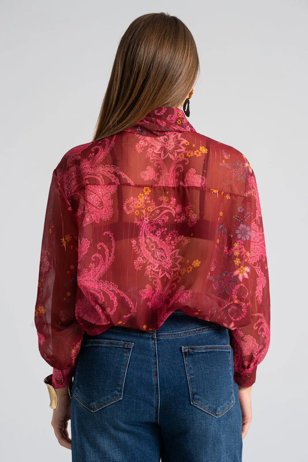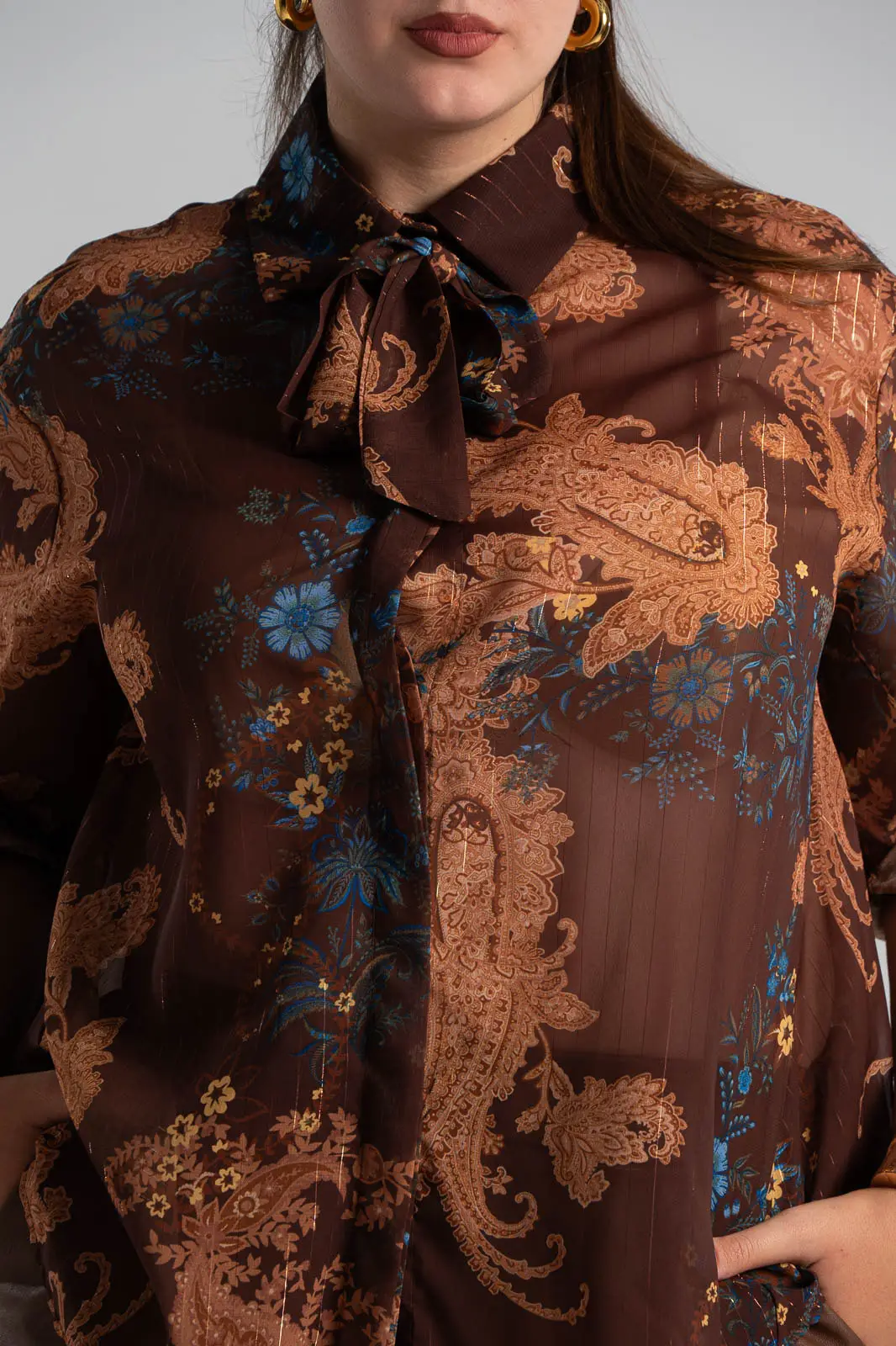 Shirt with collar and buttons. The buttons are covered with a patelette. It has long sleeves that end in a button. The entire surface is slightly c-throu and features gold thread. It has a tie in the same shade and texture. The back is longer. The measurements in the table are representative for each code. 95% polyester, 5% lurex.