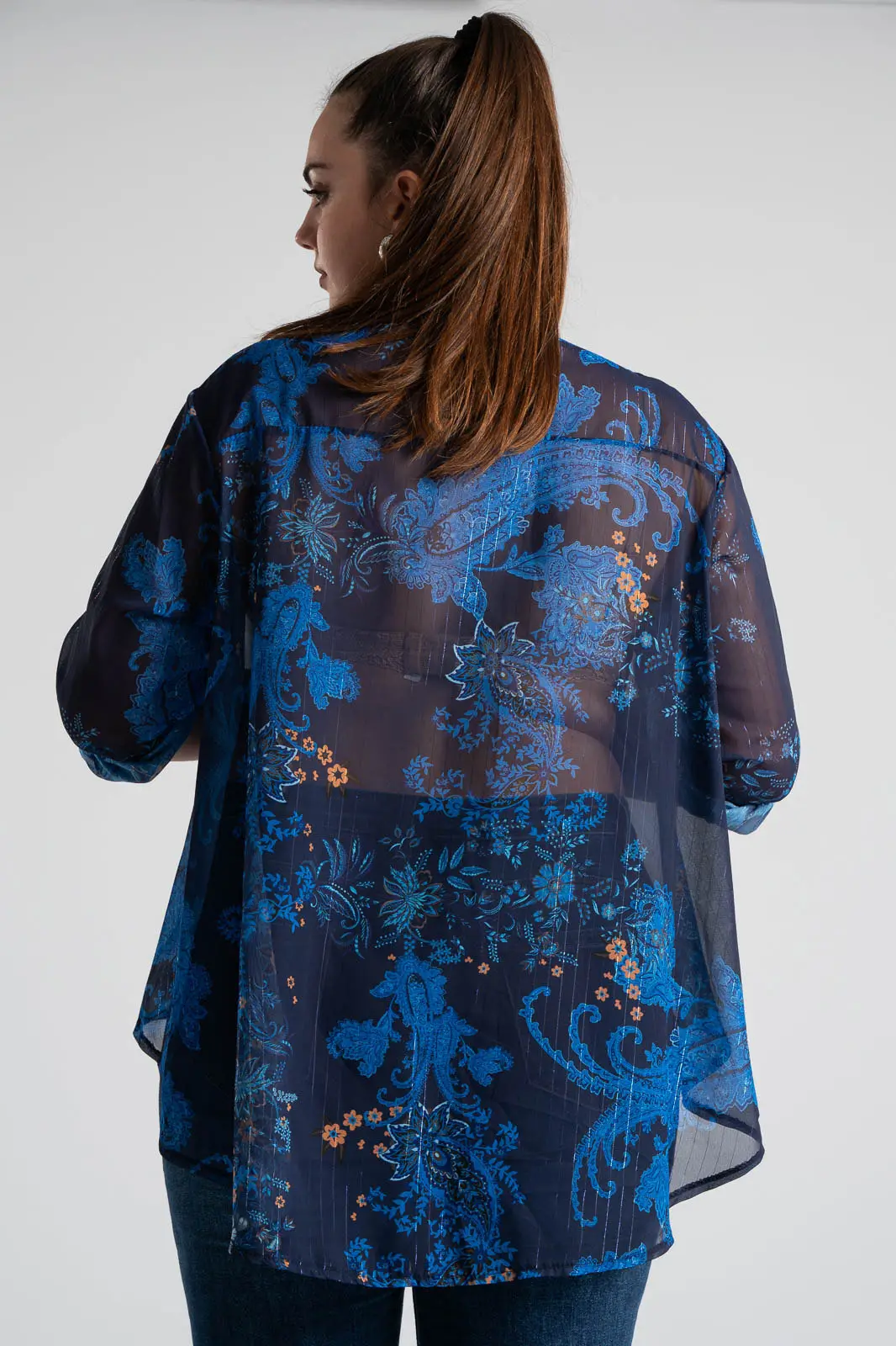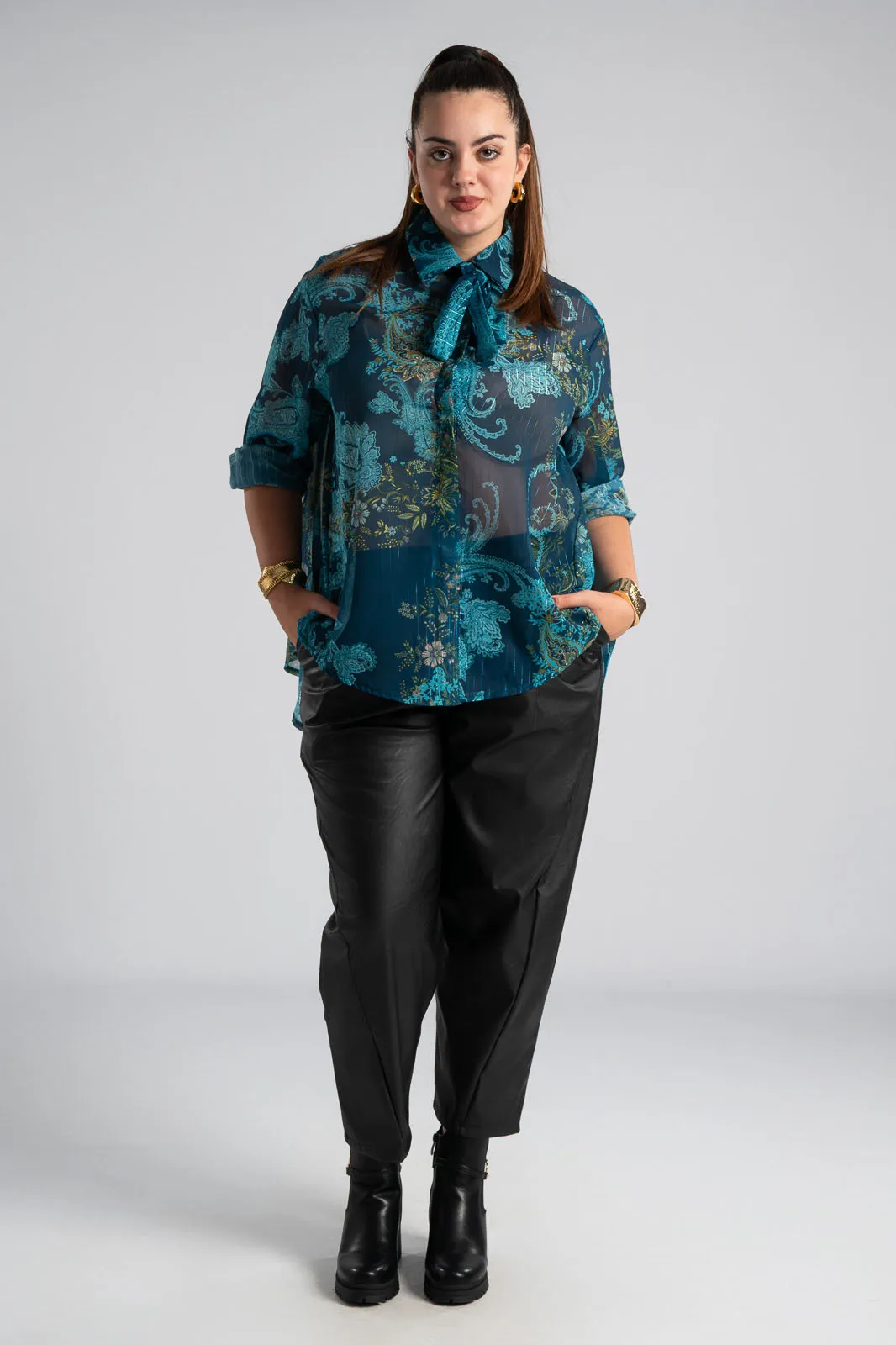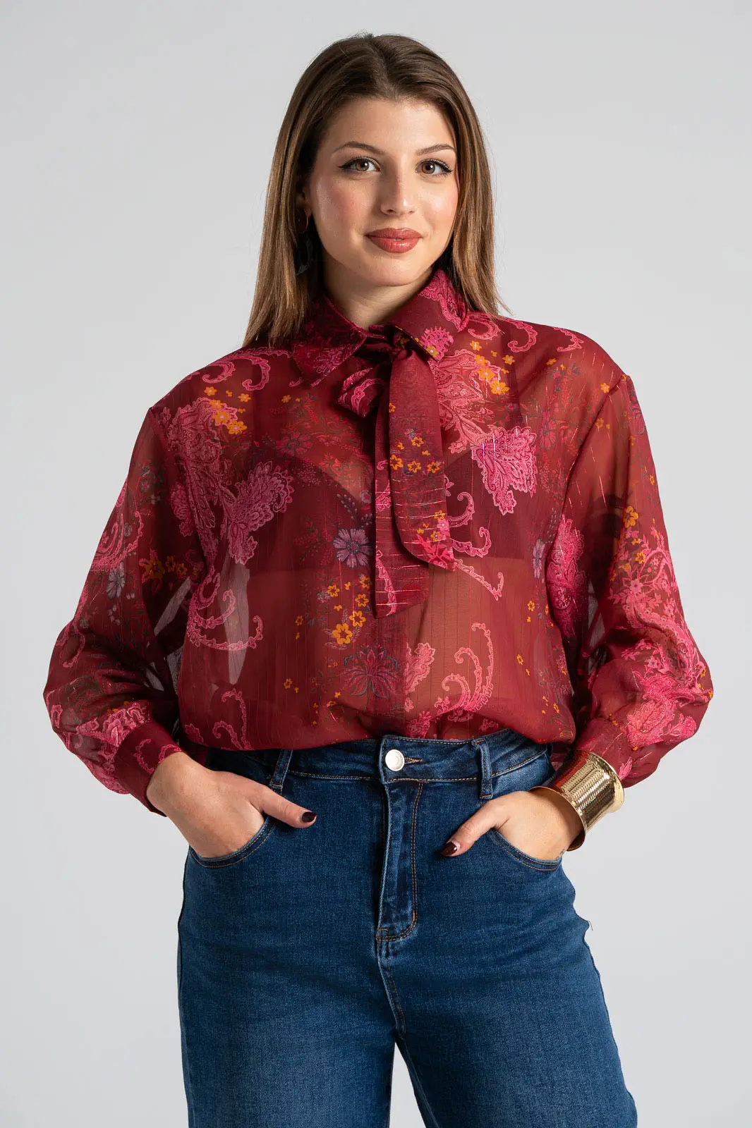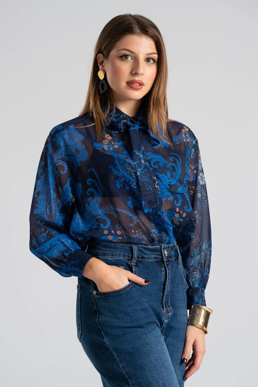 Shirt with collar and buttons. The buttons are covered with a patelette. It has long sleeves that end in a button. The entire surface is slightly c-throu and features gold thread. It has a tie in the same shade and texture. The back is longer. The measurements in the table are representative for each code. 95% polyester, 5% lurex.