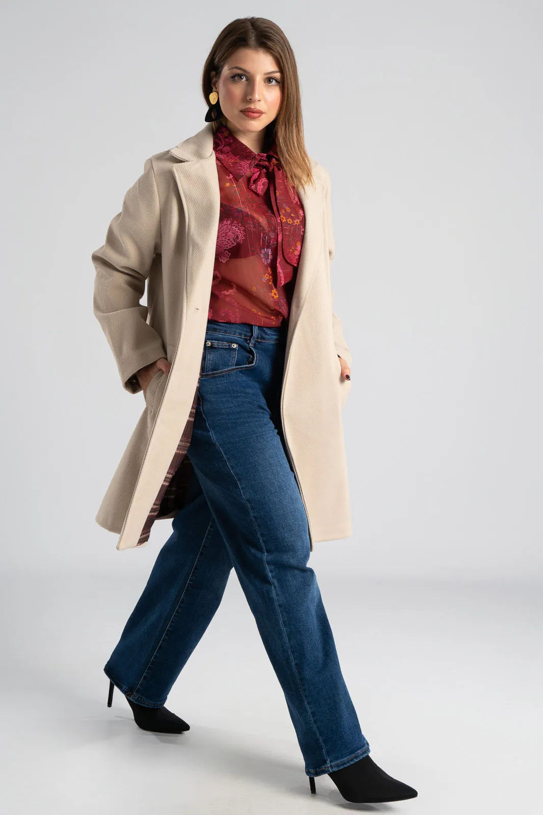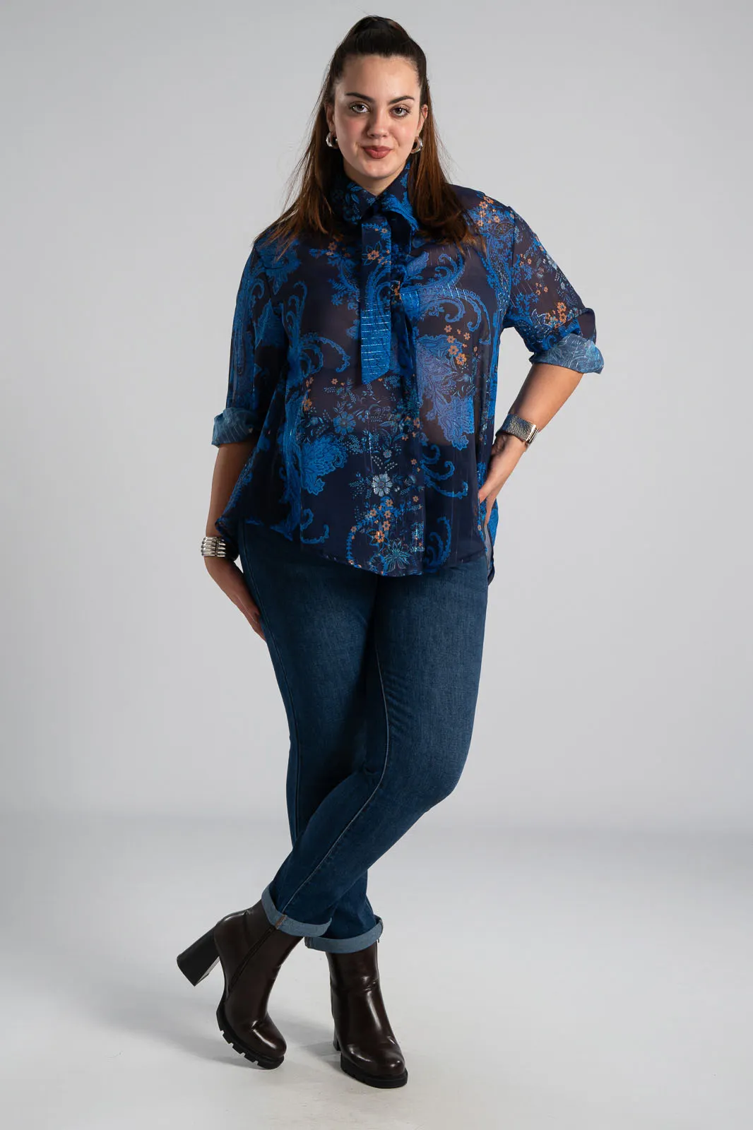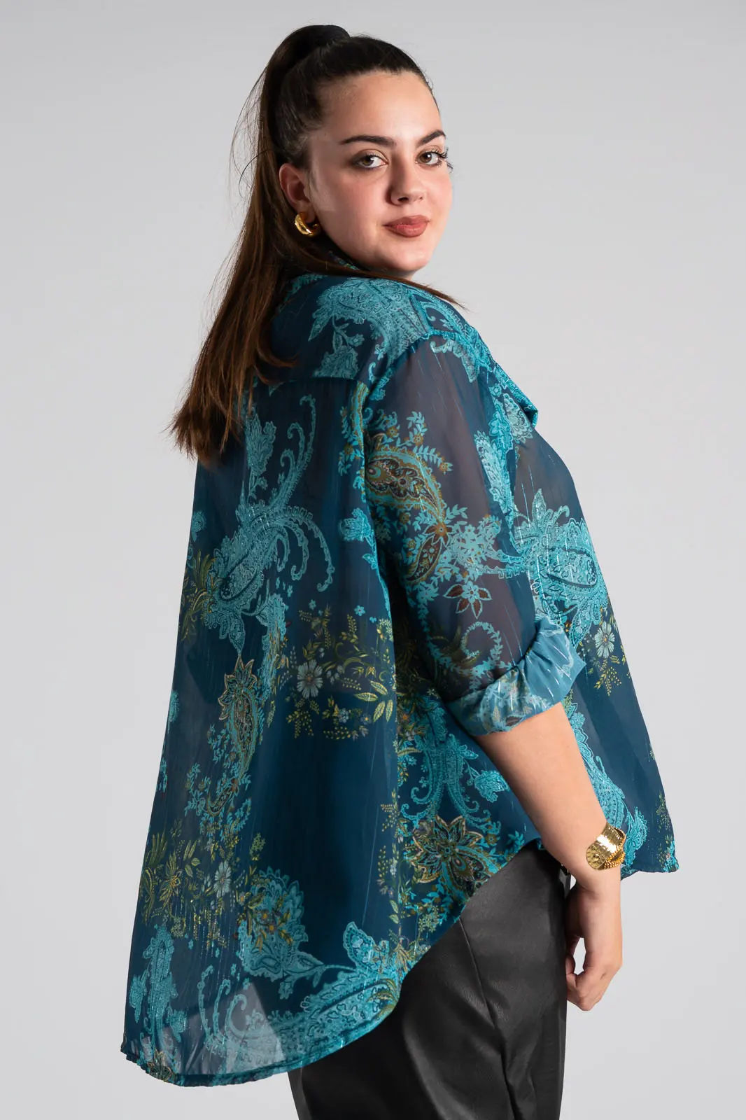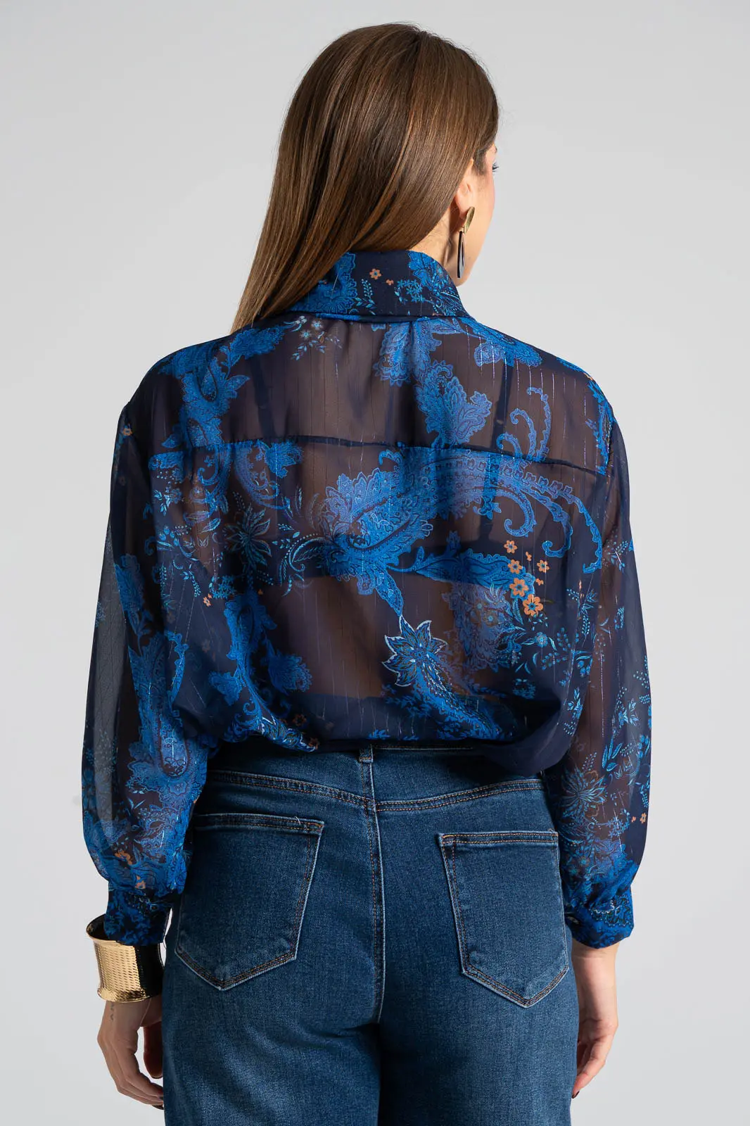 Shirt with collar and buttons. The buttons are covered with a patelette. It has long sleeves that end in a button. The entire surface is slightly c-throu and features gold thread. It has a tie in the same shade and texture. The back is longer. The measurements in the table are representative for each code. 95% polyester, 5% lurex.