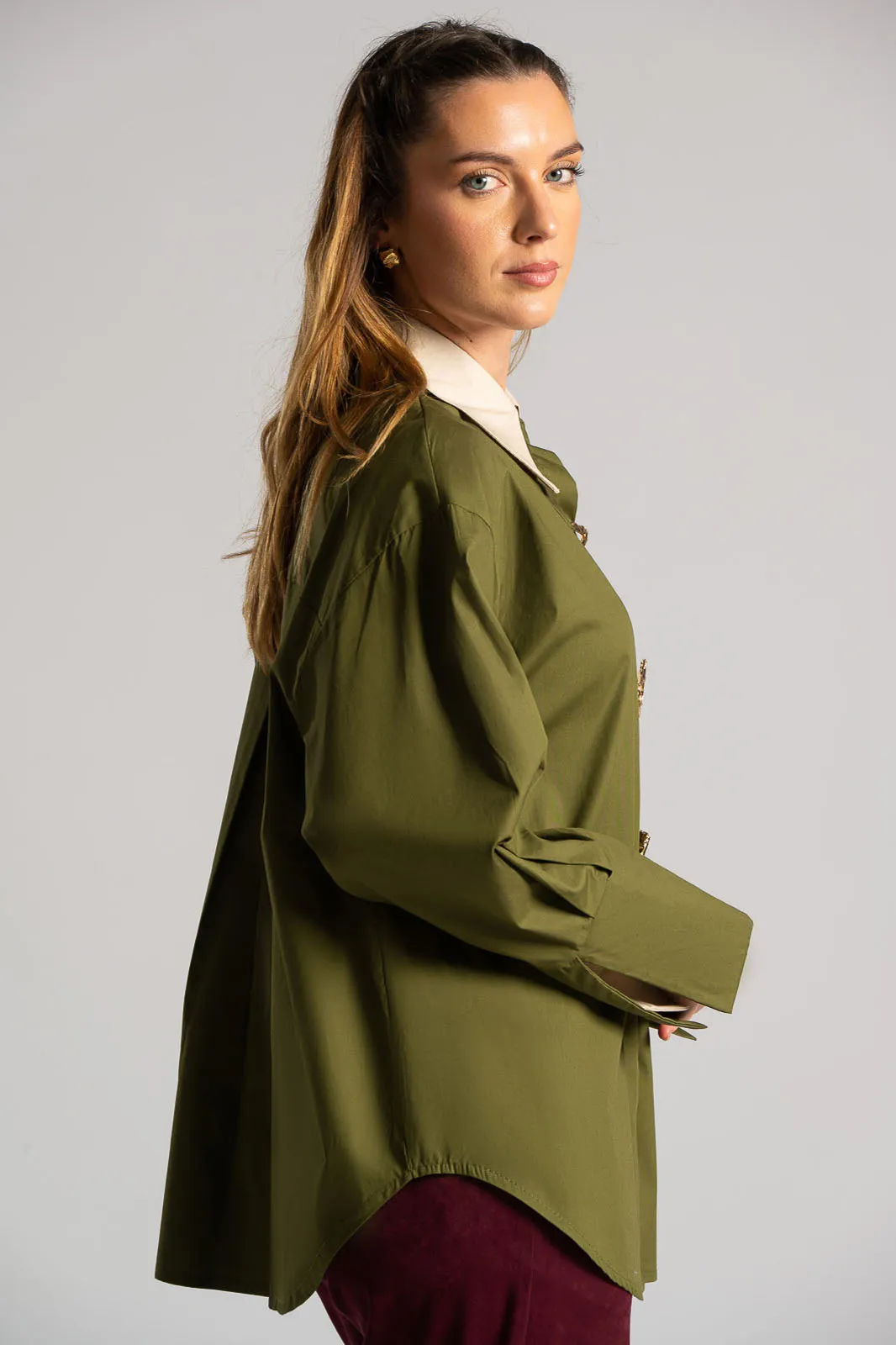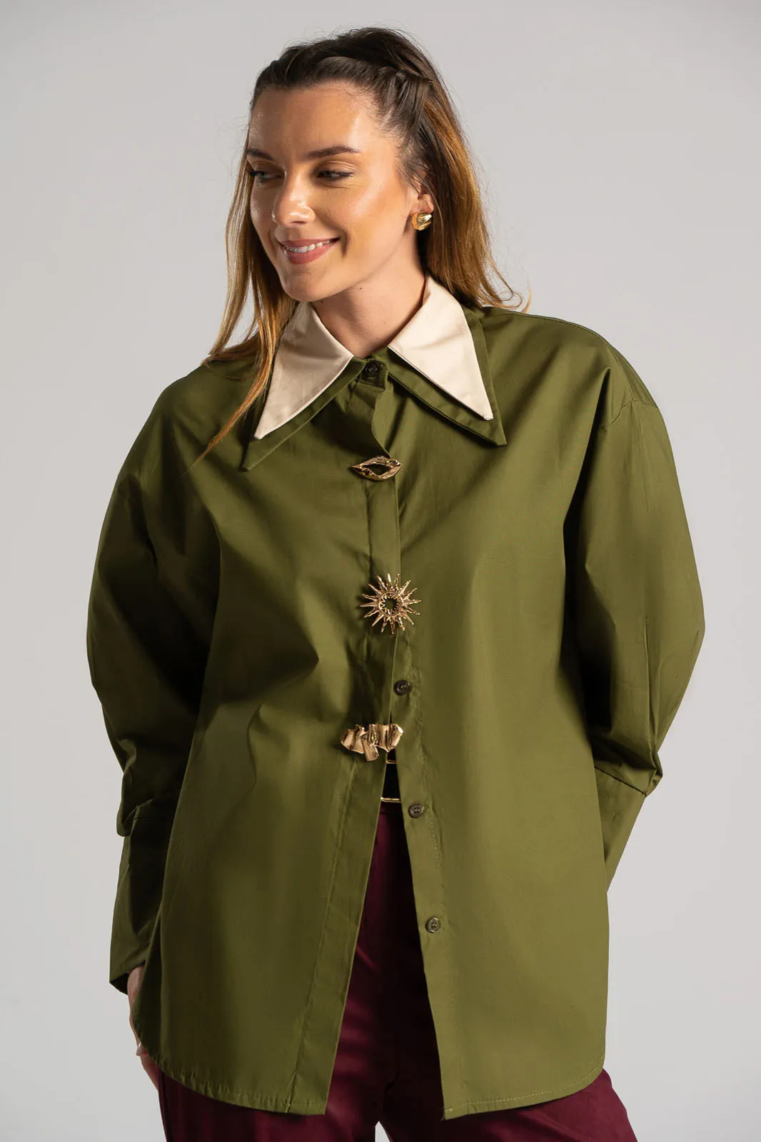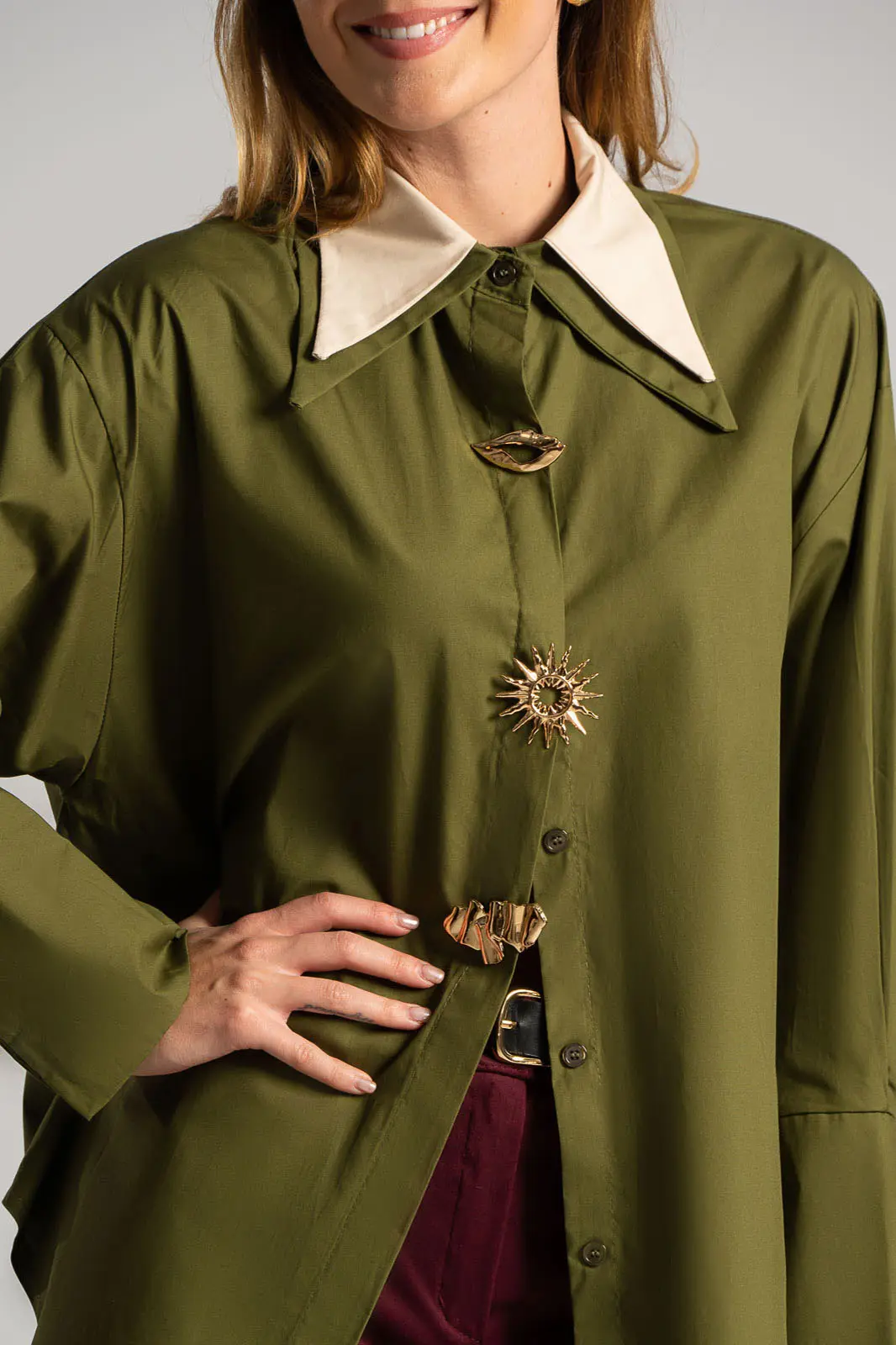 Cotton shirt with collar and long sleeves, featuring a small opening at the hem. It fastens with buttons covered with pateleta and has decorative removable pins. The collar and cuffs have extra fabric in a different shade on the inside. It has a pleat at the back and is longer. The measurements in the table are representative for each code. 100% cotton.