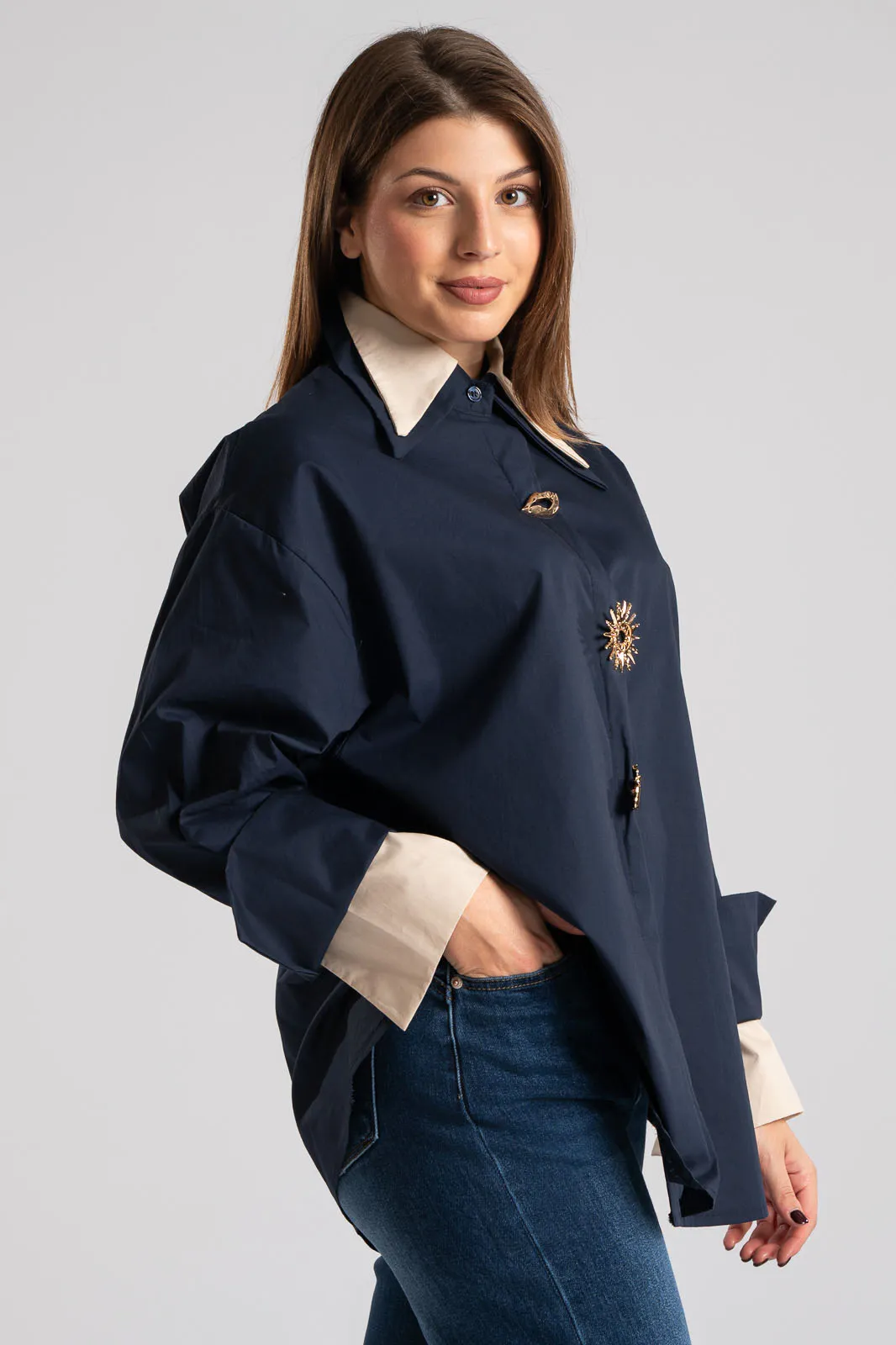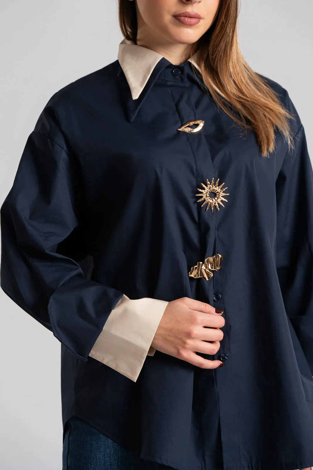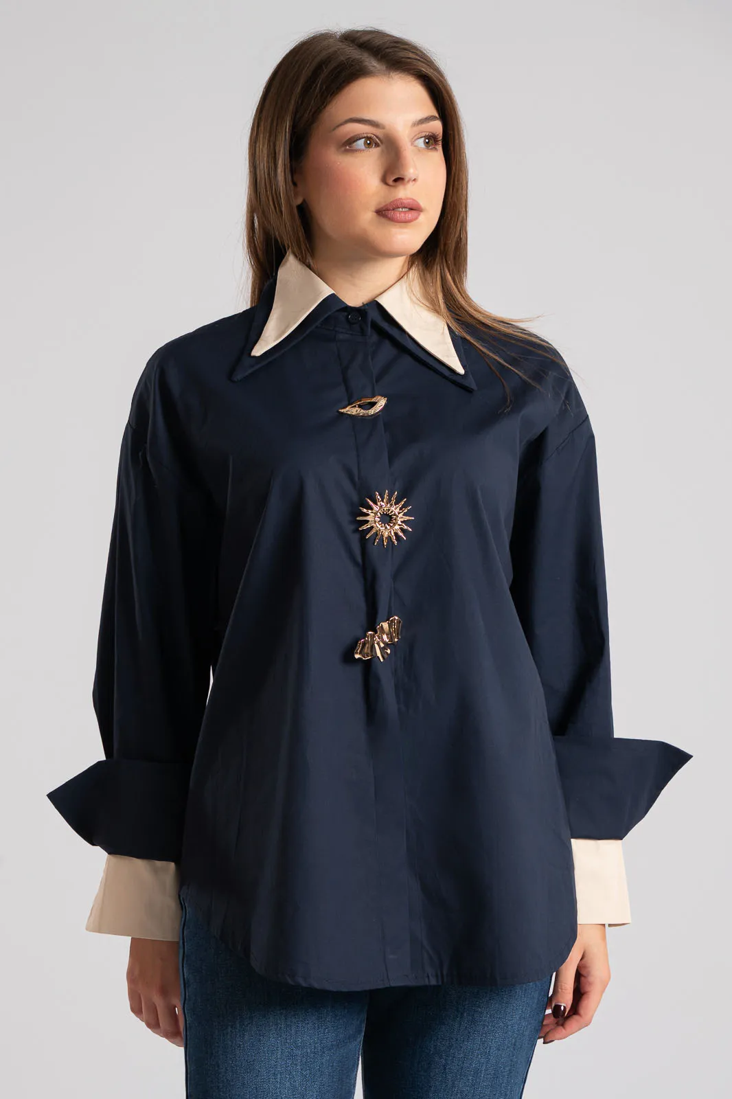 Πουκάμισο βαμβακερό με γιακά και μακριά μανίκια όπου στο τελείωμα διαθέτει μικρό άνοιγμα. Κλείνει με κουμπιά που είναι καλυμμένα με πατιλέτα και διαθέτει διακοσμητικές αποσπώμενες καρφίτσες. Στο γιακά και στο τελείωμα των μανικιών έχει εσωτερικά extra ύφασμα με διαφορετική απόχρωση. Στο πίσω μέρος έχει πιέτα και είναι μακρύτερο. Οι μετρήσεις του πίνακα είναι αντιπροσωπευτικές για κάθε κωδικό. 100% cotton.