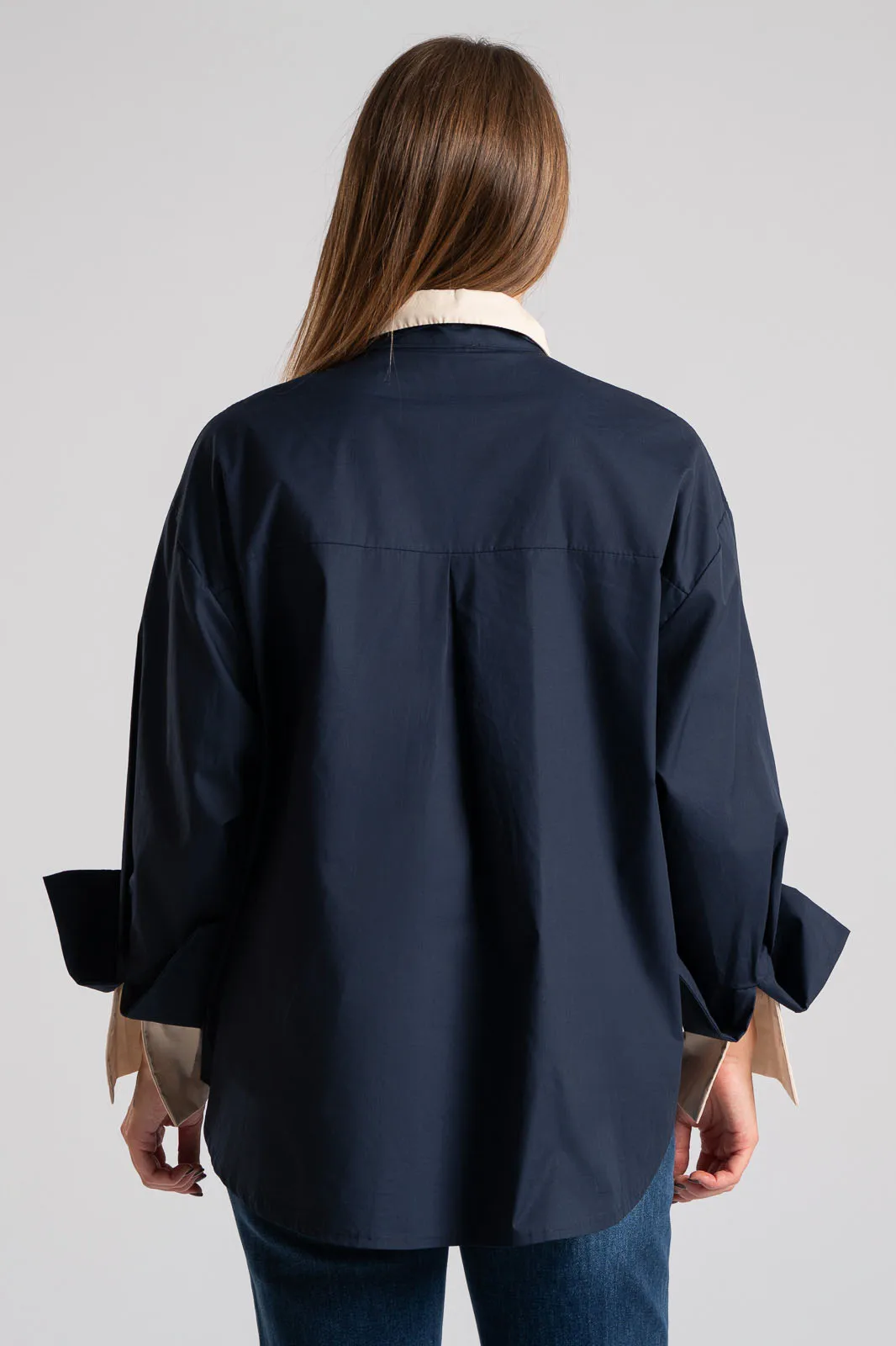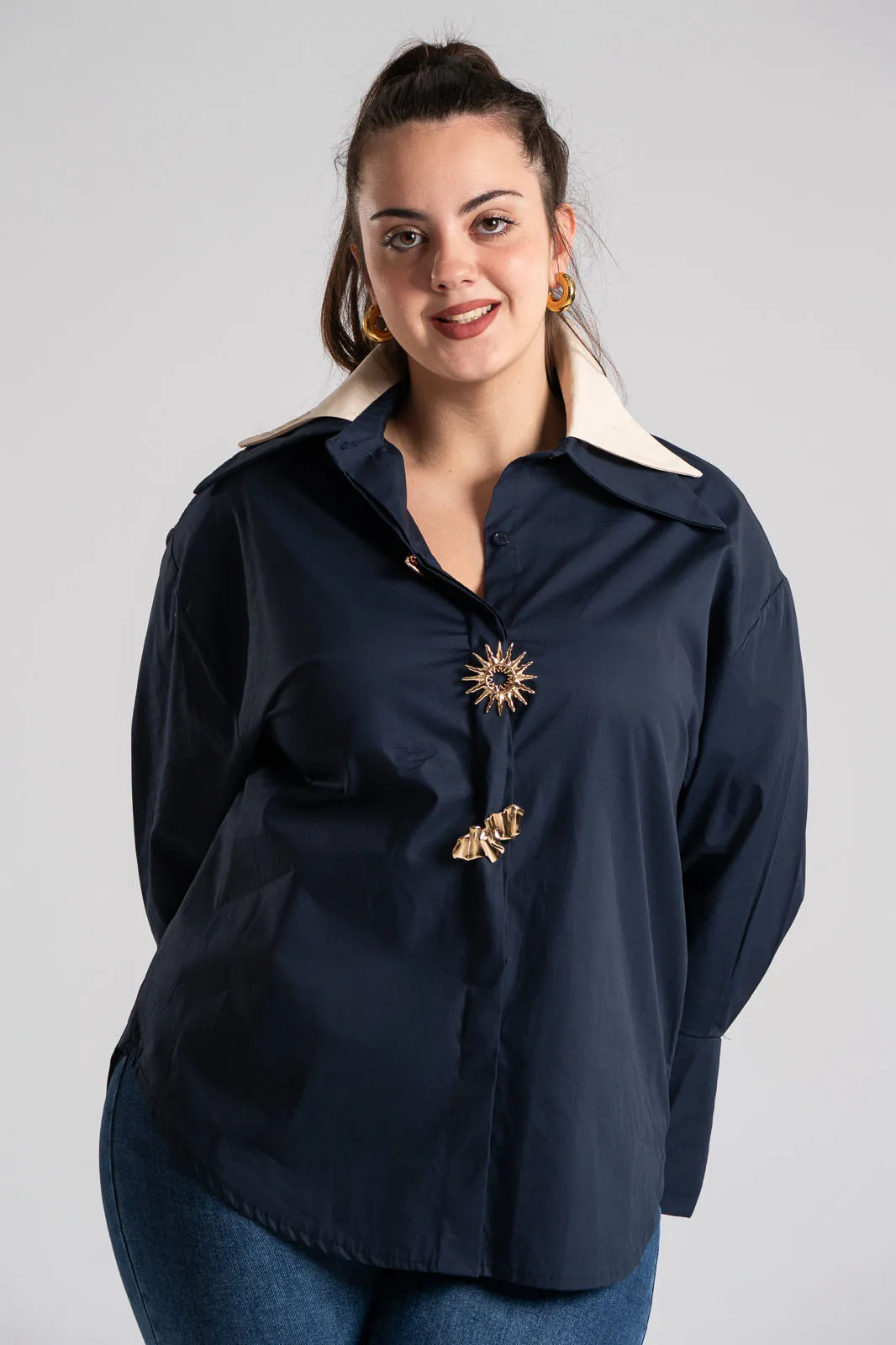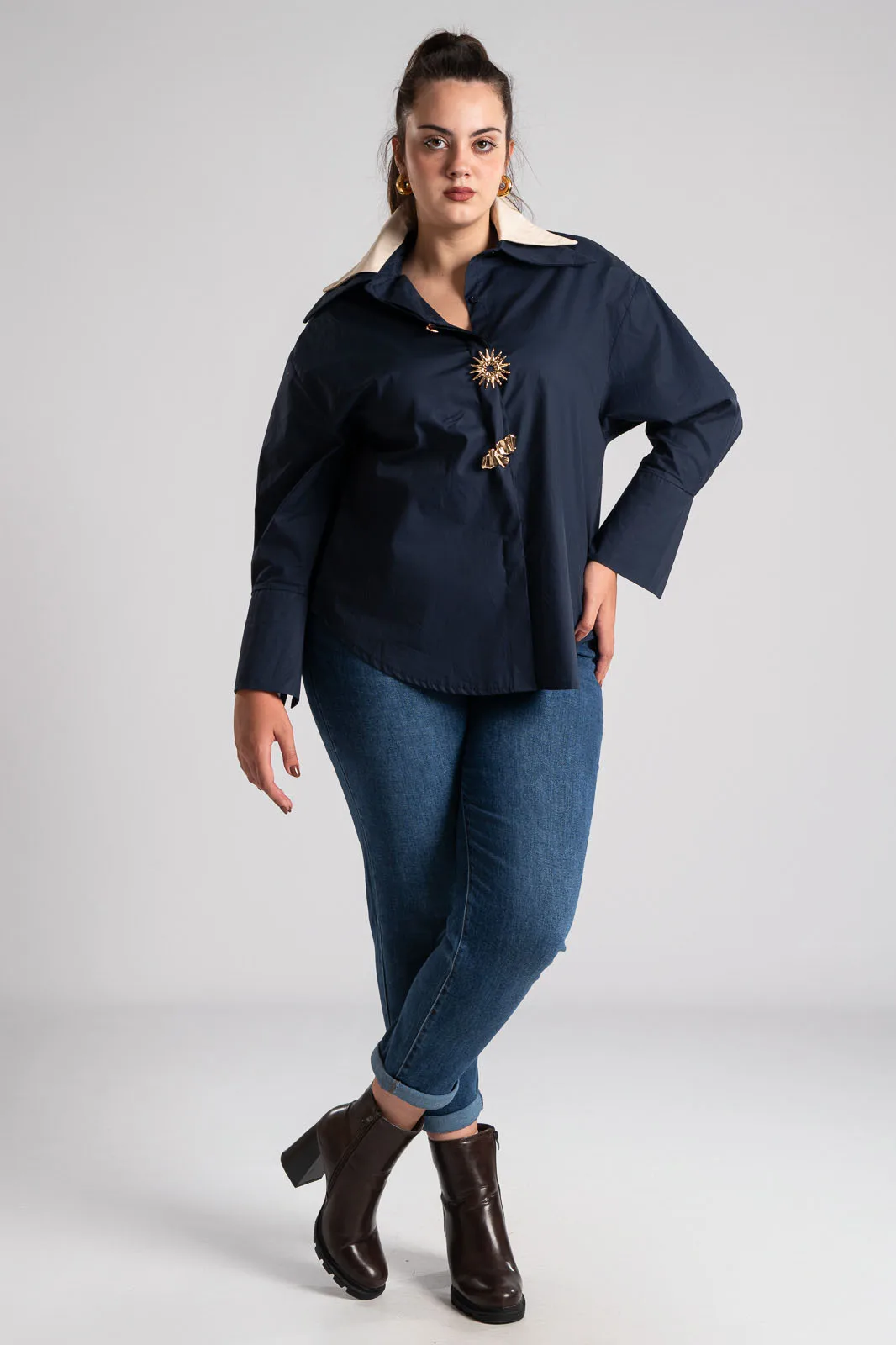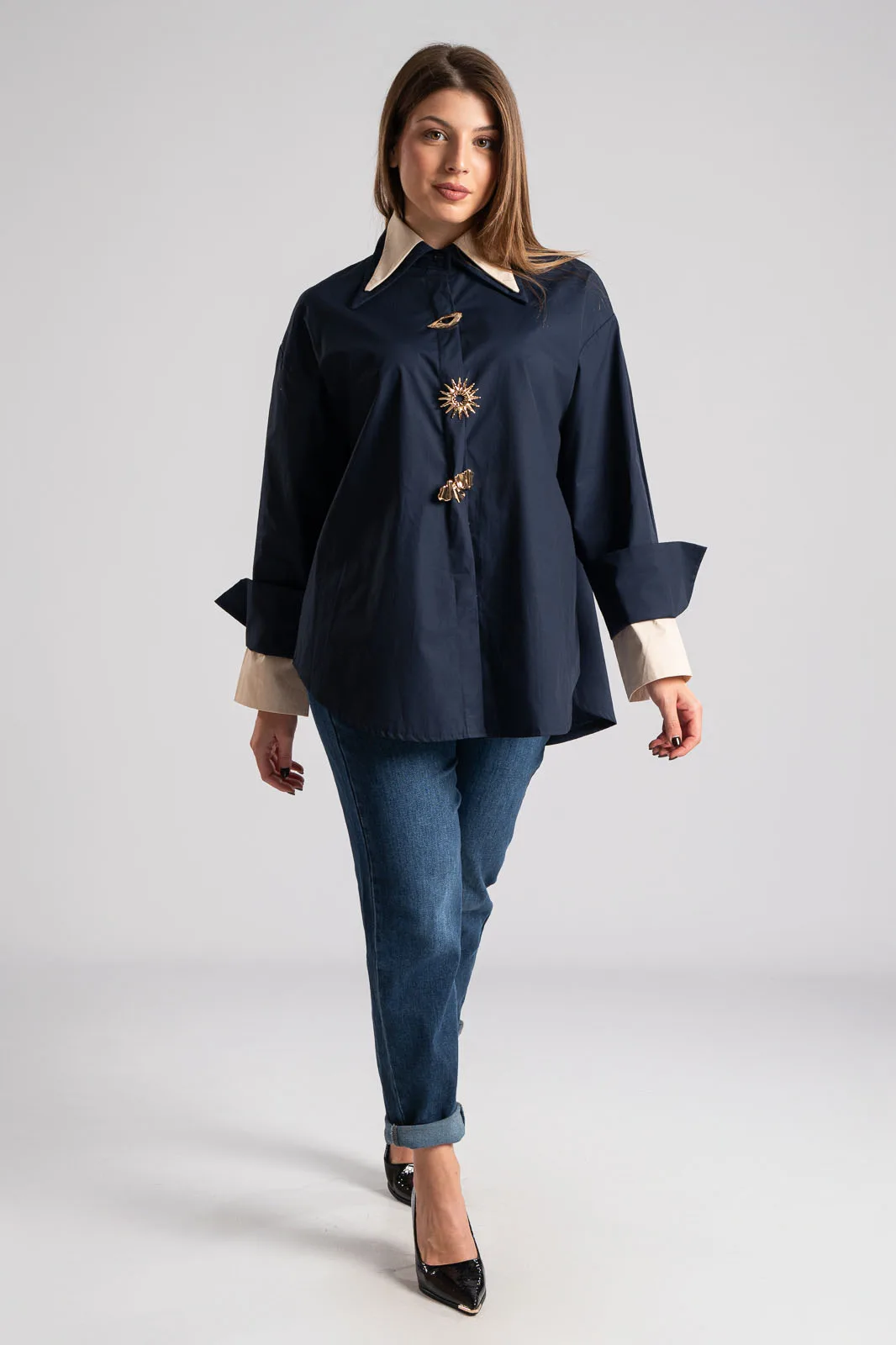 Πουκάμισο βαμβακερό με γιακά και μακριά μανίκια όπου στο τελείωμα διαθέτει μικρό άνοιγμα. Κλείνει με κουμπιά που είναι καλυμμένα με πατιλέτα και διαθέτει διακοσμητικές αποσπώμενες καρφίτσες. Στο γιακά και στο τελείωμα των μανικιών έχει εσωτερικά extra ύφασμα με διαφορετική απόχρωση. Στο πίσω μέρος έχει πιέτα και είναι μακρύτερο. Οι μετρήσεις του πίνακα είναι αντιπροσωπευτικές για κάθε κωδικό. 100% cotton.