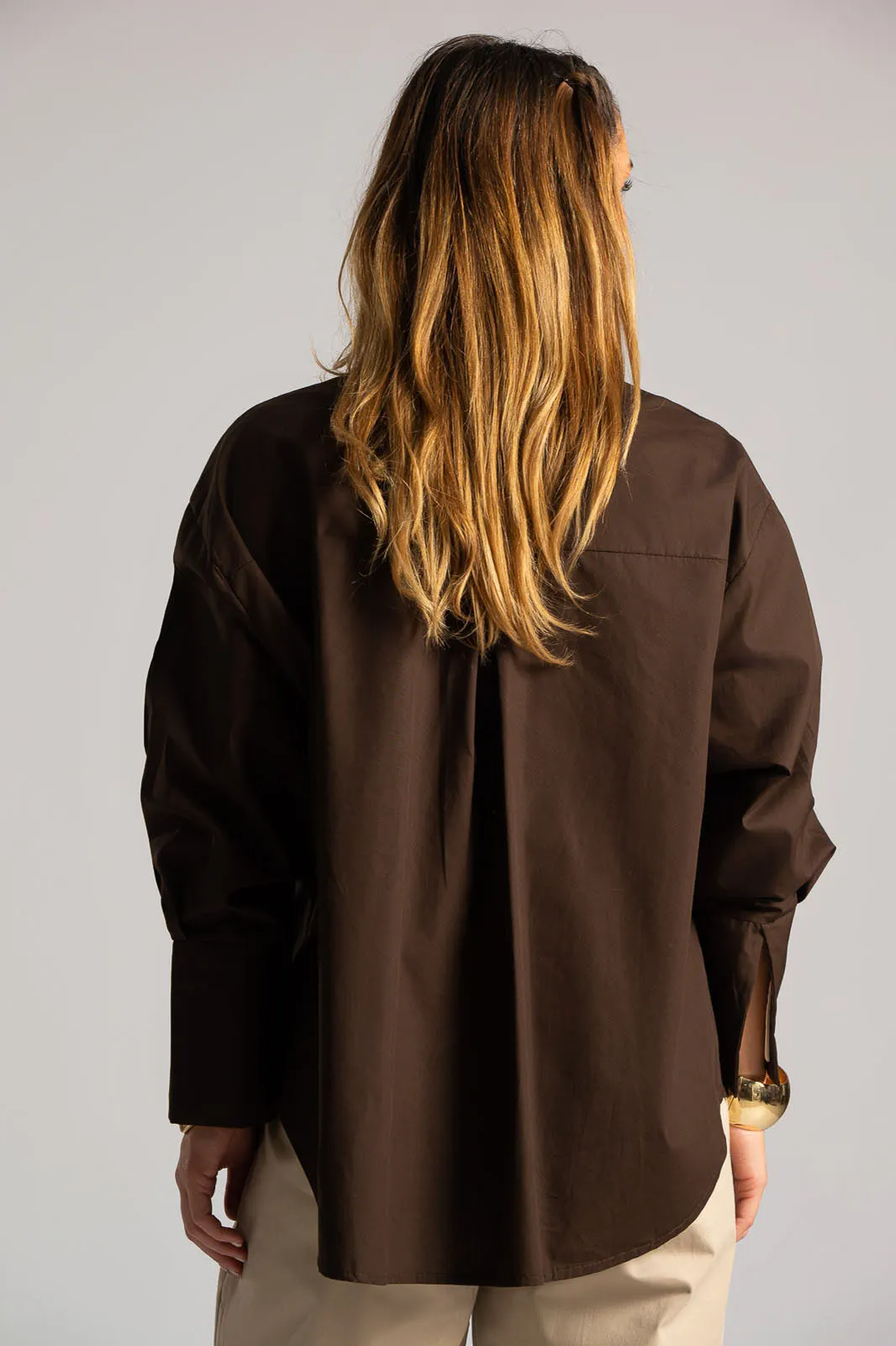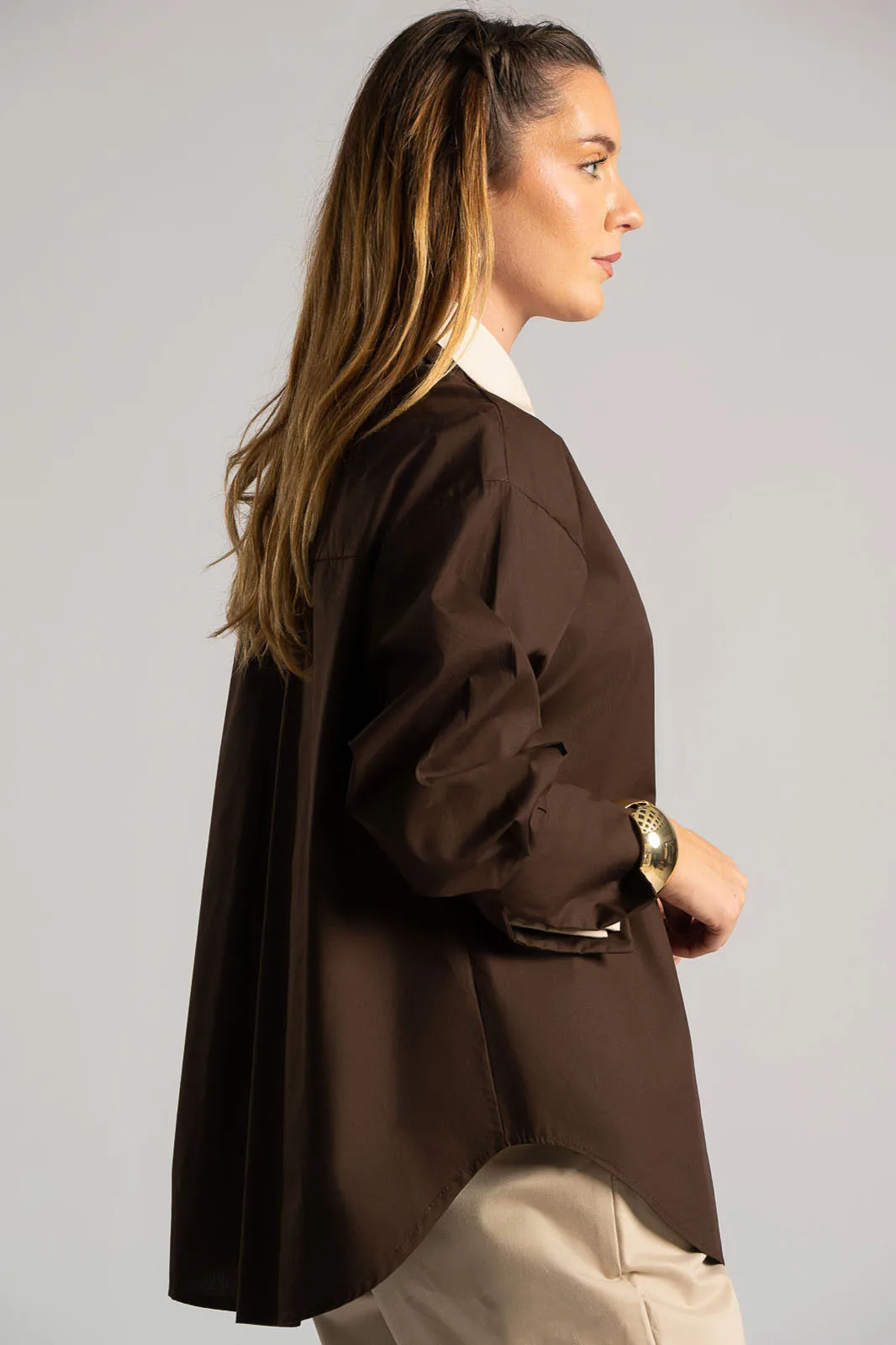 Cotton shirt with collar and long sleeves, featuring a small opening at the hem. It fastens with buttons covered with pateleta and has decorative removable pins. The collar and cuffs have extra fabric in a different shade on the inside. It has a pleat at the back and is longer. The measurements in the table are representative for each code. 100% cotton.