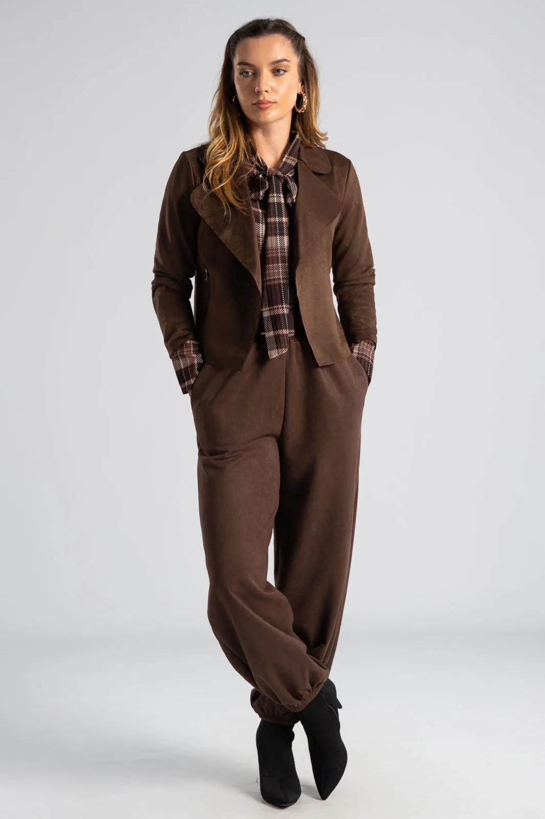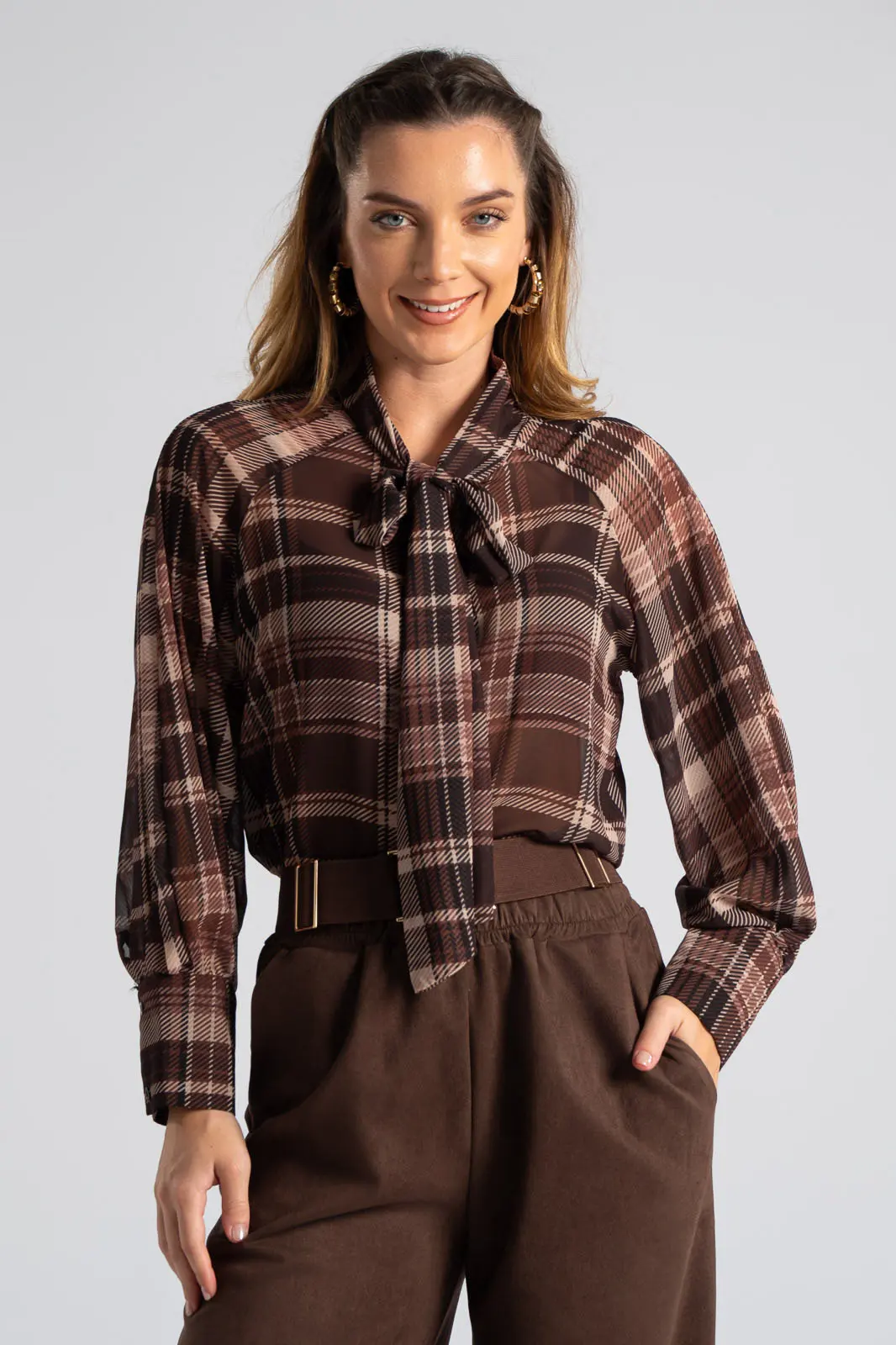 Shirt with tie at the neckline. It has long sleeves that fasten with two buttons. It has a checkered pattern across the entire surface. It has a straight cut. The measurements in the table are representative for each code. 100% polyester.