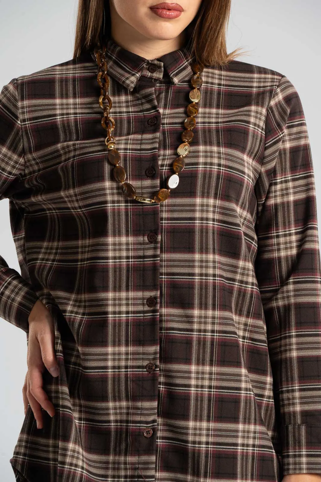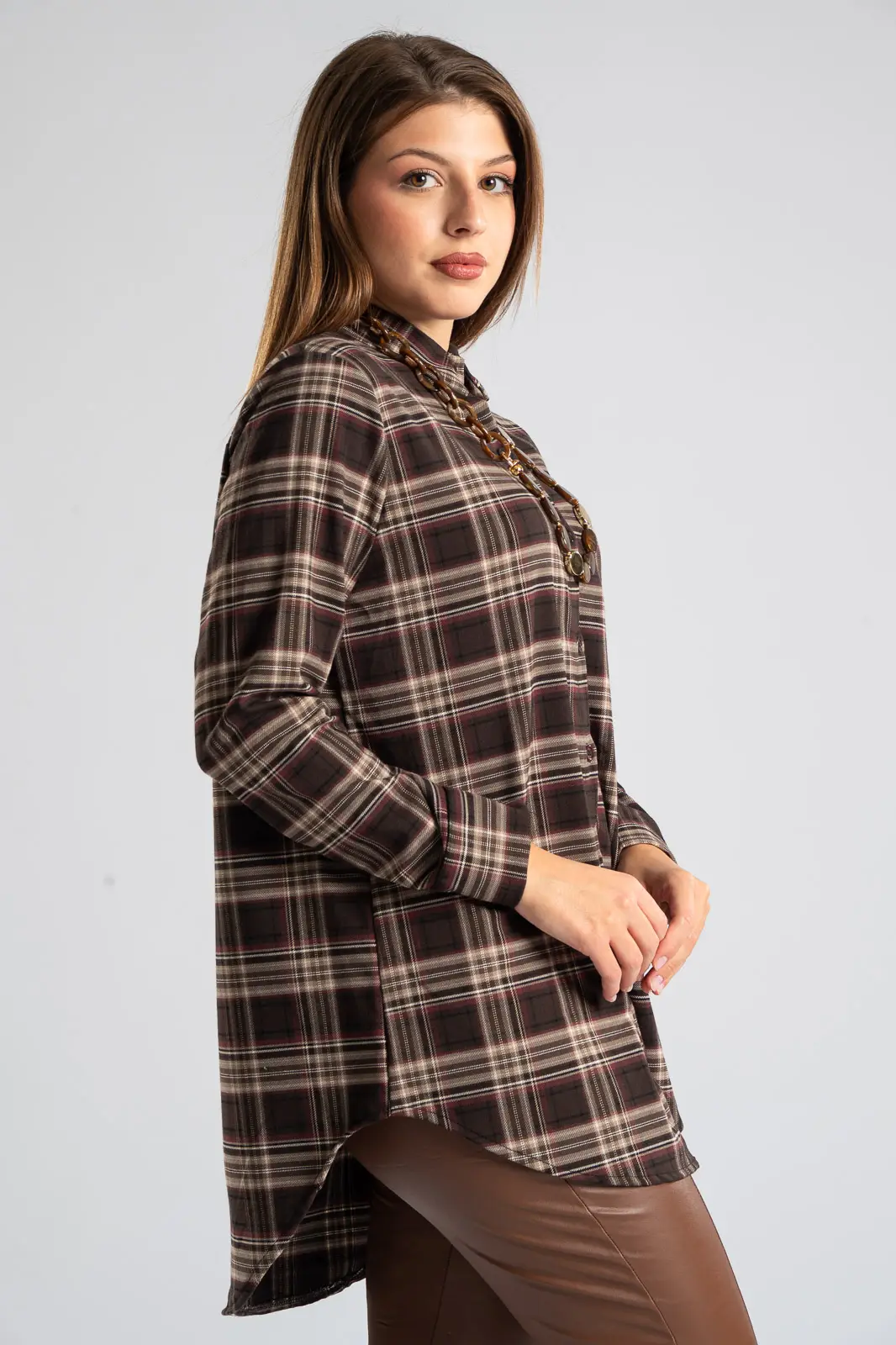 Shirt with collar and long sleeves. Checkered pattern across the entire surface. Fastens with buttons and is longer at the back. The measurements in the table are representative for each code. 60% polyester, 30% viscose, 10% elastane.