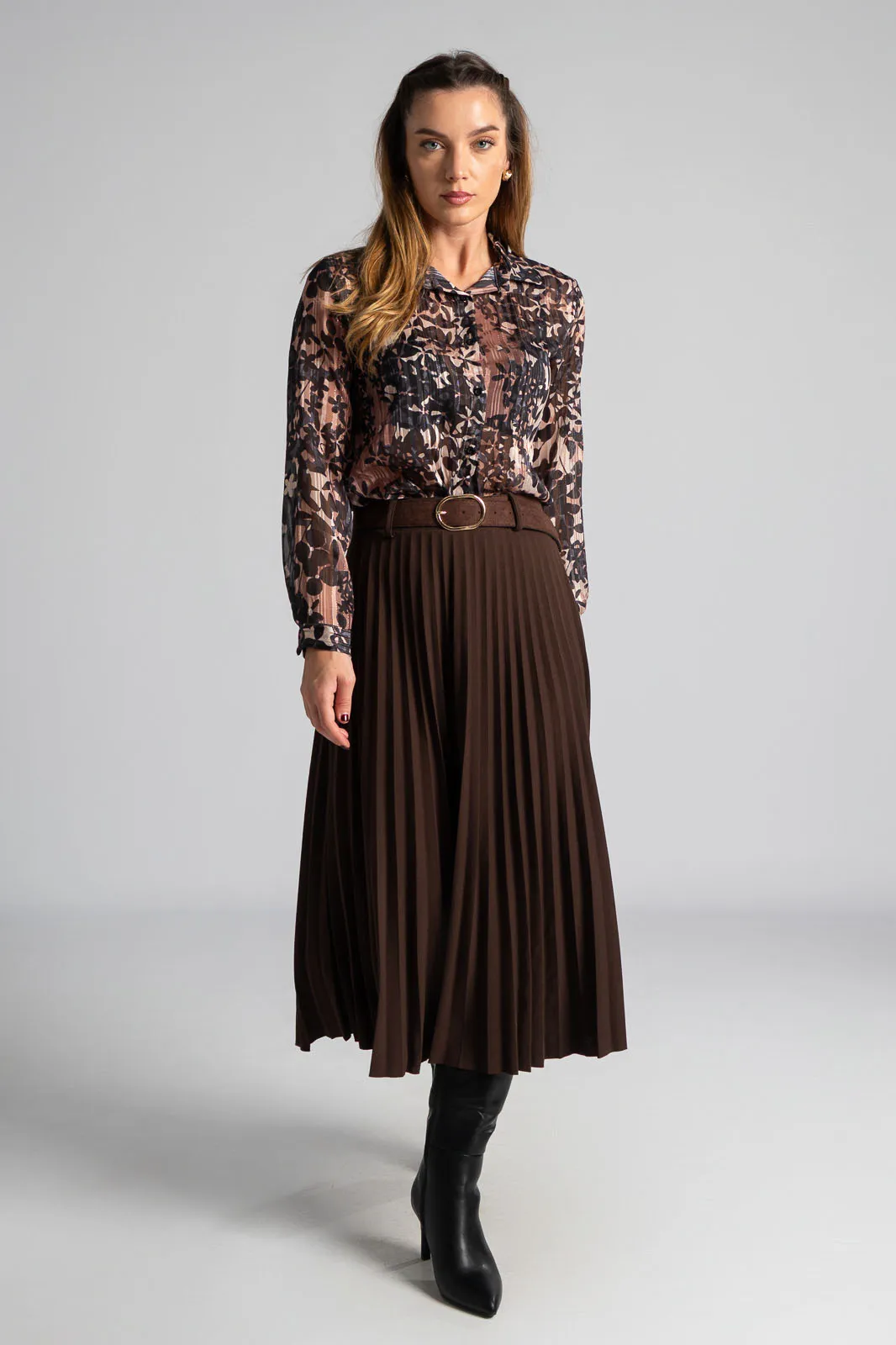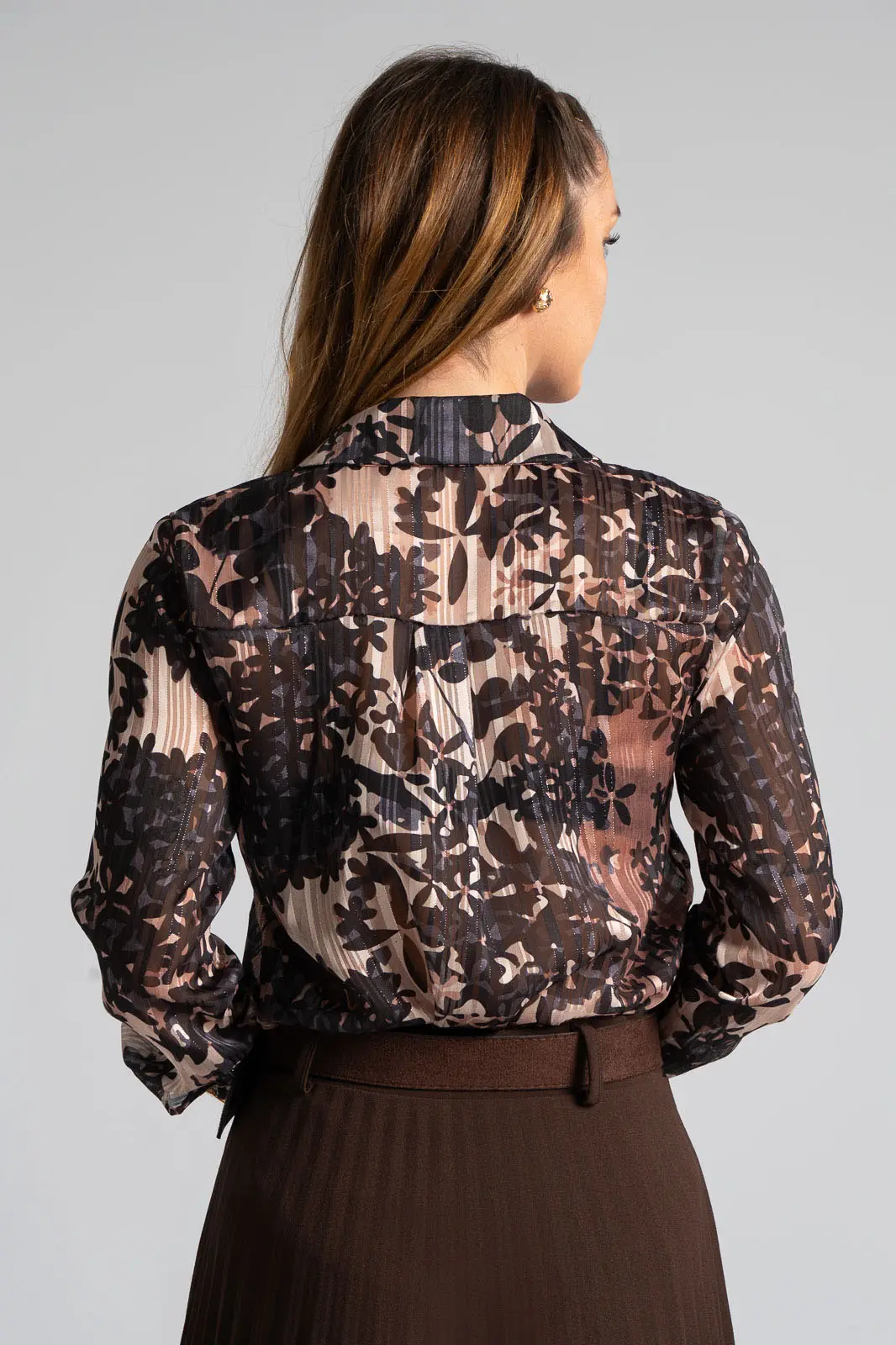 Shirt with collar. It has long sleeves that end in a button. The entire surface has c-throu transparency with floral print and gold thread. The measurements in the table are representative for each code. 95% polyester, 5% elastane.