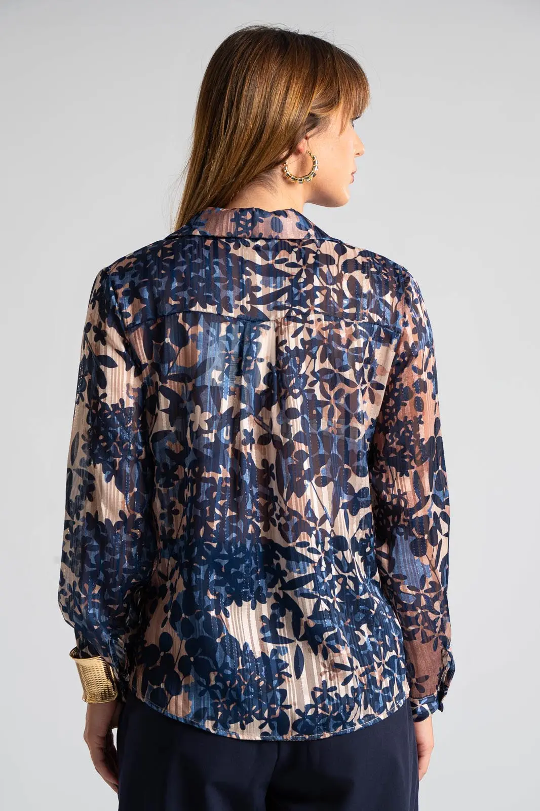 Shirt with collar. It has long sleeves that end in a button. The entire surface has c-throu transparency with floral print and gold thread. The measurements in the table are representative for each code. 95% polyester, 5% elastane.