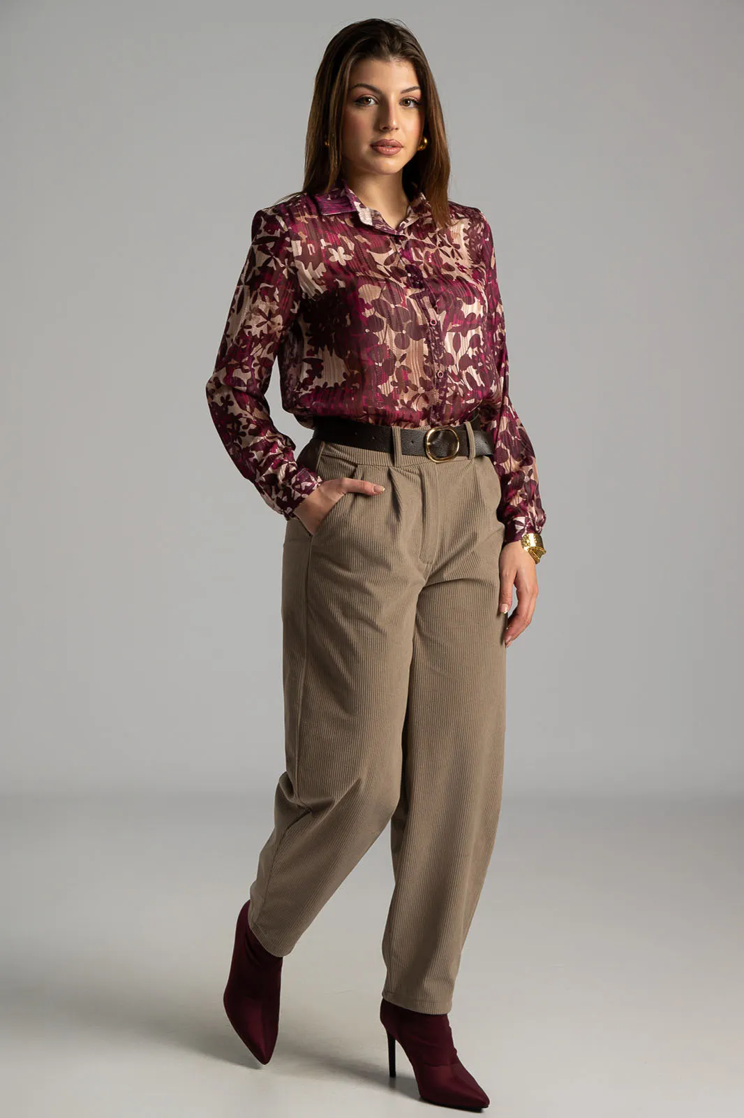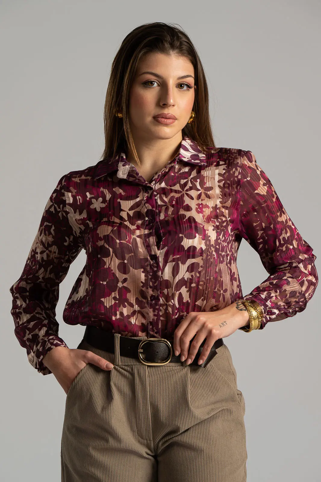 Shirt with collar. It has long sleeves that end in a button. The entire surface has c-throu transparency with floral print and gold thread. The measurements in the table are representative for each code. 95% polyester, 5% elastane.