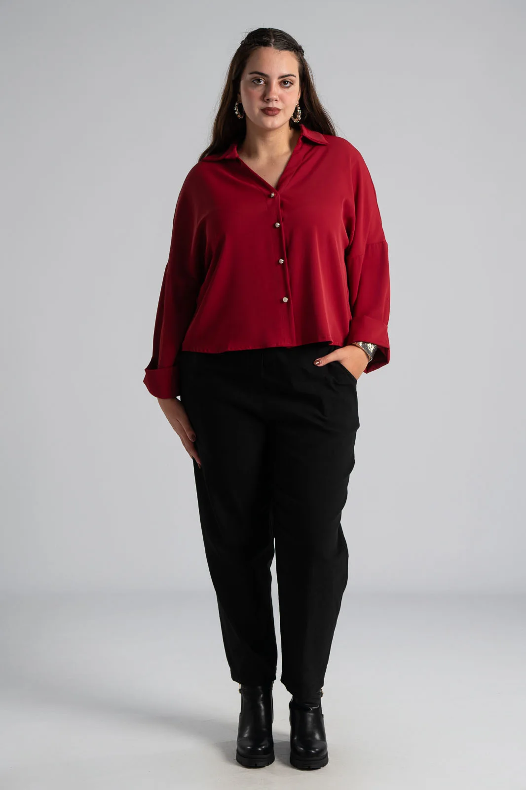Shirt with V-neck. It has short sleeves that end in cuffs. It has a collar and fastens with mother-of-pearl buttons. It has a crepe texture across the entire surface. It has a large pleat at the back at the height of the back and is slightly longer. The measurements in the table are representative of each product. 97% polyester, 3% elastane.