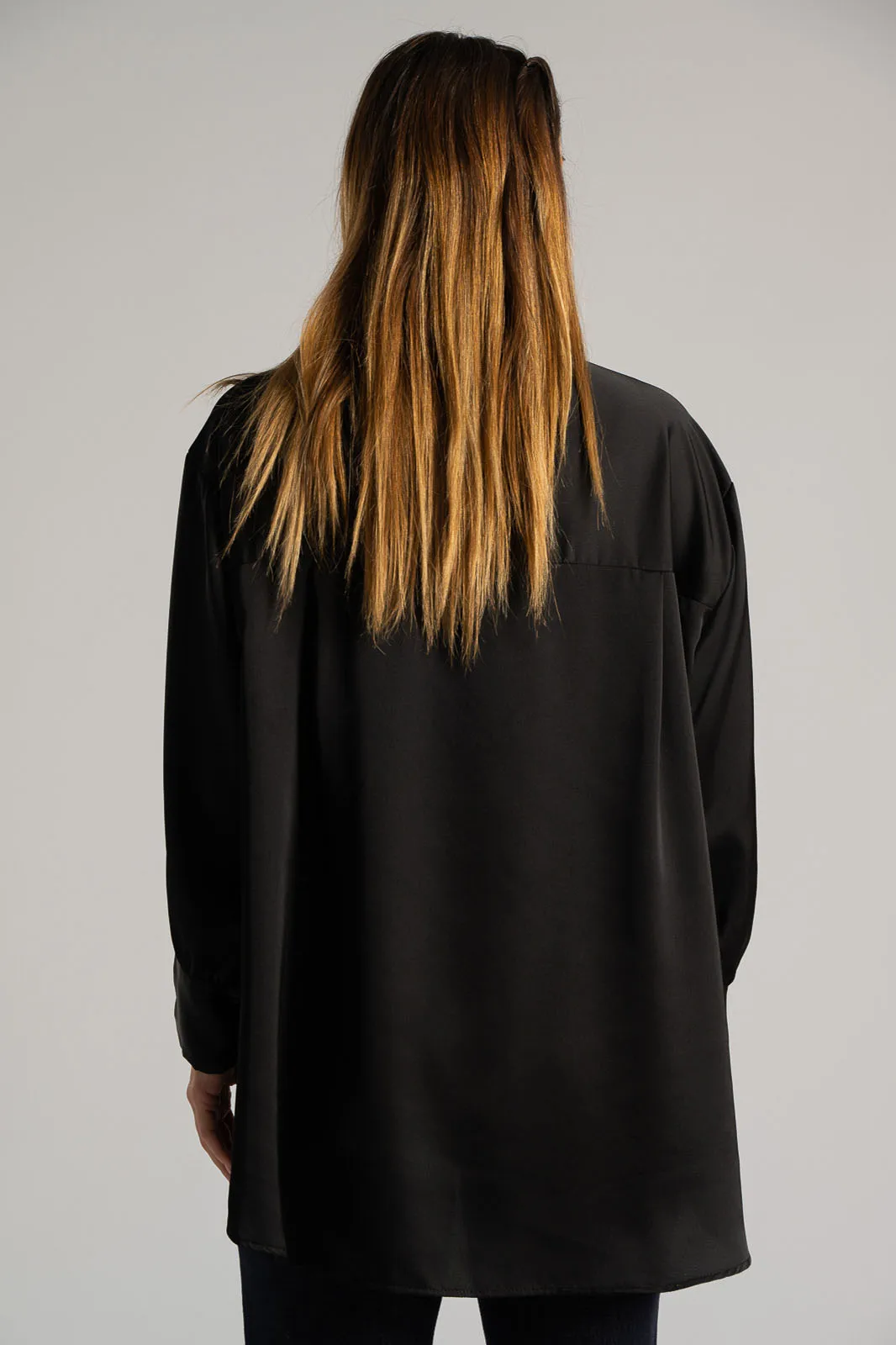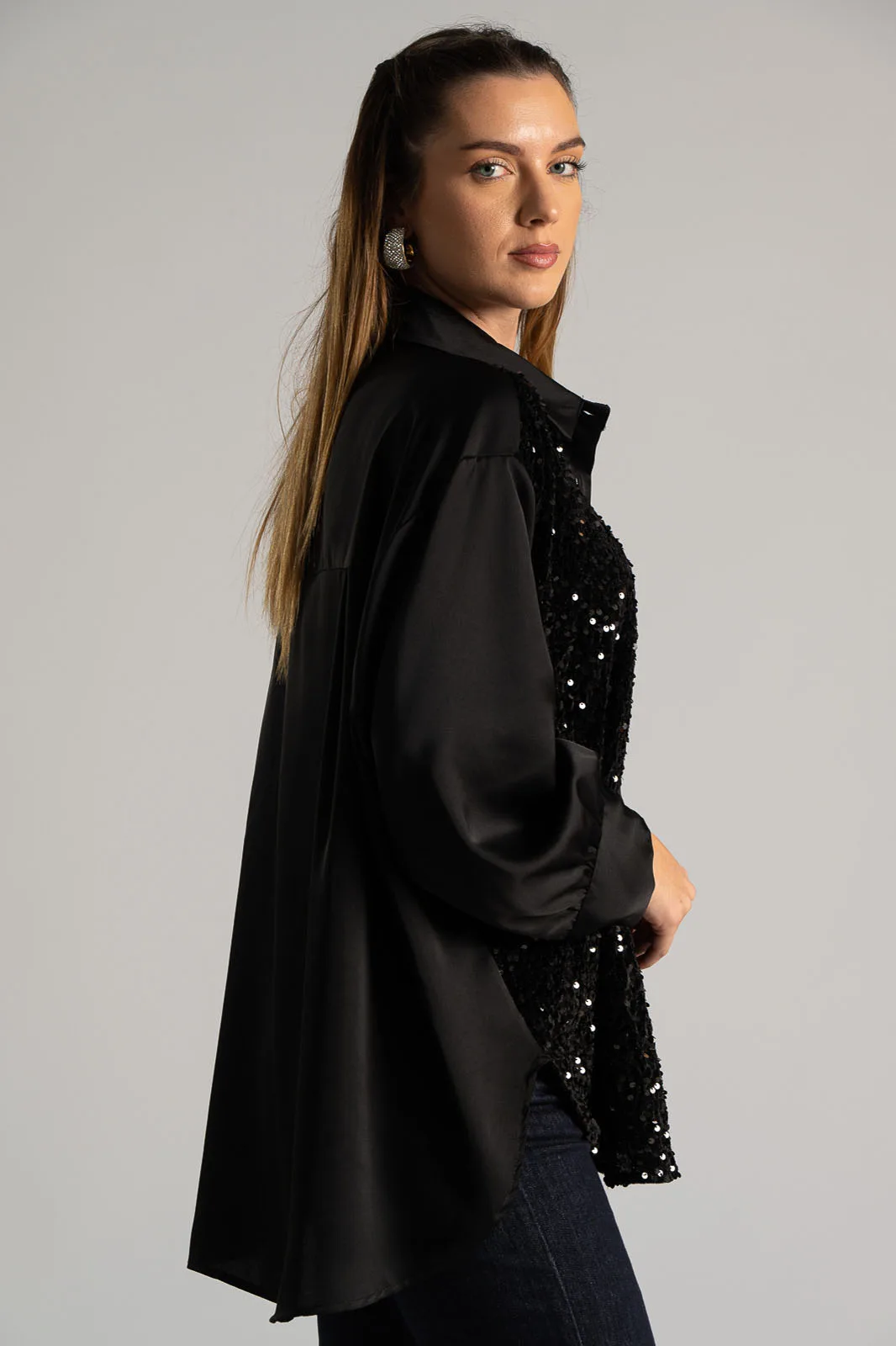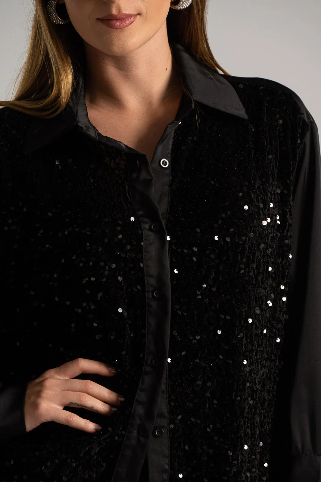 Πουκάμισο με γιακά. Έχει μακριά μανίκια που καταλήγουν σε κουμπί. Σε όλη την μπροστινή μεριά έχει velvet επιφάνεια με διακοσμητική παγιέτα σε μαύρη απόχρωση. Στην υπόλοιπη επιφάνεια έχει σατέν υφή. Το πίσω μέρος είναι ελαφρώς μακρύτερο. Οι μετρήσεις του πίνακα είναι αντιπροσωπευτικές για κάθε προϊόν. 95% polyester, 5% elastan.