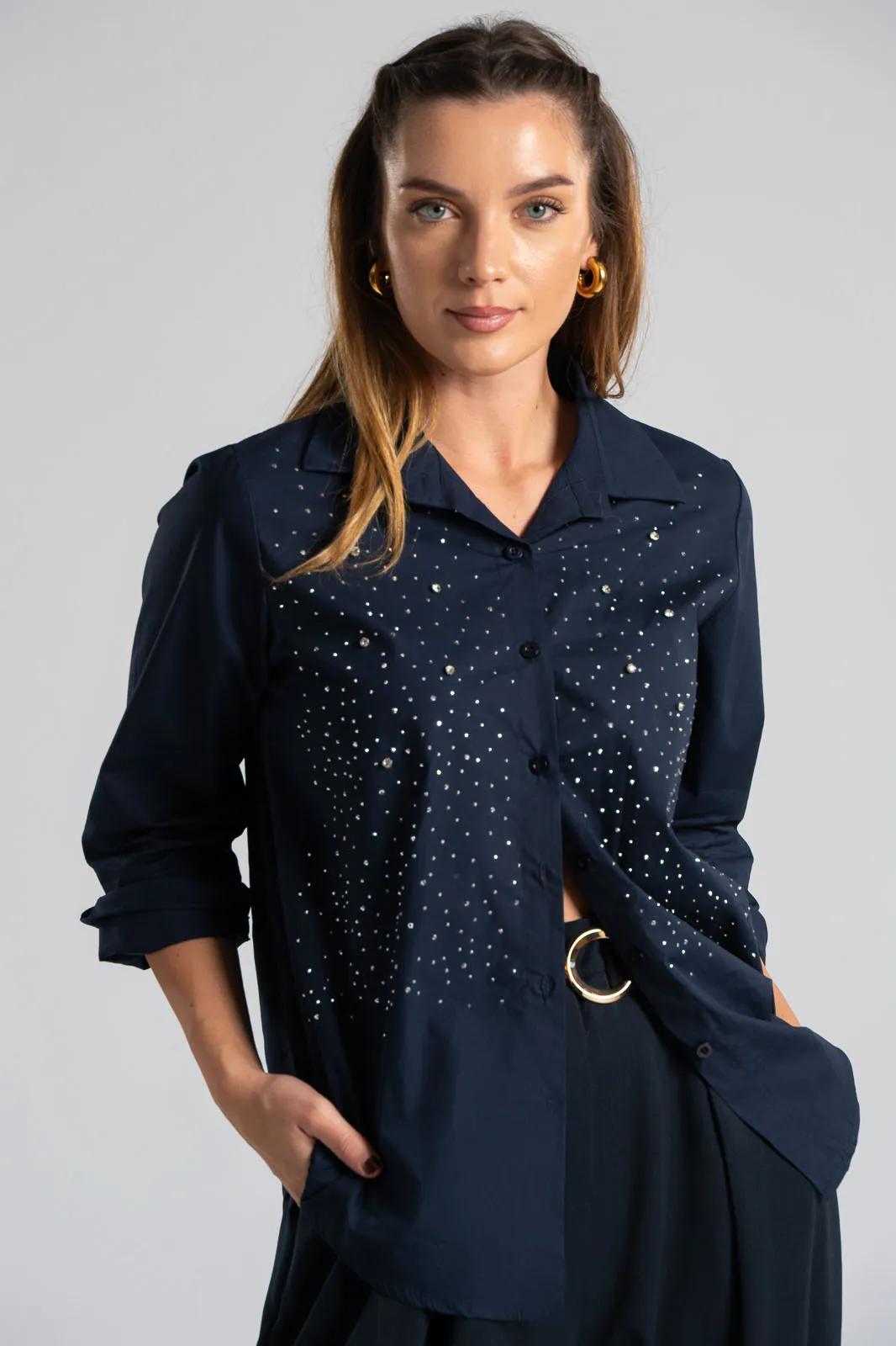 POPLIN SHIRT RHINSTONES BLUE BLACK
