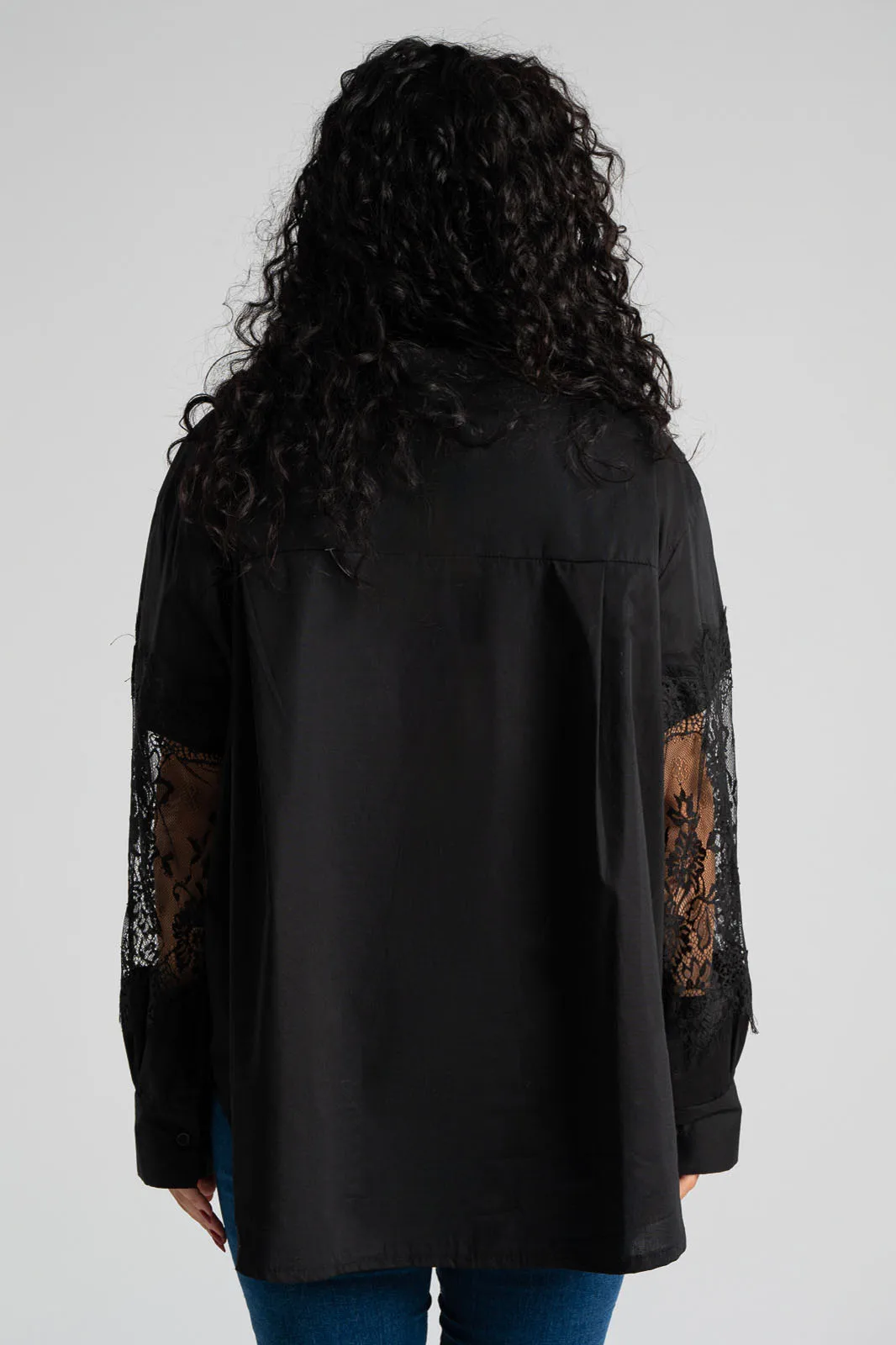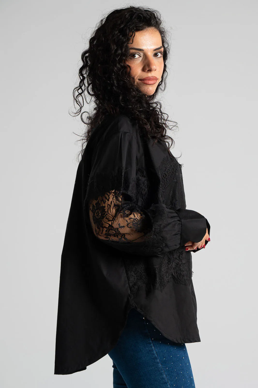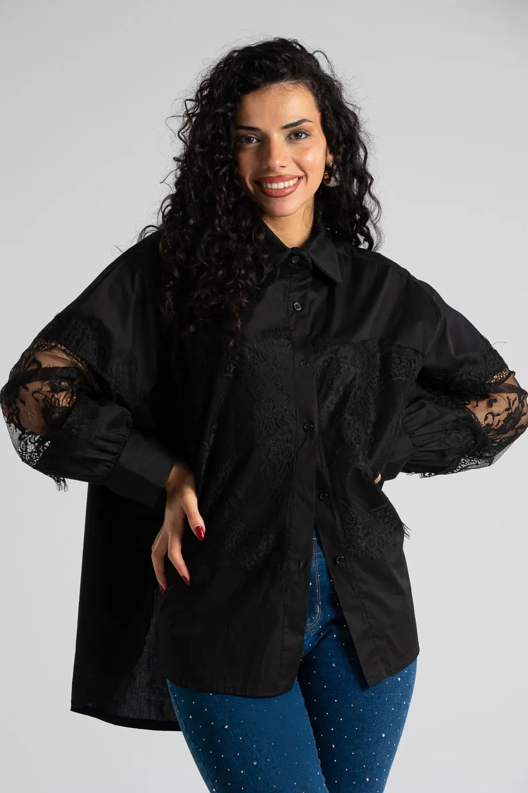 Shirt with poplin texture. The front features lace detailing. It has long sleeves with lace trim and button fastening. The measurements in the table are representative for each code. 100% cotton
