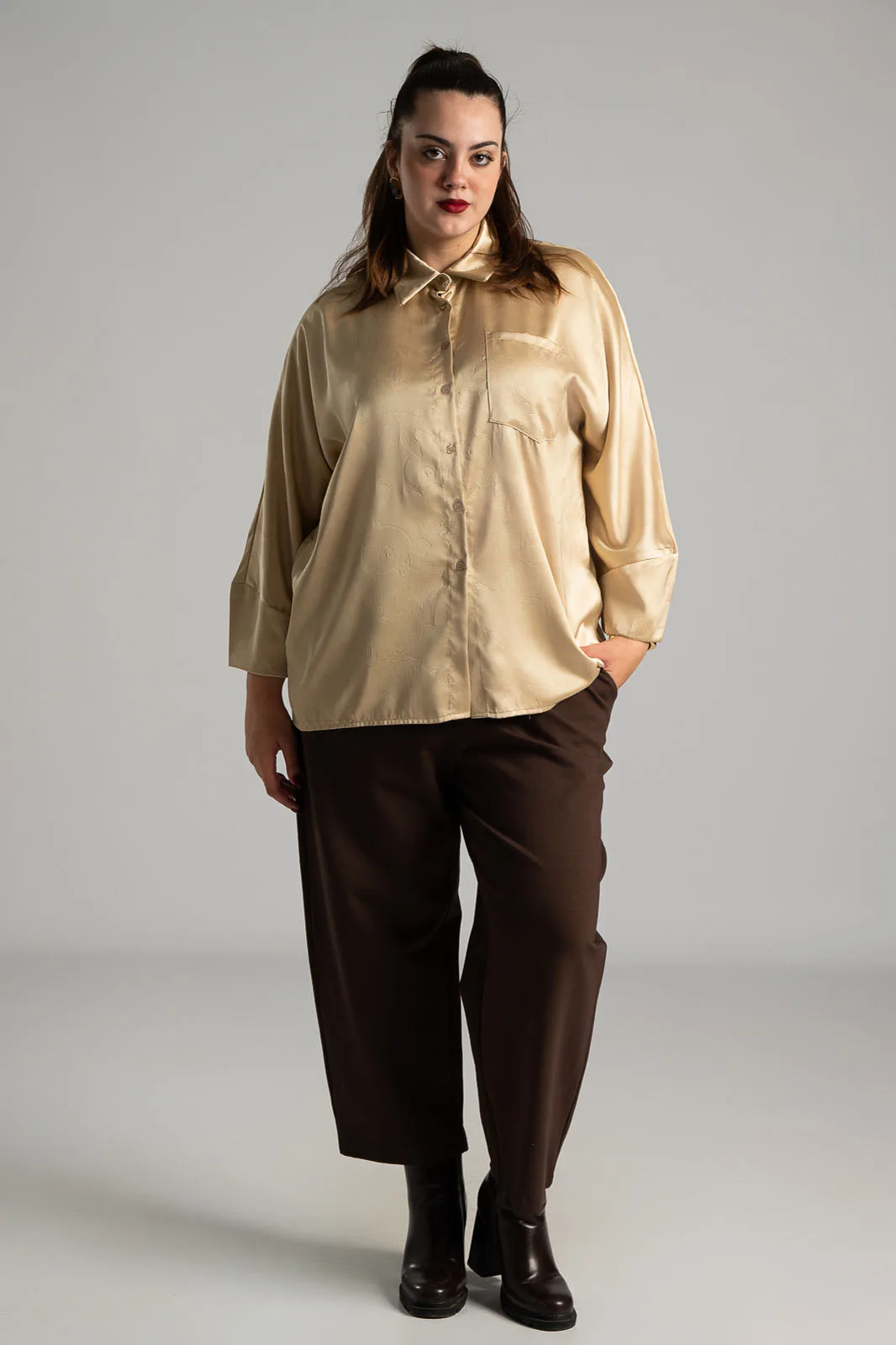Shirt with collar and long sleeves. It has a slightly embossed floral print pattern across the entire surface and a satin texture. There is a pocket on one side of the front. The back has a large pleat and is slightly longer. The measurements in the table are representative for each code. 95% polyester, 5% elastane.