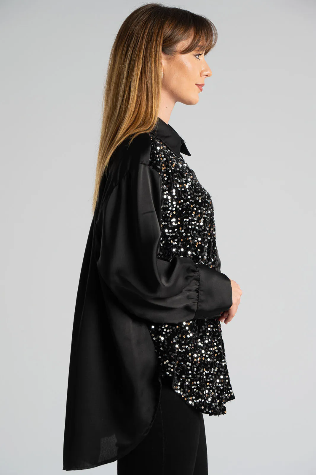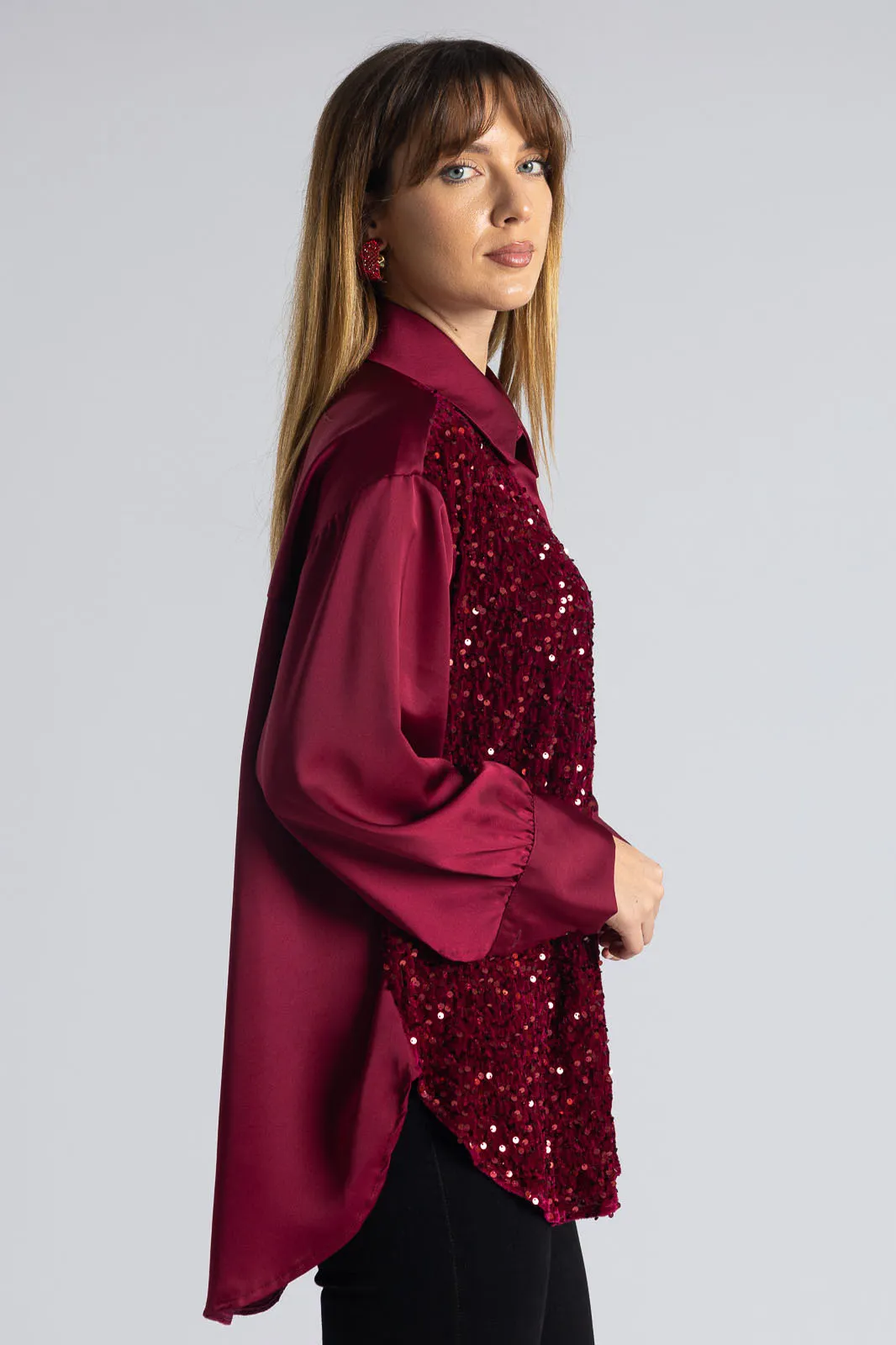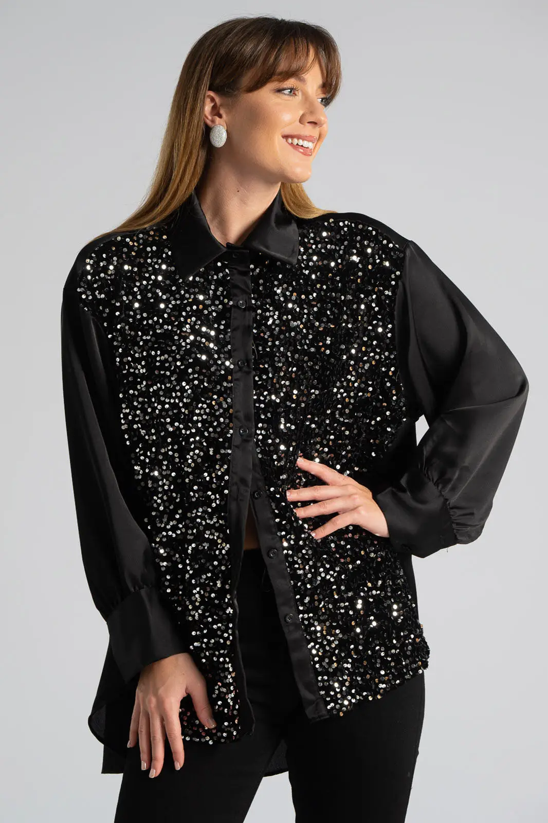 Πουκάμισο με γιακά. Έχει μακριά μανίκια που καταλήγουν σε κουμπί. Σε όλη την μπροστινή μεριά έχει velvet επιφάνεια με διακοσμητική παγιέτα. Στην υπόλοιπη επιφάνεια έχει σατέν υφή. Το πίσω μέρος είναι ελαφρώς μακρύτερο. Οι μετρήσεις του πίνακα είναι αντιπροσωπευτικές για κάθε προϊόν. 95% polyester, 5% elastan.