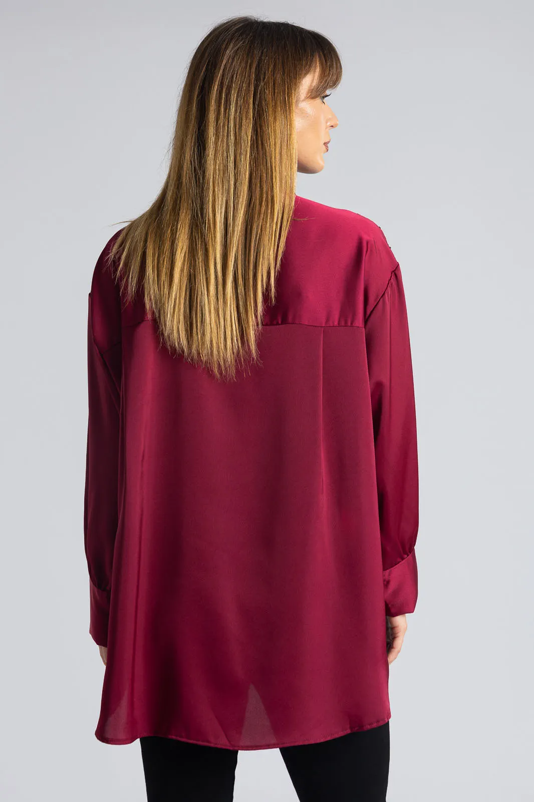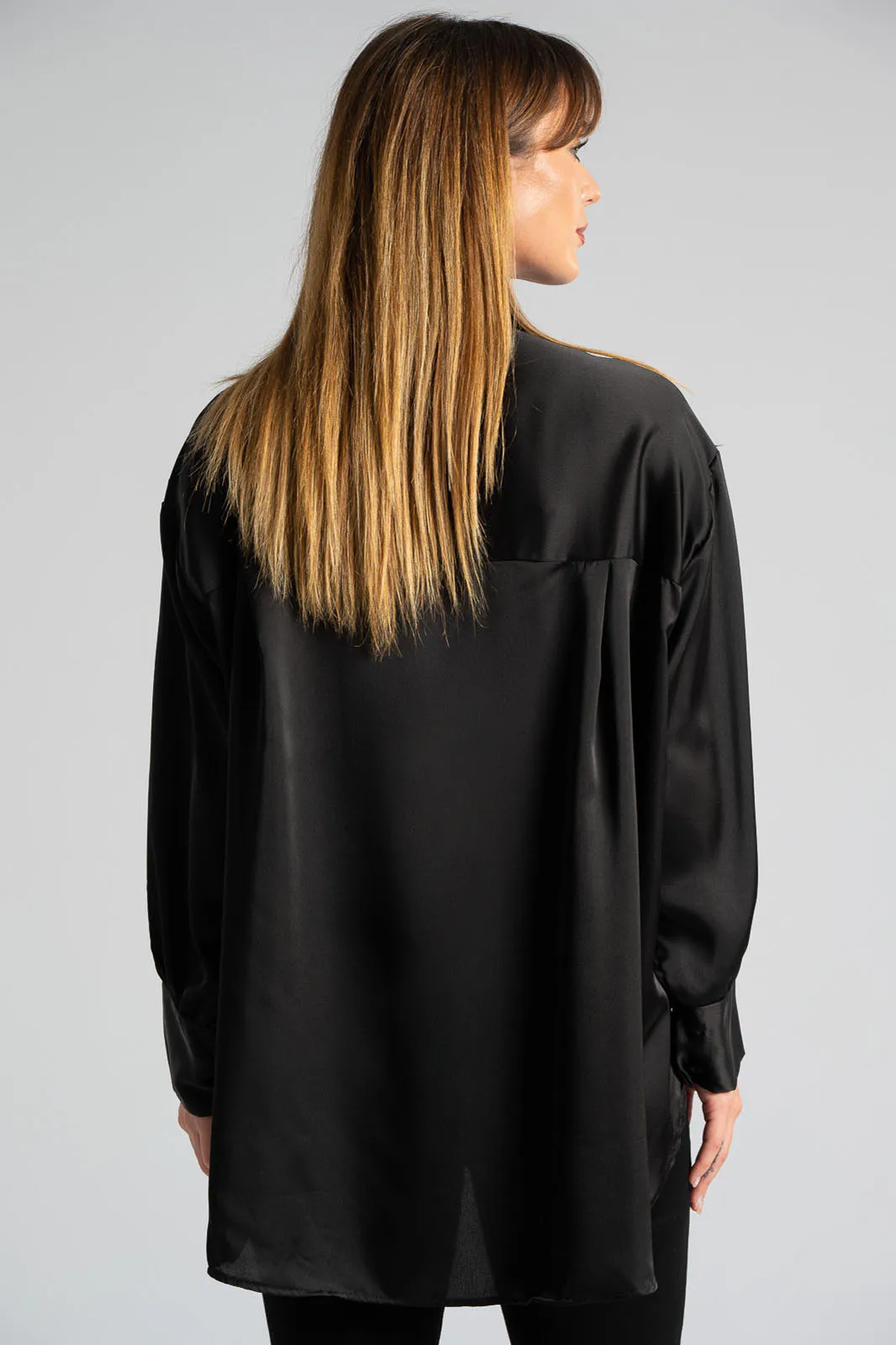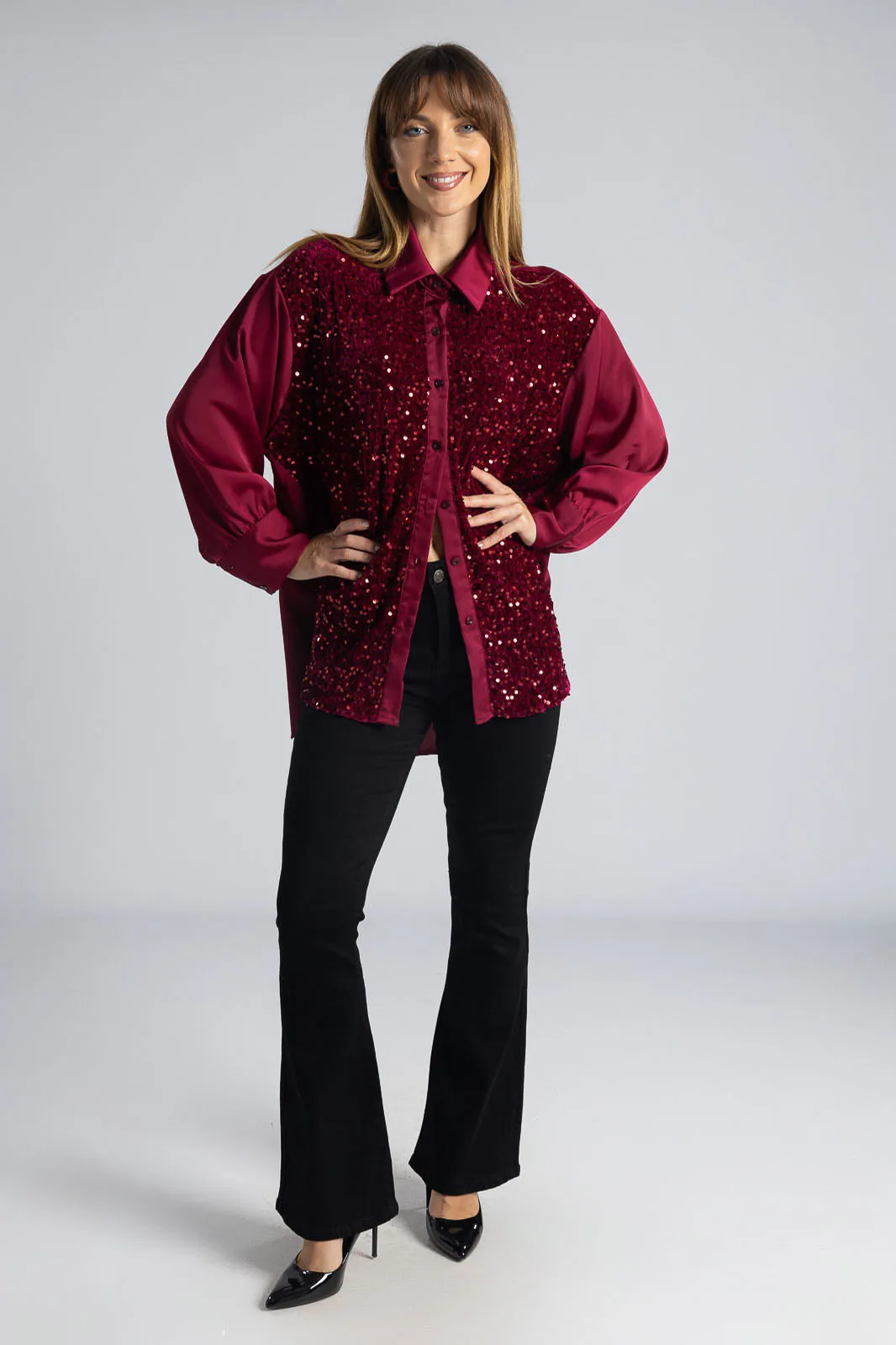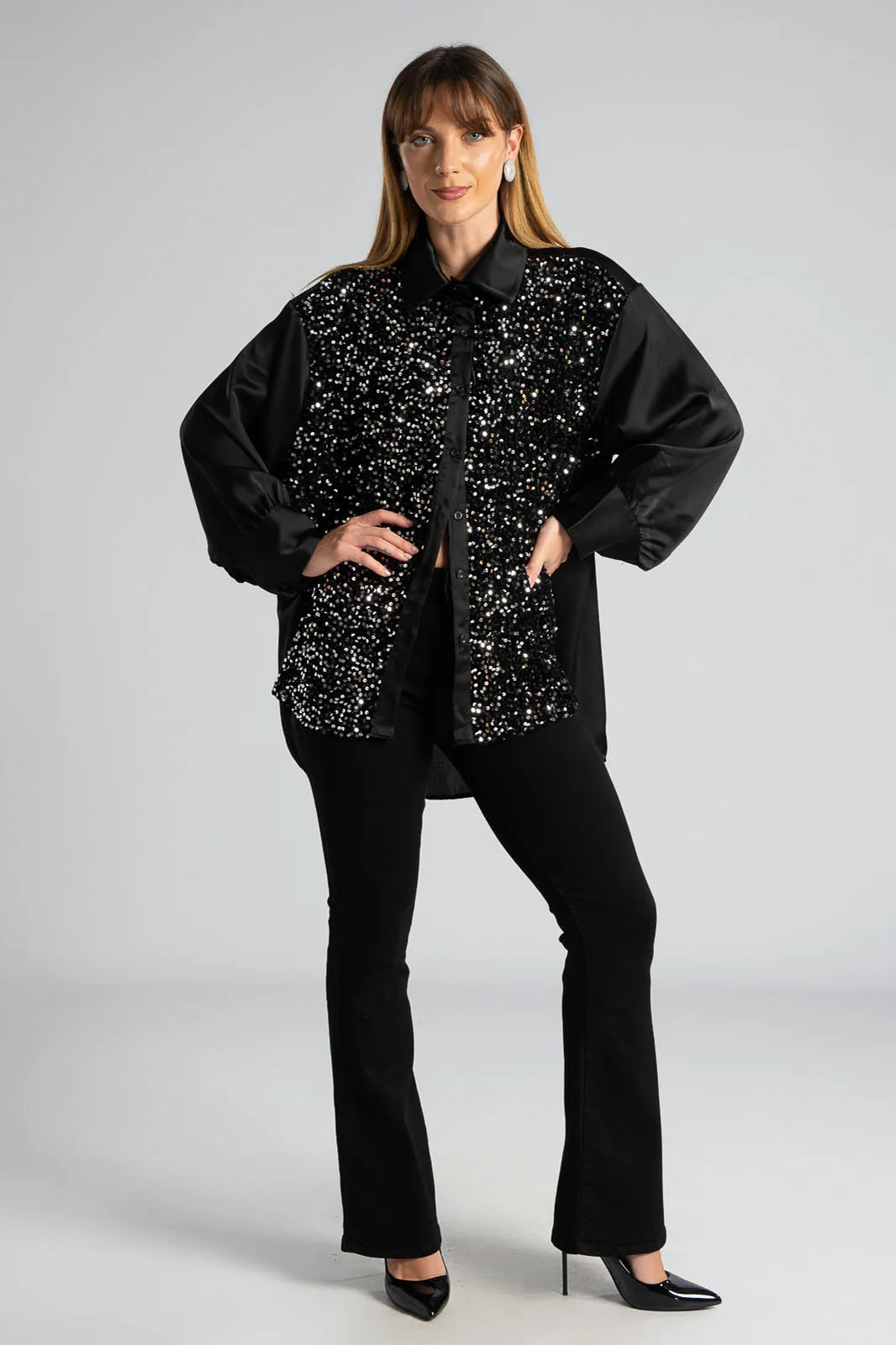 Πουκάμισο με γιακά. Έχει μακριά μανίκια που καταλήγουν σε κουμπί. Σε όλη την μπροστινή μεριά έχει velvet επιφάνεια με διακοσμητική παγιέτα. Στην υπόλοιπη επιφάνεια έχει σατέν υφή. Το πίσω μέρος είναι ελαφρώς μακρύτερο. Οι μετρήσεις του πίνακα είναι αντιπροσωπευτικές για κάθε προϊόν. 95% polyester, 5% elastan.