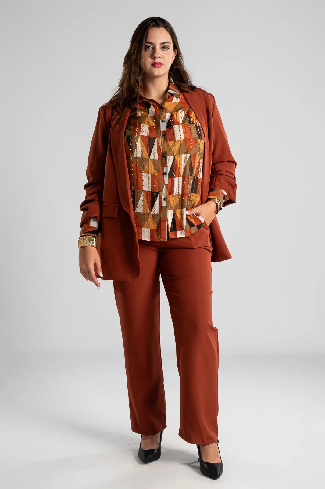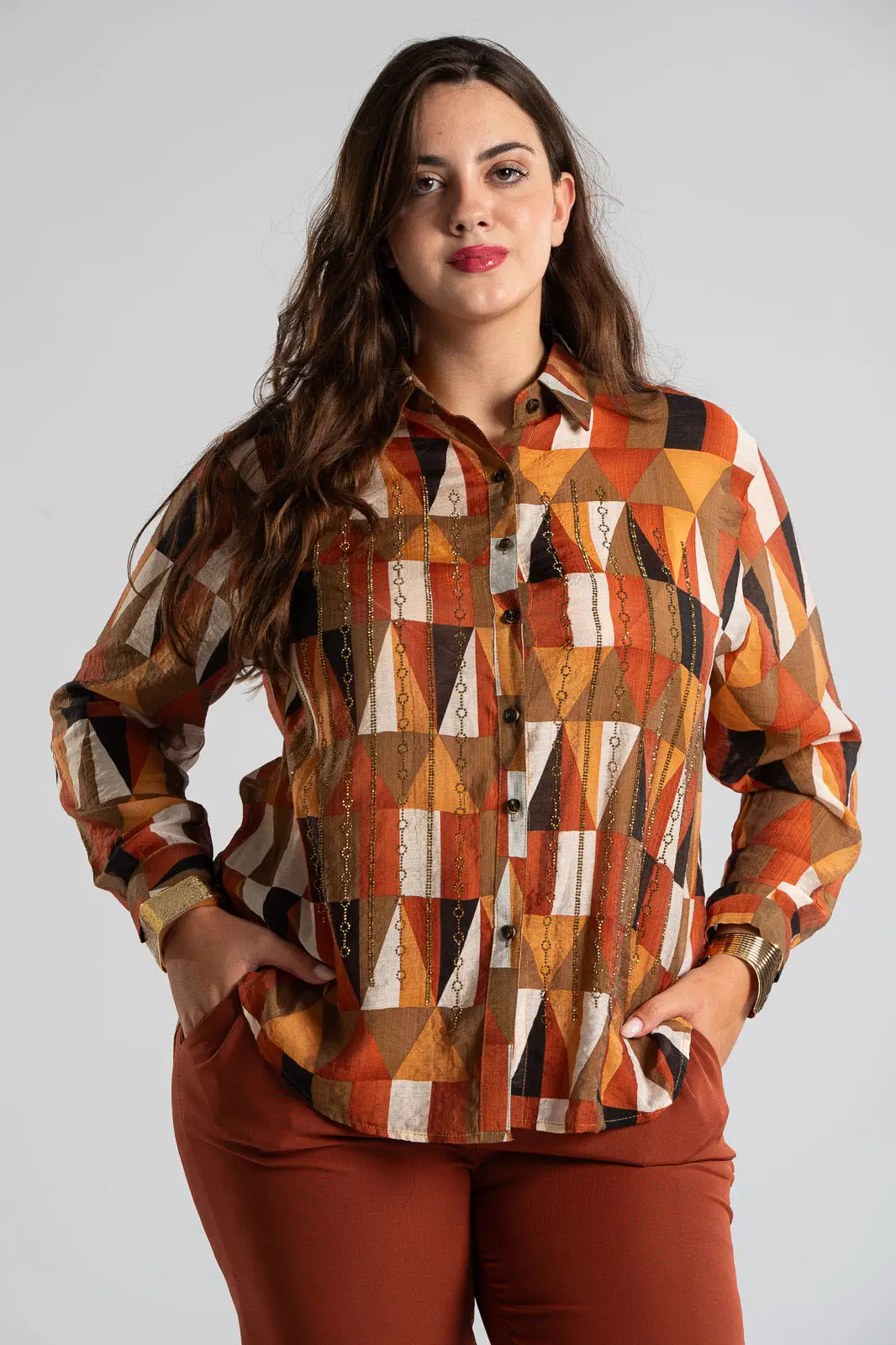 Cotton shirt with collar and buttons. It is an ideal choice for color blocking as it harmoniously combines different colors. It has long sleeves and a straight cut. It features rhinestones on the front and is longer at the back. The measurements in the table are representative for each code. 95% cotton, 5% polyester.