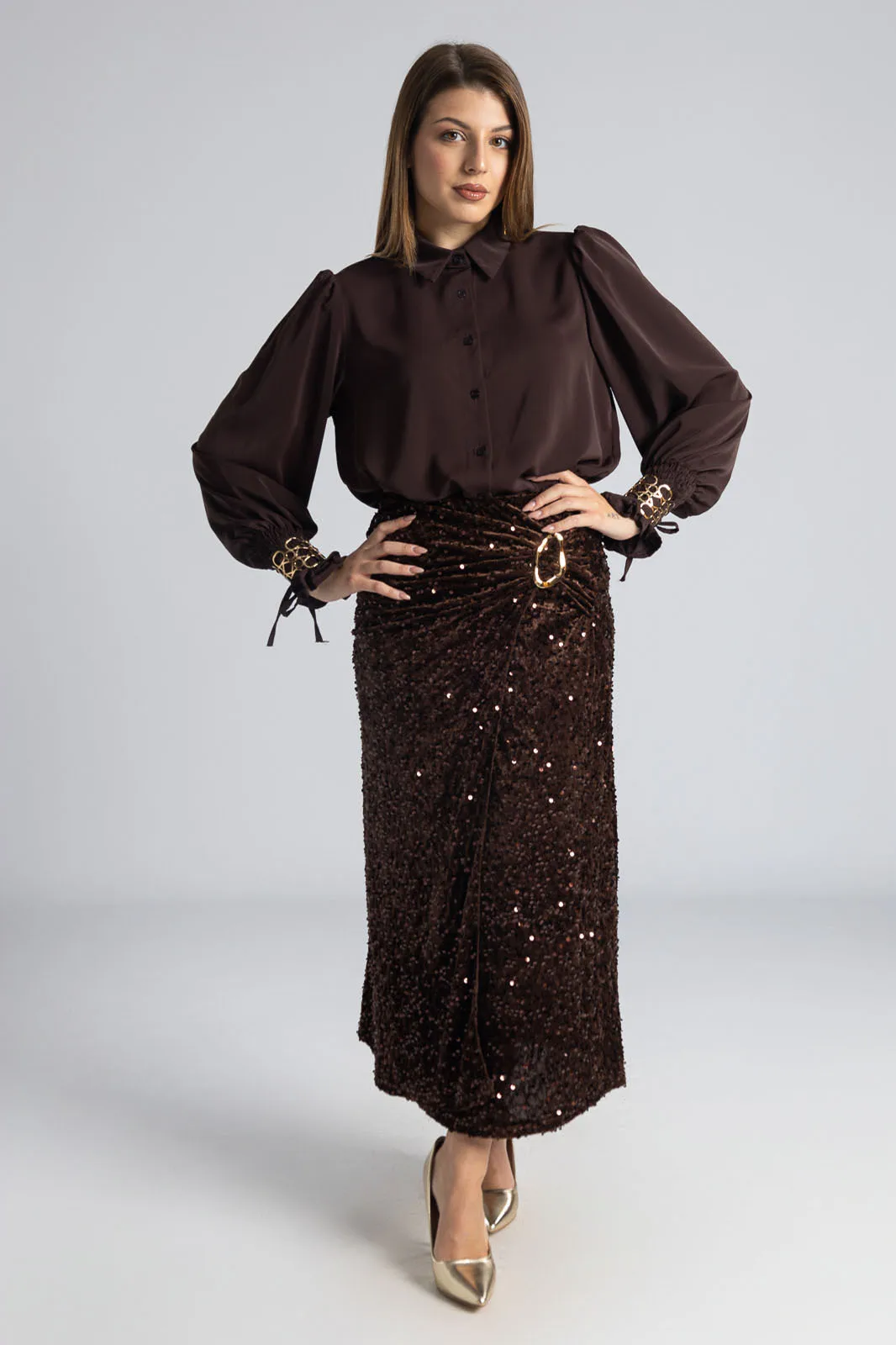 Shirt solid color in a straight line. It has long sleeves and closes with a button. At the end of the sleeves, it has a cuff and a decorative bracelet that ties with cords. The back is slightly longer. The measurements in the table are representative of each product. 100% polyester.