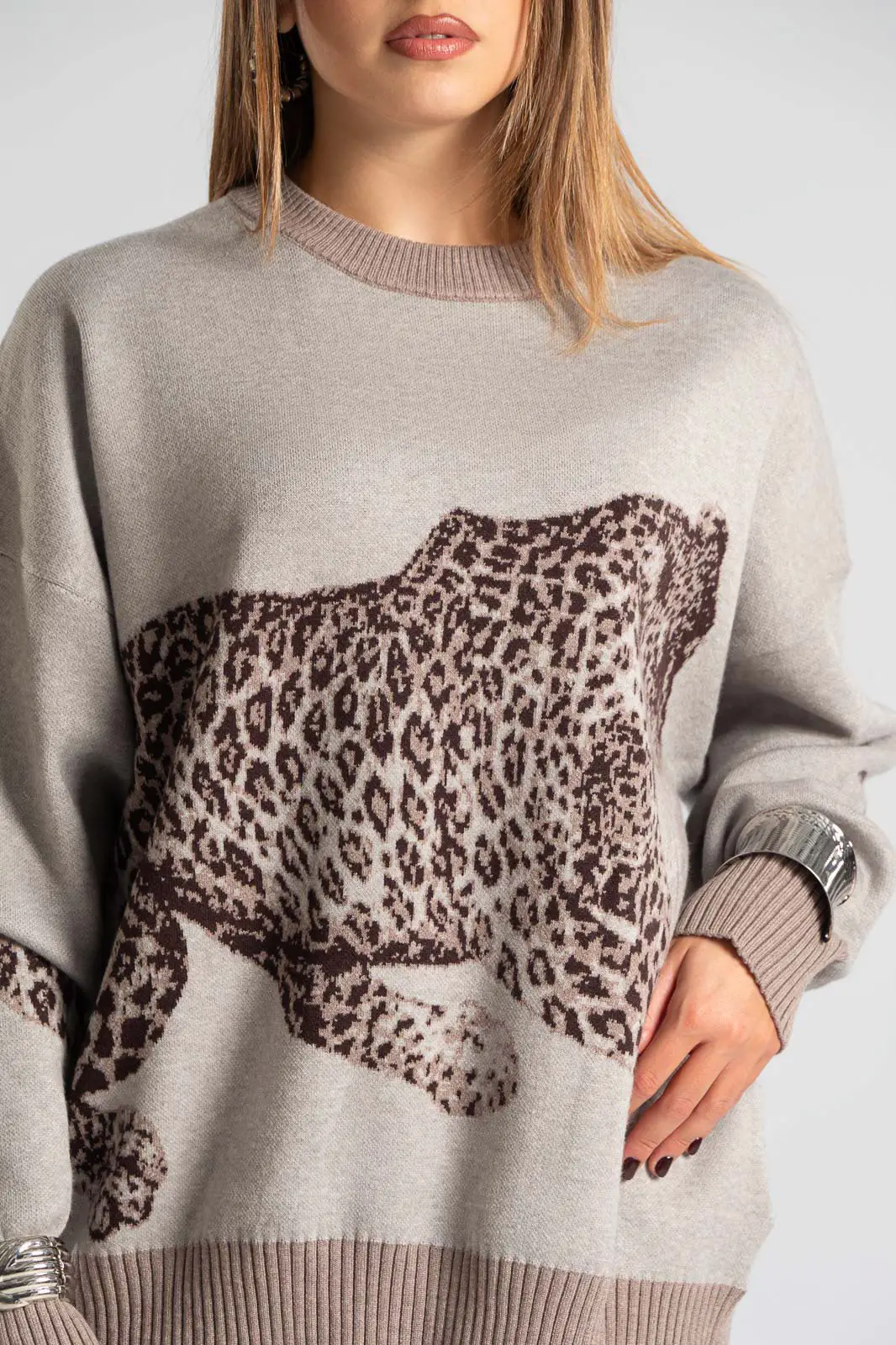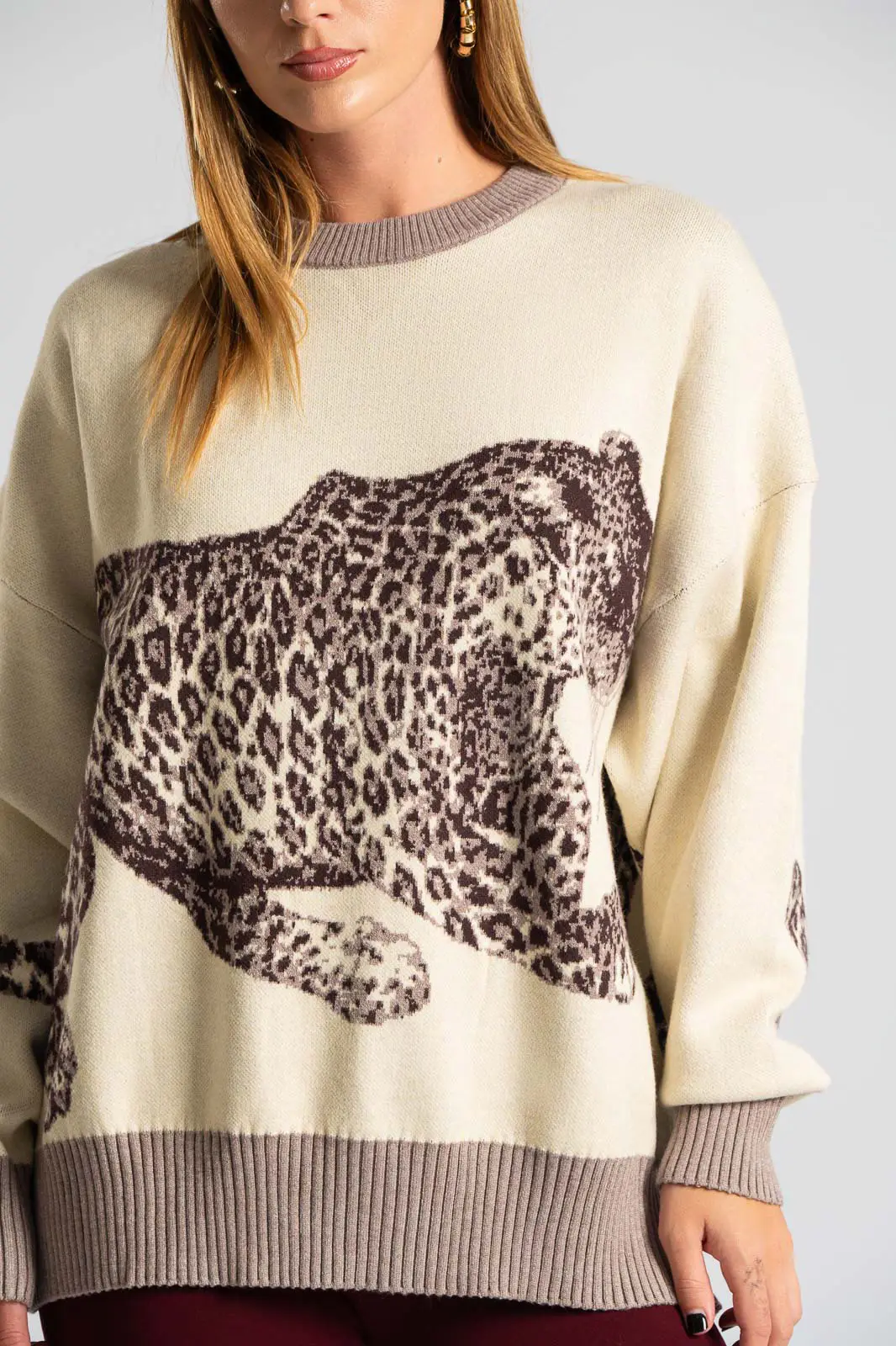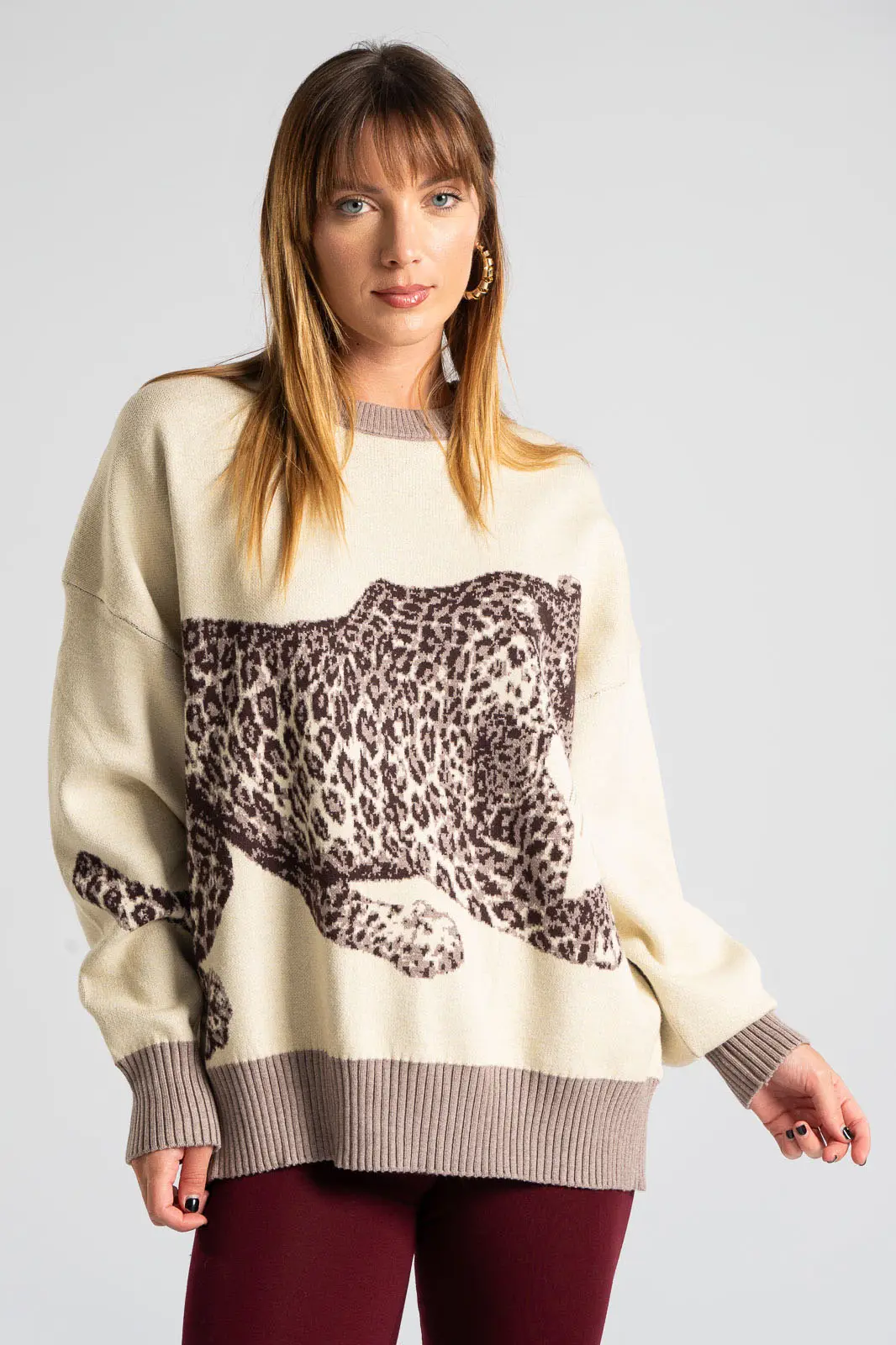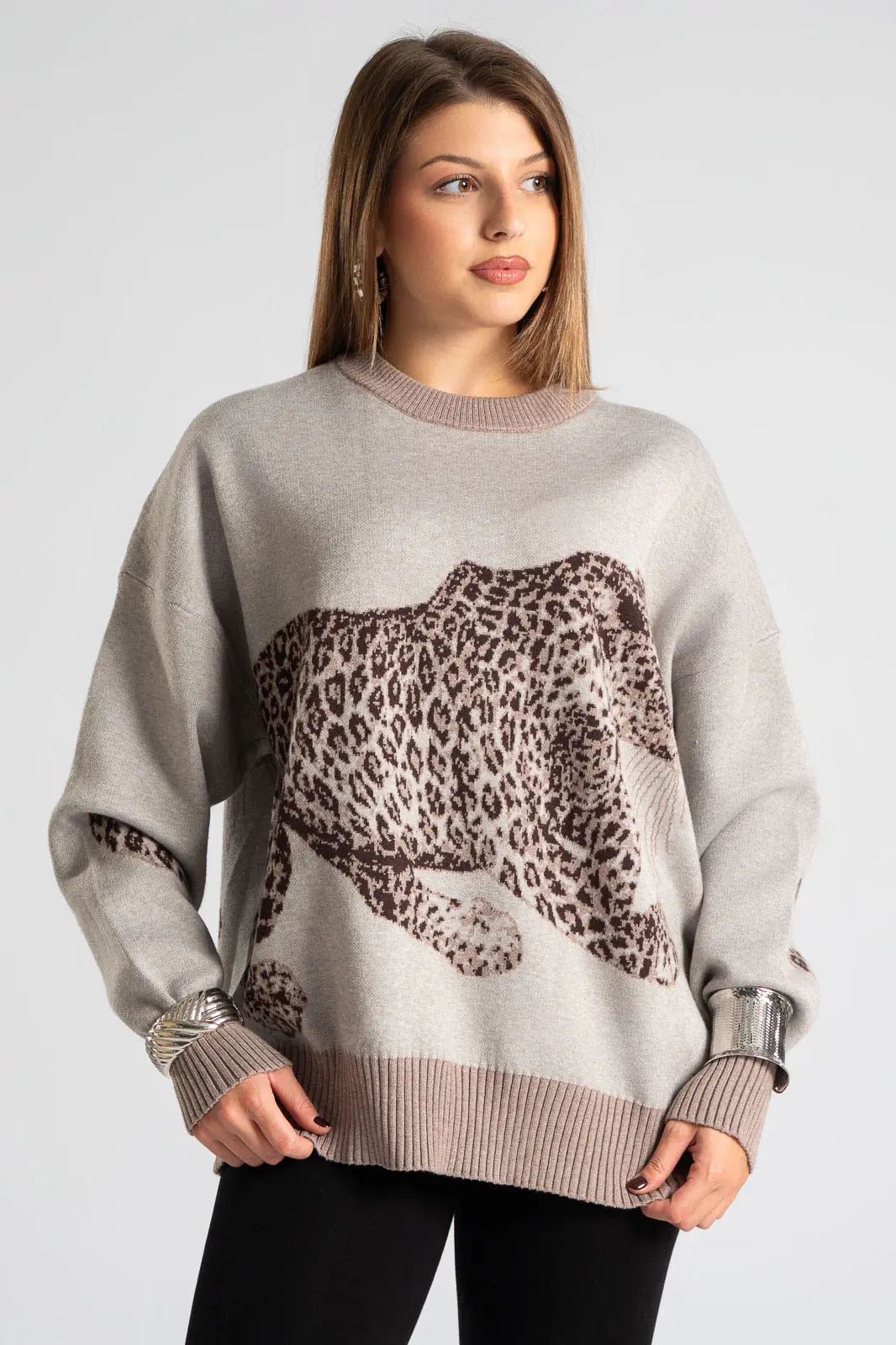 Πουλόβερ με νημάτινη συμπαγή πλέξη. Διαθέτει στρογγυλή λαιμόκοψη και έχει μακριά μανίκια. Στο τελείωμα της, στη λαιμόκοψη και στο τελείωμα των μανικιών διαθέτει rib ύφανση. Διαθέτει σχέδιο jaguar. Οι μετρήσεις του πίνακα είναι αντιπροσωπευτικές για κάθε κωδικό. 65% viscose, 33% polyester, 2% elastan.