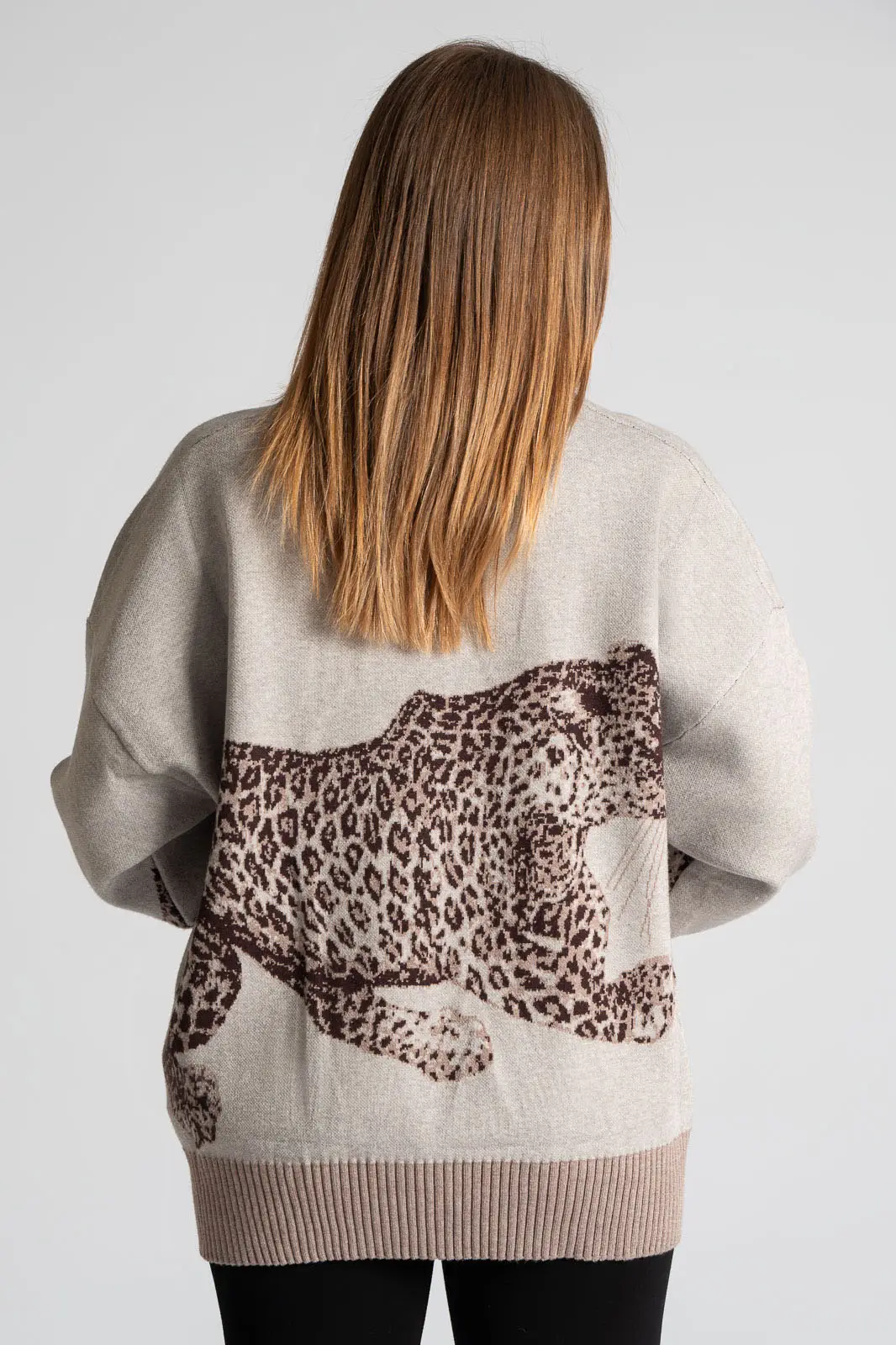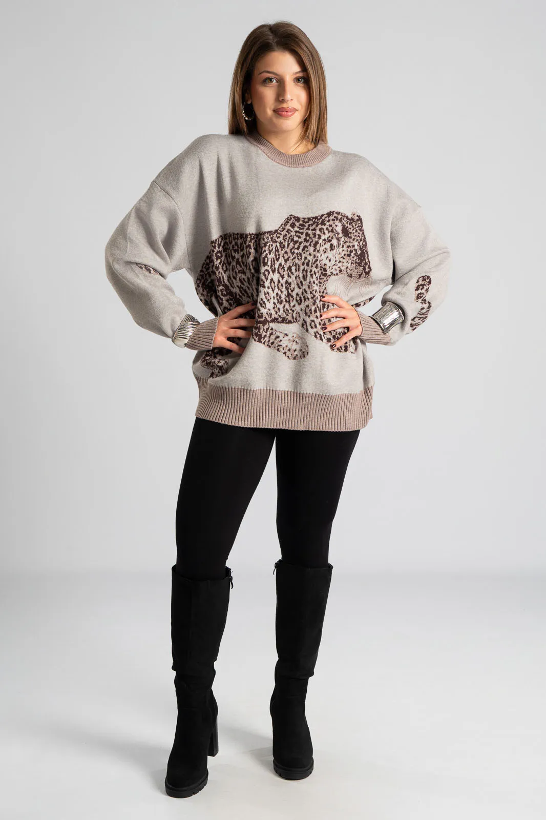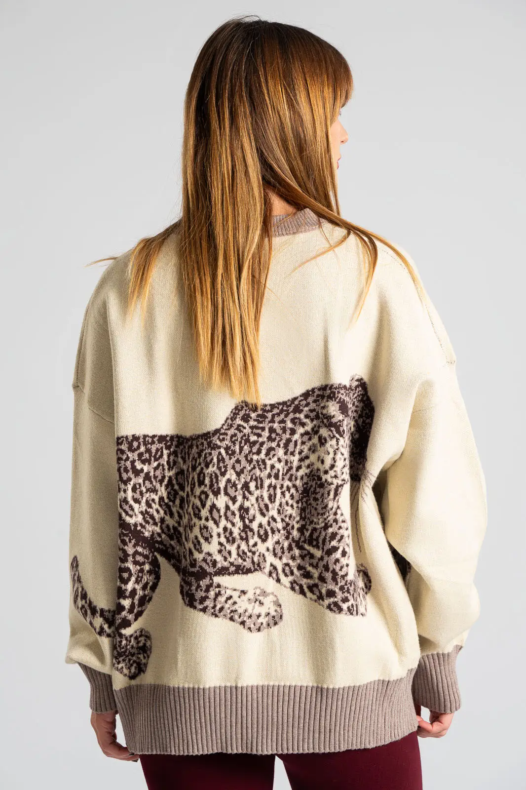 Πουλόβερ με νημάτινη συμπαγή πλέξη. Διαθέτει στρογγυλή λαιμόκοψη και έχει μακριά μανίκια. Στο τελείωμα της, στη λαιμόκοψη και στο τελείωμα των μανικιών διαθέτει rib ύφανση. Διαθέτει σχέδιο jaguar. Οι μετρήσεις του πίνακα είναι αντιπροσωπευτικές για κάθε κωδικό. 65% viscose, 33% polyester, 2% elastan.