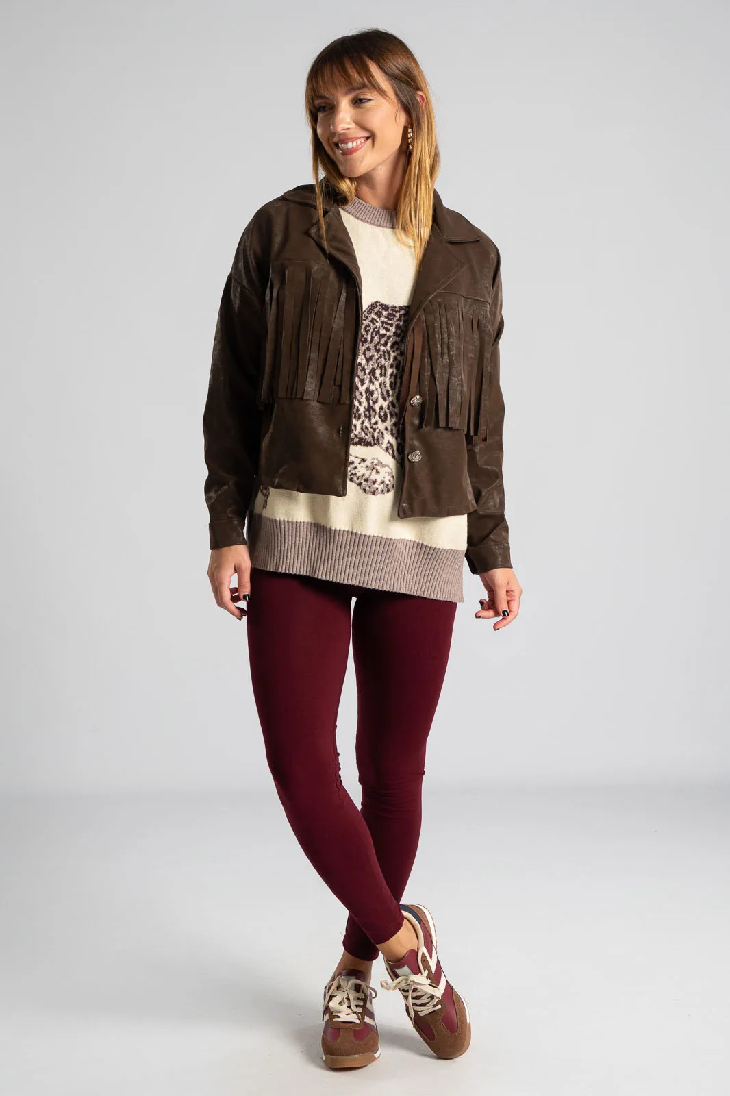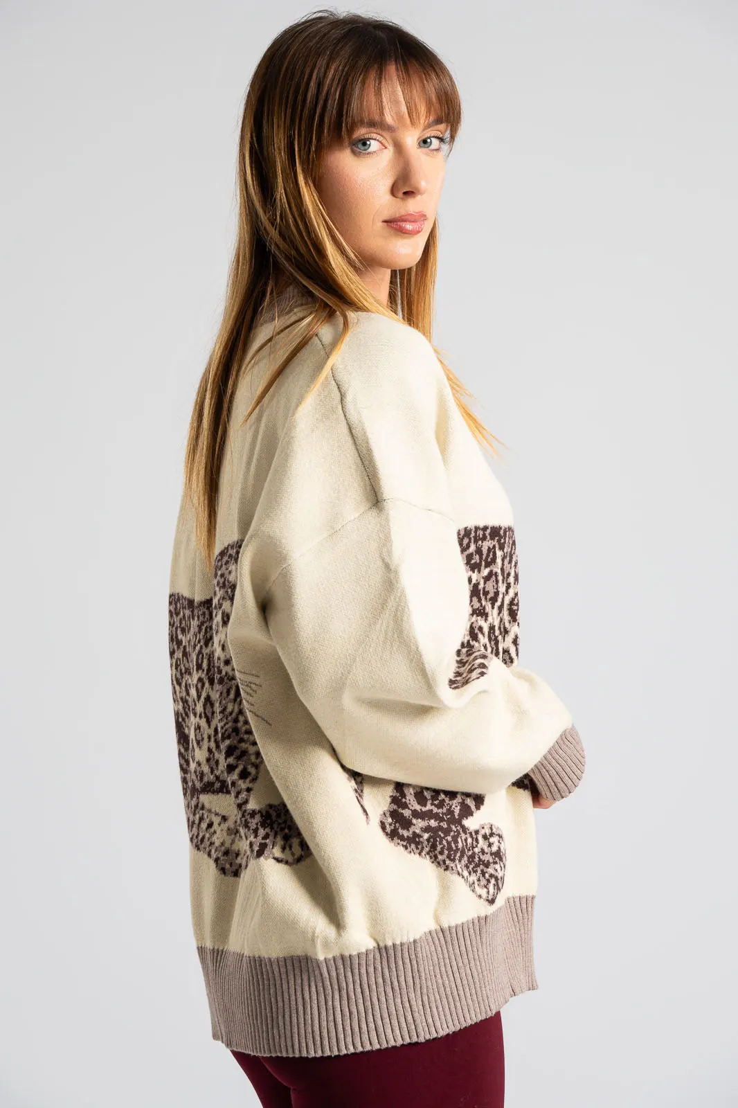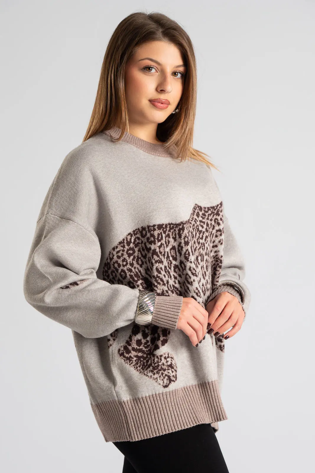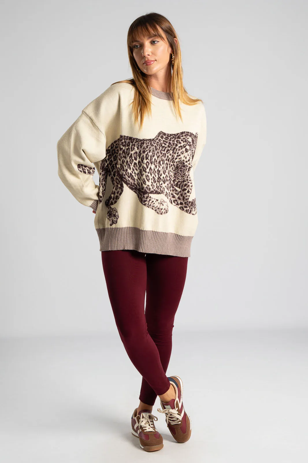 Πουλόβερ με νημάτινη συμπαγή πλέξη. Διαθέτει στρογγυλή λαιμόκοψη και έχει μακριά μανίκια. Στο τελείωμα της, στη λαιμόκοψη και στο τελείωμα των μανικιών διαθέτει rib ύφανση. Διαθέτει σχέδιο jaguar. Οι μετρήσεις του πίνακα είναι αντιπροσωπευτικές για κάθε κωδικό. 65% viscose, 33% polyester, 2% elastan.